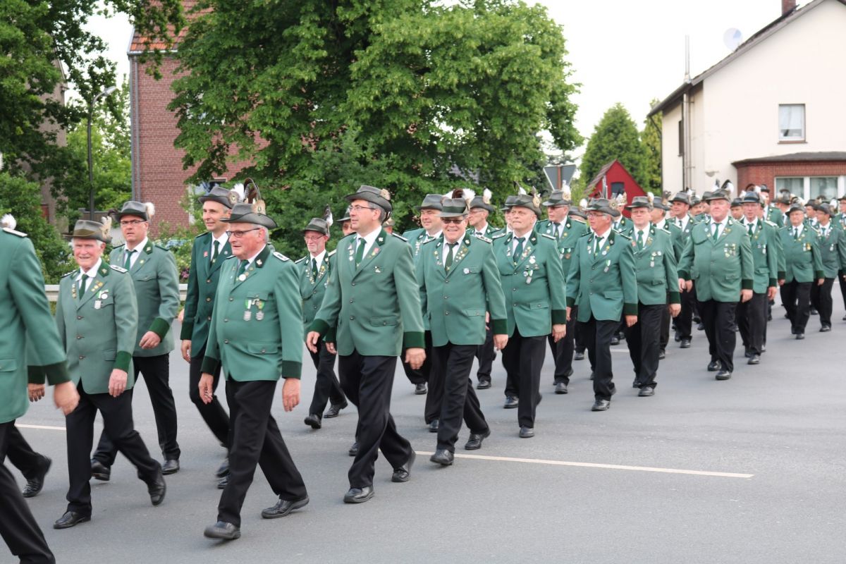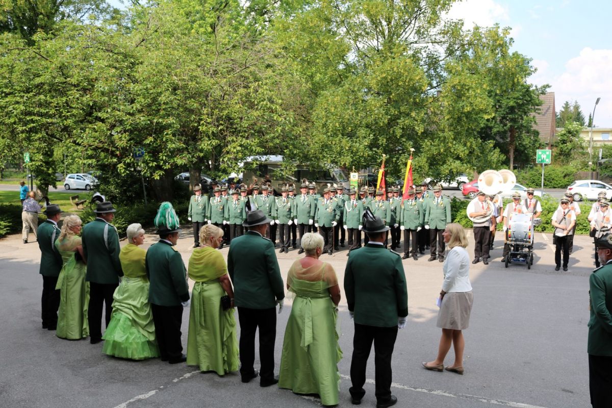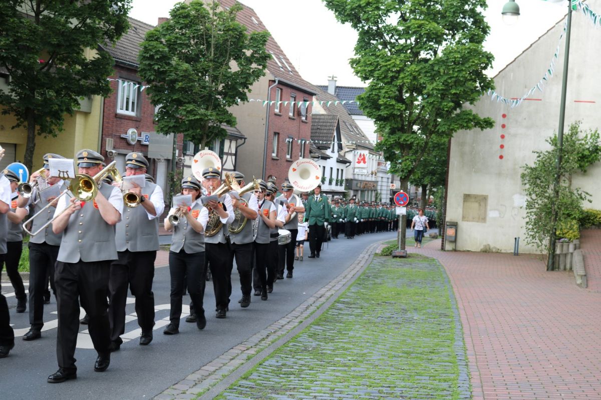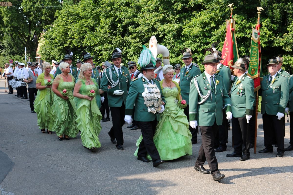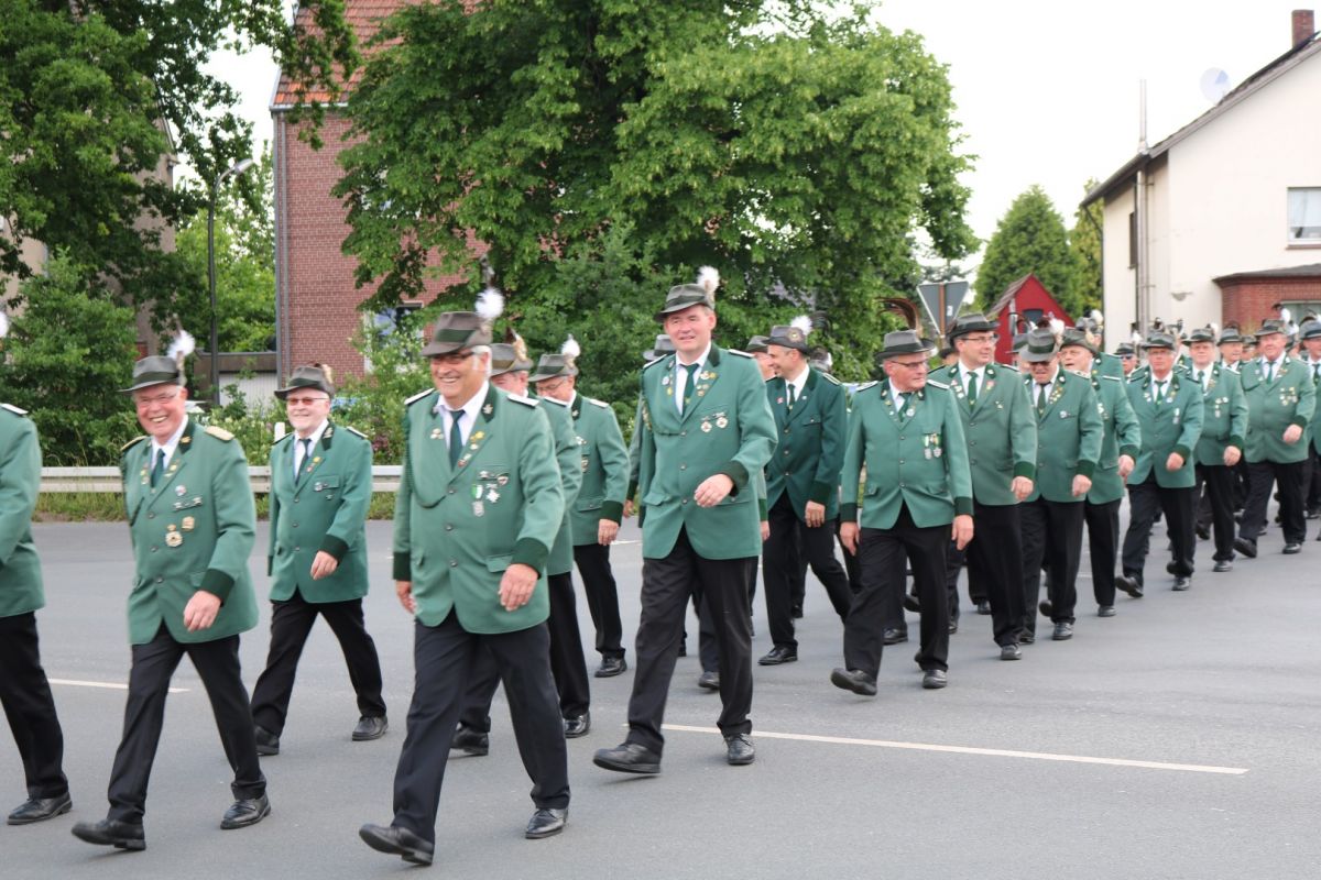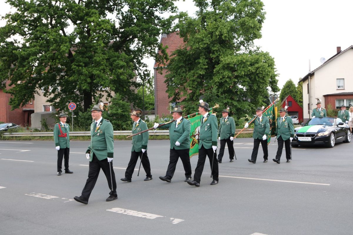 Der offizielle Beginn erfolgte für das Königspaar, den Bataillonsvorstand und die Fahne gegen 16:30 Uhr am Rathaus. Zusammen mit Bürgermeisterin Nicole Moenikes wurden dort sowohl die Heimatklänge Waltrop, als auch die Elmenhorster Blaskapelle empfangen. Nach kurzem Aufenthalt und einer Erfrischung für den bevorstehenden Umzug folgte ein Marsch durch die Stadt, damit die jeweiligen Kompanien sich in korrekter Reihenfolge in den Zug einreihen konnten, um anschließend zum Stutenteich zu marschieren.