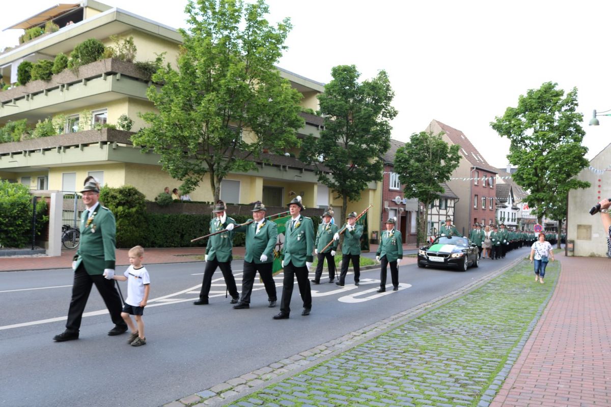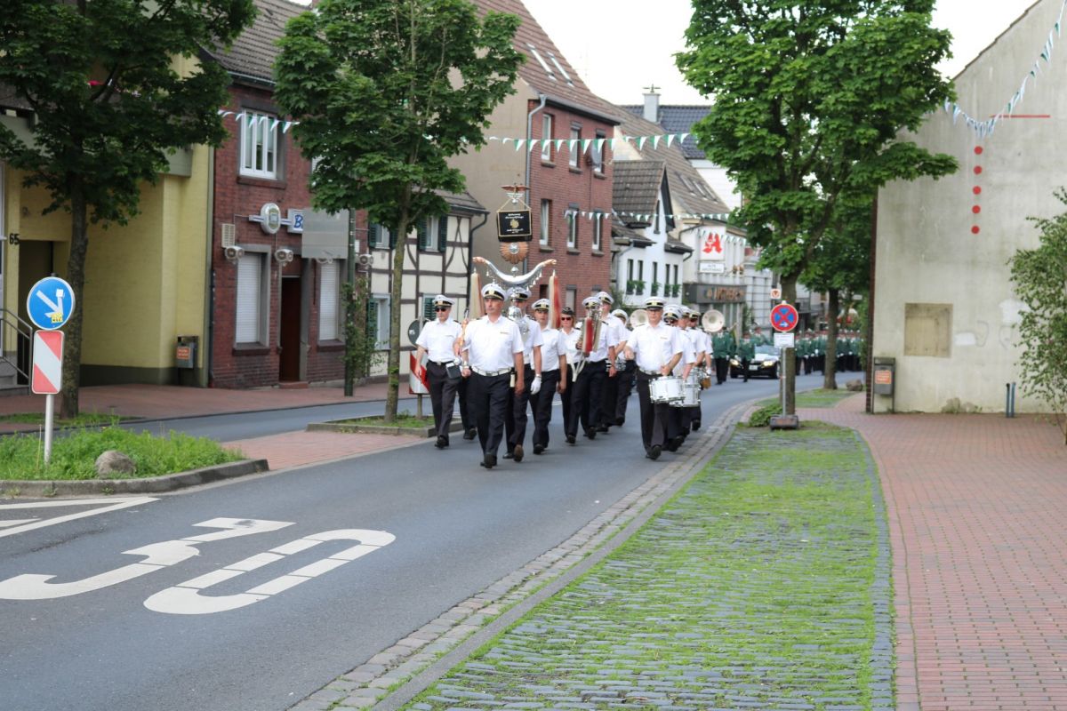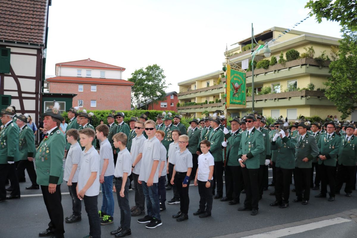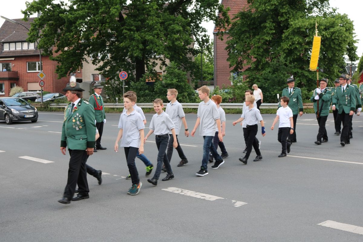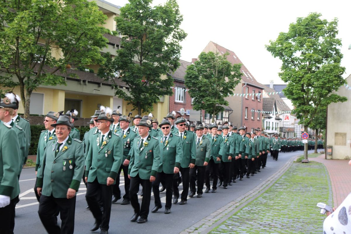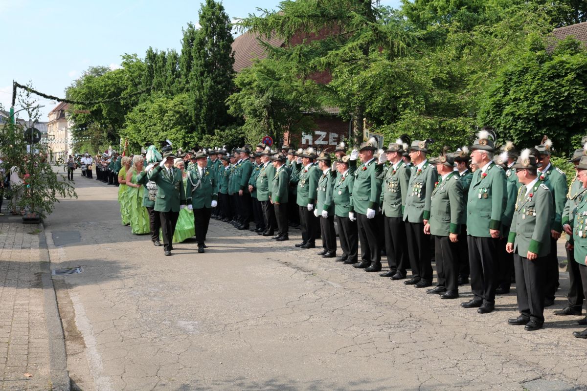 Der offizielle Beginn erfolgte für das Königspaar, den Bataillonsvorstand und die Fahne gegen 16:30 Uhr am Rathaus. Zusammen mit Bürgermeisterin Nicole Moenikes wurden dort sowohl die Heimatklänge Waltrop, als auch die Elmenhorster Blaskapelle empfangen. Nach kurzem Aufenthalt und einer Erfrischung für den bevorstehenden Umzug folgte ein Marsch durch die Stadt, damit die jeweiligen Kompanien sich in korrekter Reihenfolge in den Zug einreihen konnten, um anschließend zum Stutenteich zu marschieren.