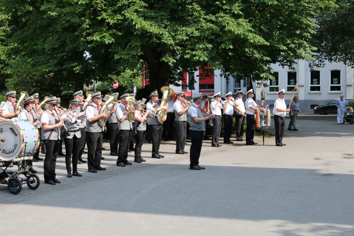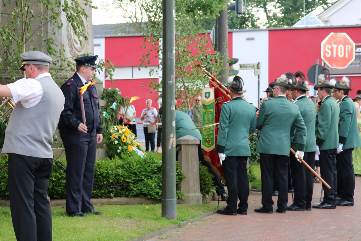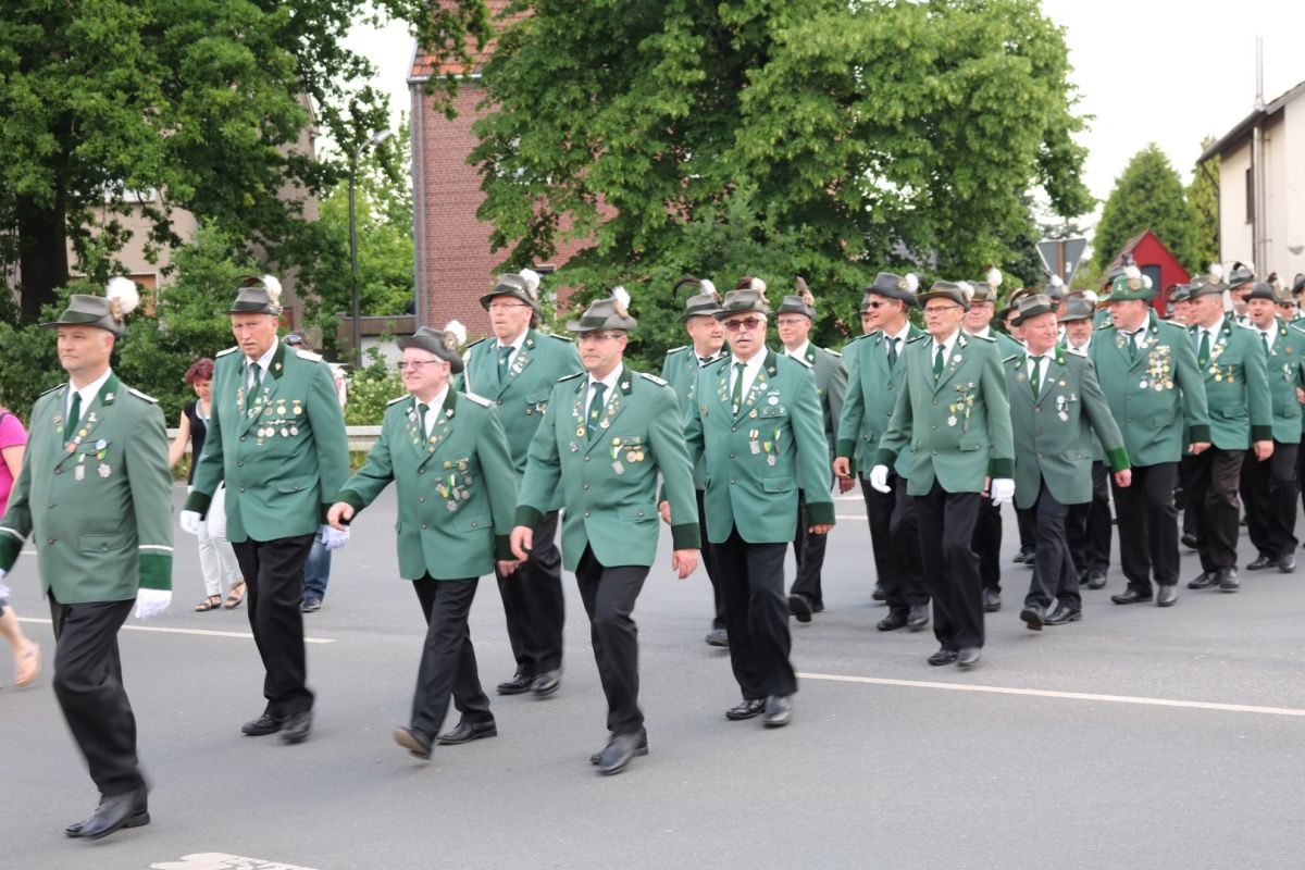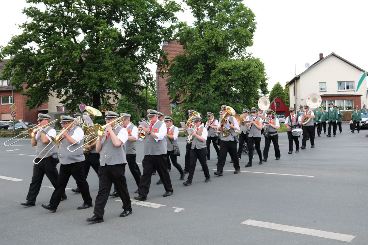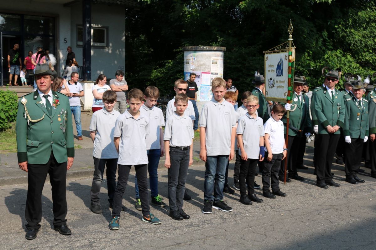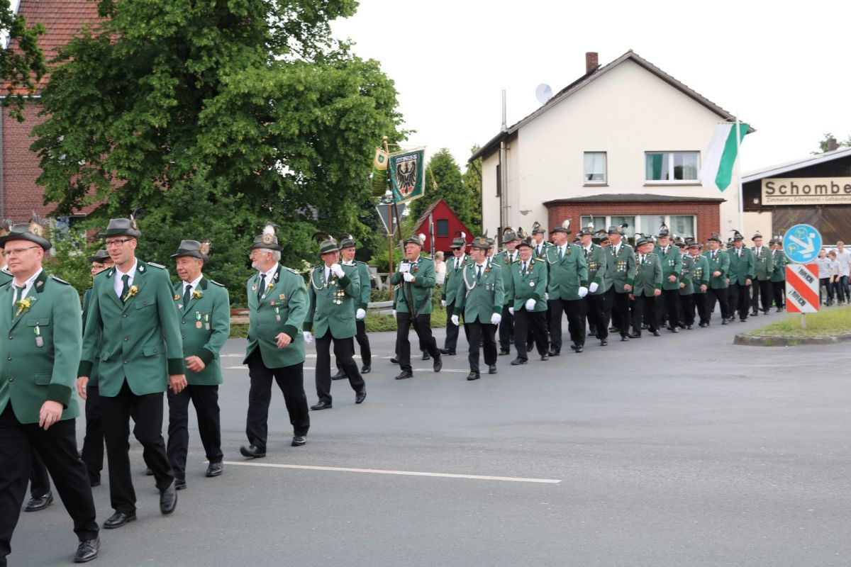 Der offizielle Beginn erfolgte für das Königspaar, den Bataillonsvorstand und die Fahne gegen 16:30 Uhr am Rathaus. Zusammen mit Bürgermeisterin Nicole Moenikes wurden dort sowohl die Heimatklänge Waltrop, als auch die Elmenhorster Blaskapelle empfangen. Nach kurzem Aufenthalt und einer Erfrischung für den bevorstehenden Umzug folgte ein Marsch durch die Stadt, damit die jeweiligen Kompanien sich in korrekter Reihenfolge in den Zug einreihen konnten, um anschließend zum Stutenteich zu marschieren.