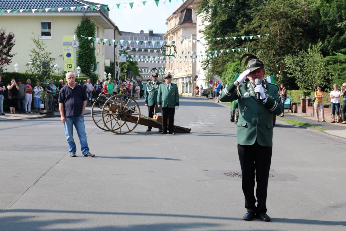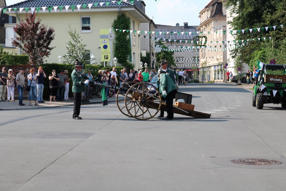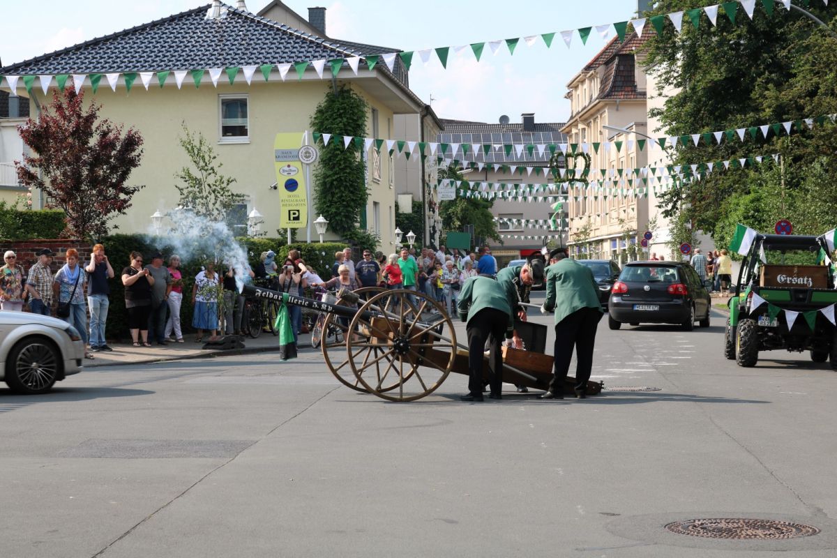 Spieß der Fünften Gerd Wolinksi ließ die Feldartillerie bereitmachen, um das Schützenfest 2016 mit den üblichen drei Böllerschüssen zu eröffnen. 2. Vorsitzender Dr. Hermann Geldmann besuchte bereits am Vortag die Asylunterkunft am Stutenteich, um den dortigen Flüchtlingen die Hintergründe der Böllerschüsse zu erklären.