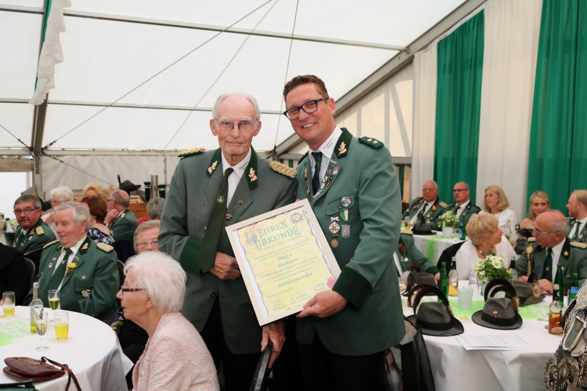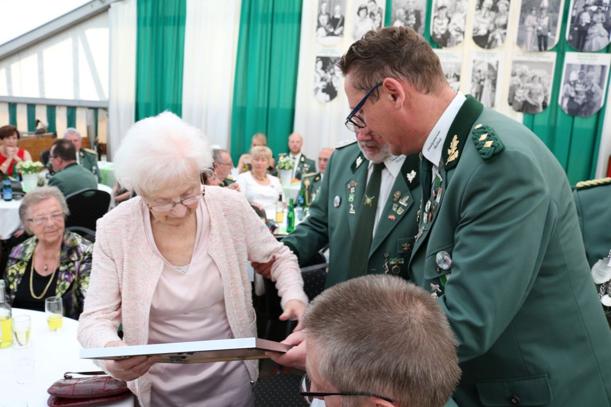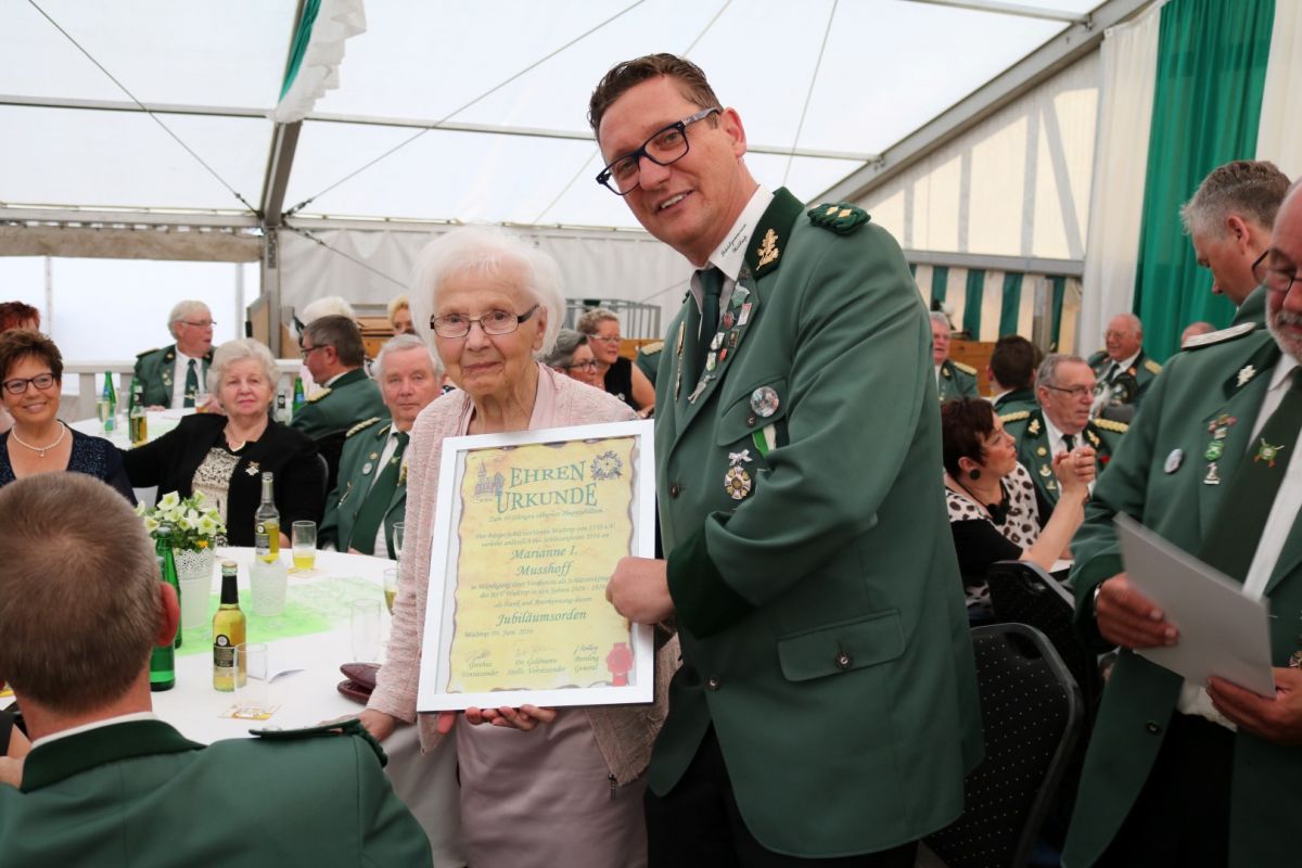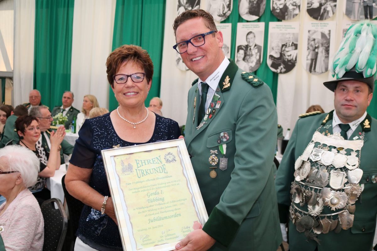 Nach Begrüßung durch den Vorsitzenden Ludger Grothus standen zunächst noch einige Ehrungen auf dem Programm. So konnte Marianne I. Musshoff, Königin von 1976 – 1978, 40-jähriges Thronjubiläum feiern. Aus den Händen von Ludger gab es eine Urkunde, Königin Britta überreichte den Jubiläumsorden. Max I. Burbaum, König von 1991 – 1993, kann auf 25 Jahre Thron zurückblicken und auch Gerda I. Tübbing bekam den Jubiläumsorden samt Urkunde für 25 Jahre Thronjubiläum überreicht.