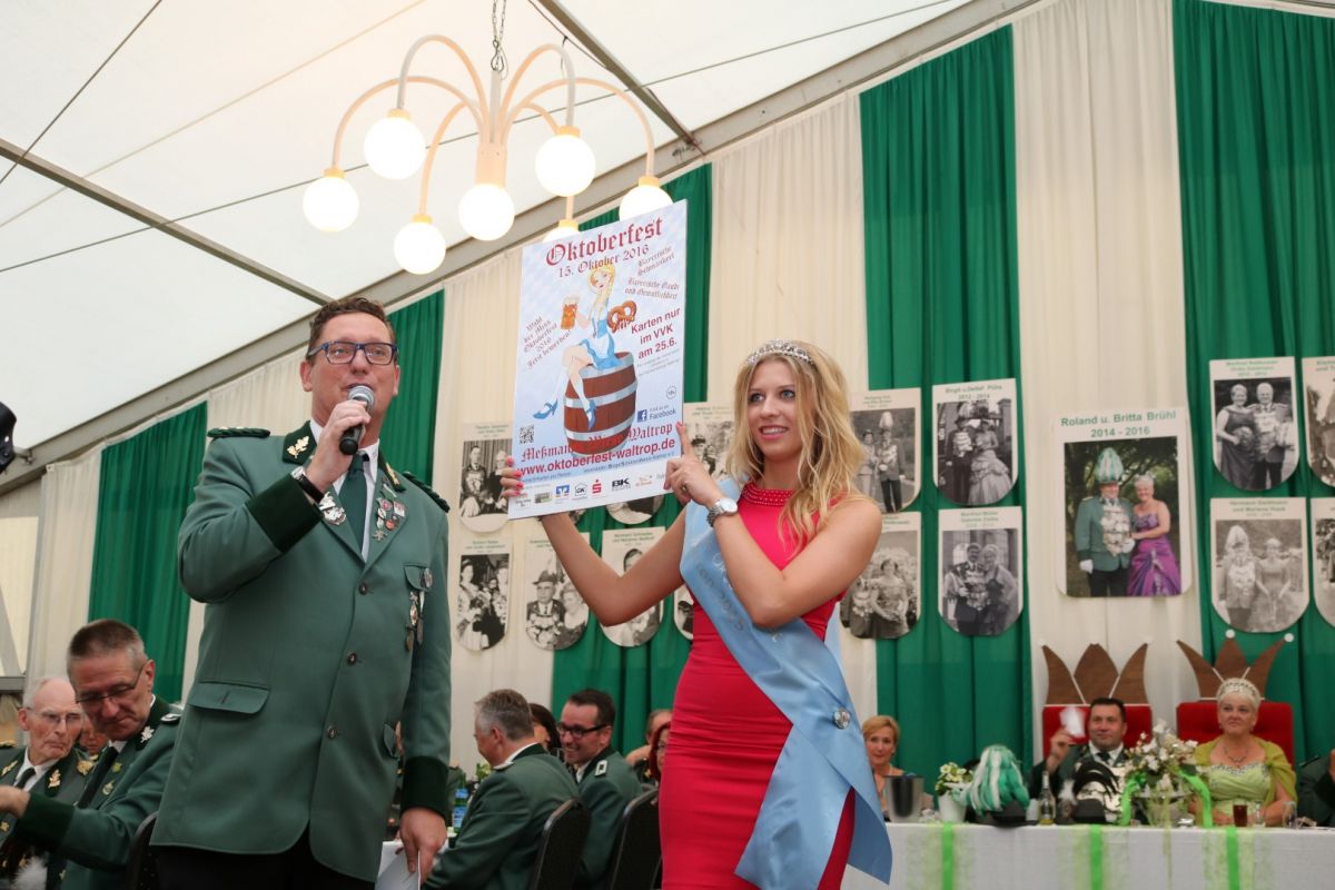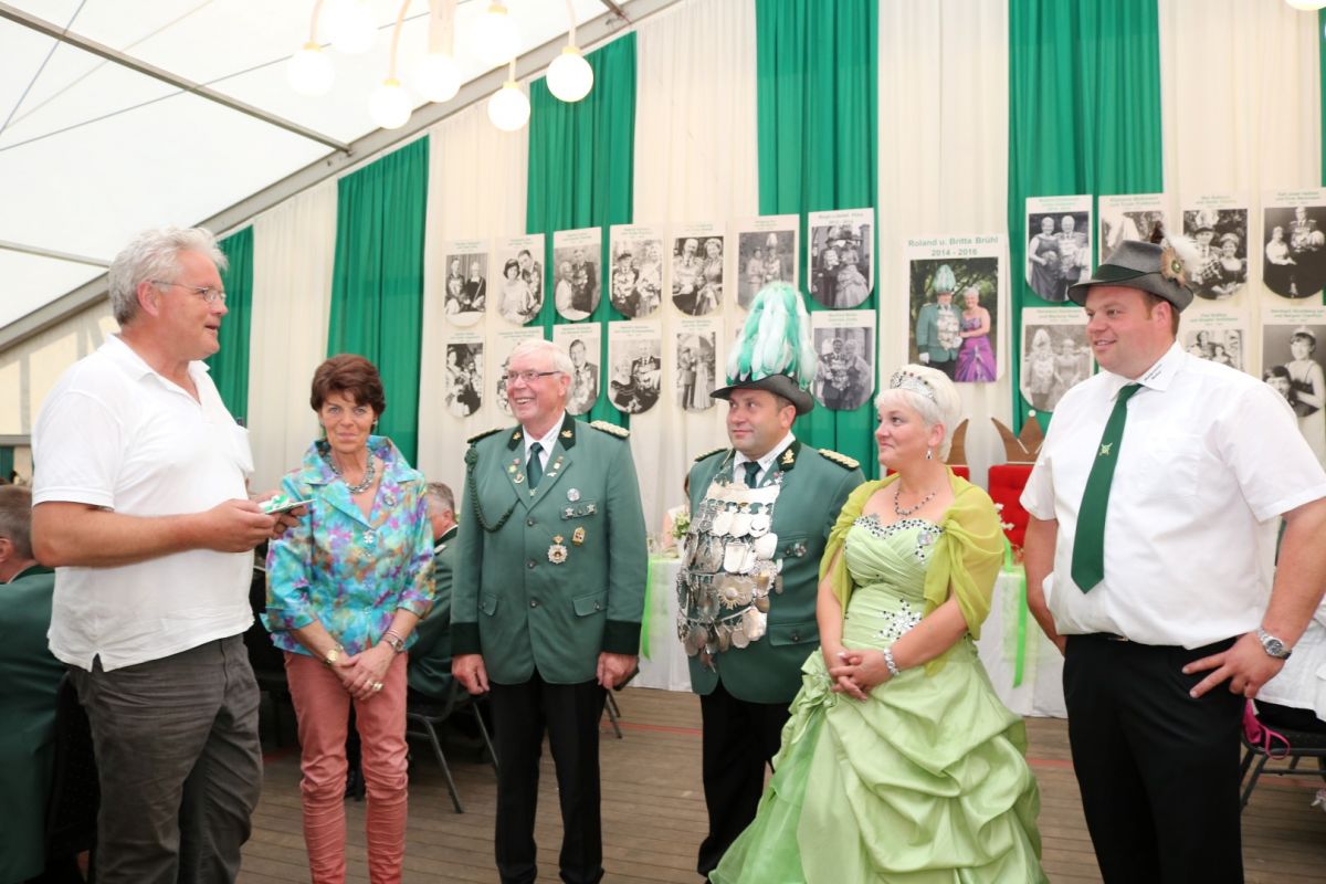 Im Anschluss wurde die Familie Meßmann nach vorne auf den Thron gebeten. Auf dem Grundstück der Familie Meßmann findet nicht nur seit vielen Jahren das Vogelschießen statt, sondern bedingt durch den Stadthallenumbau stand auch in diesem Jahr erstmals das große Festzelt auf einer Wiese des Hofes Meßmann. Dafür gab es eine besondere Ehrung in Form von einem Gutschein für ein Wochenende in Warstein inkl. Brauereibesichtigung und Ballonfahrt über das Sauerland.