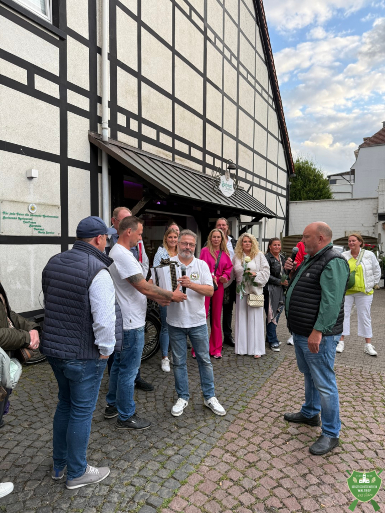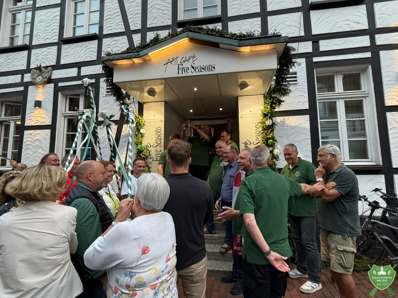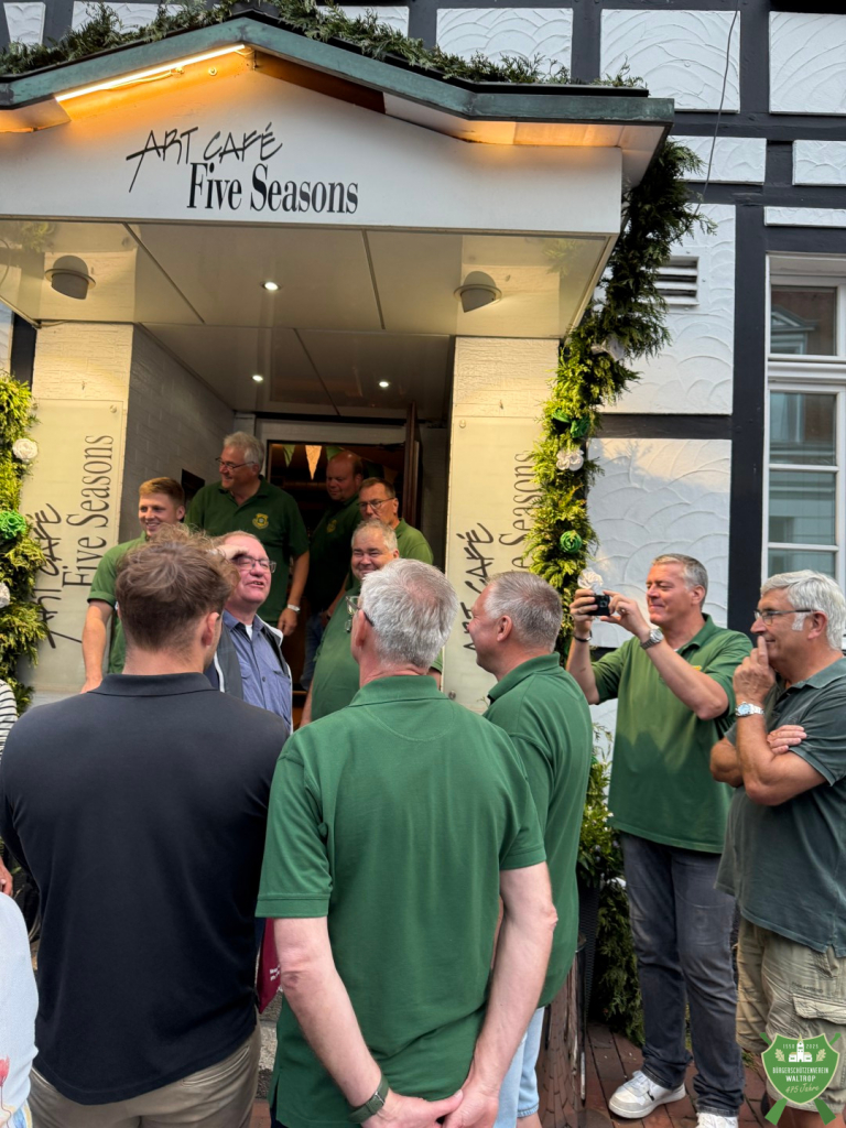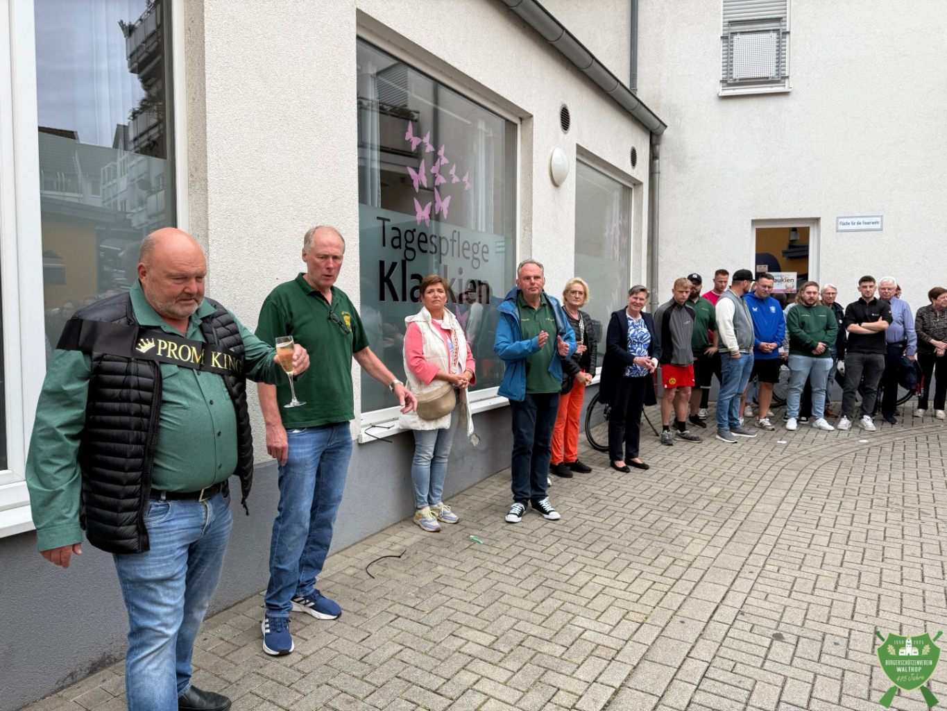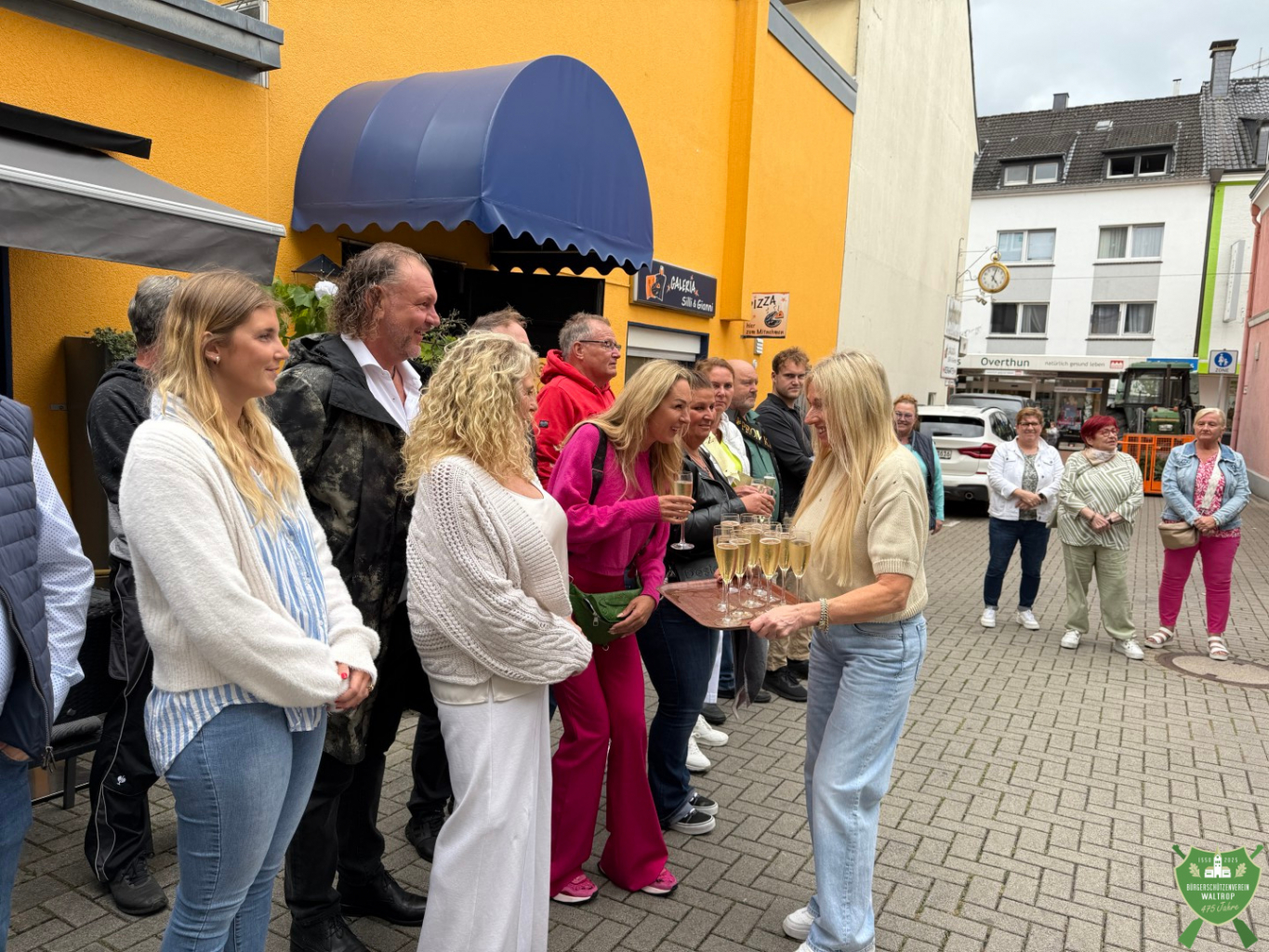 Besucht wurde zunächst die 5. Kompanie mit Hauptmann Thomas Finke. Nach einem kurzen Fußmarsch war die Galeria von Silli und Gianni als erstes Ziel erreicht. Wie bereits beim Kränzen hatte sich wieder ein Spalier aus Schützen samt Damen gebildet, um die ankommende Truppe zu begrüßen und natürlich besonders dem Königspaar Thomas und Rita Glückwünsche auszurichten.