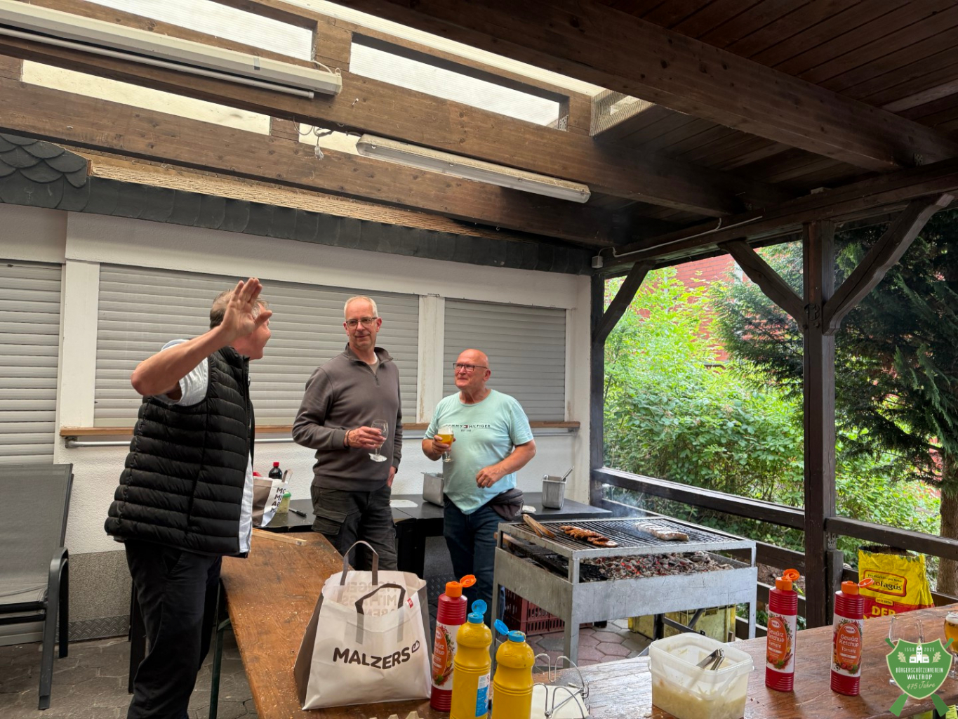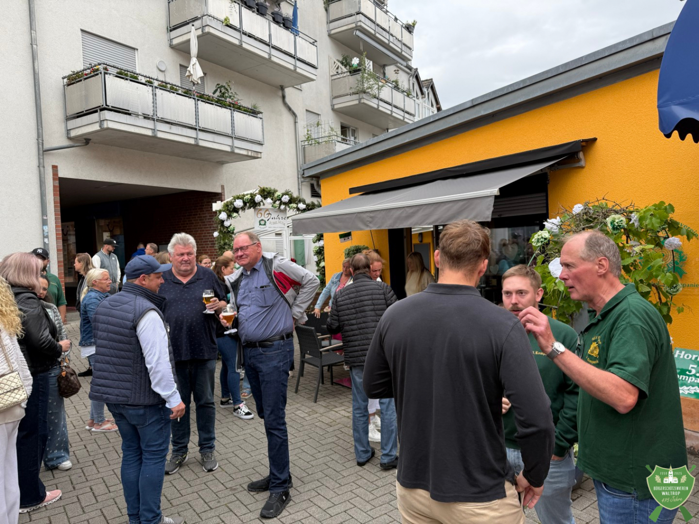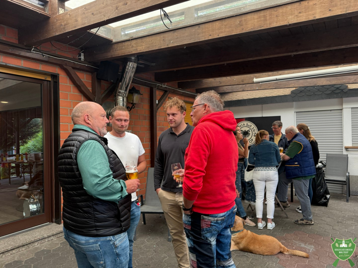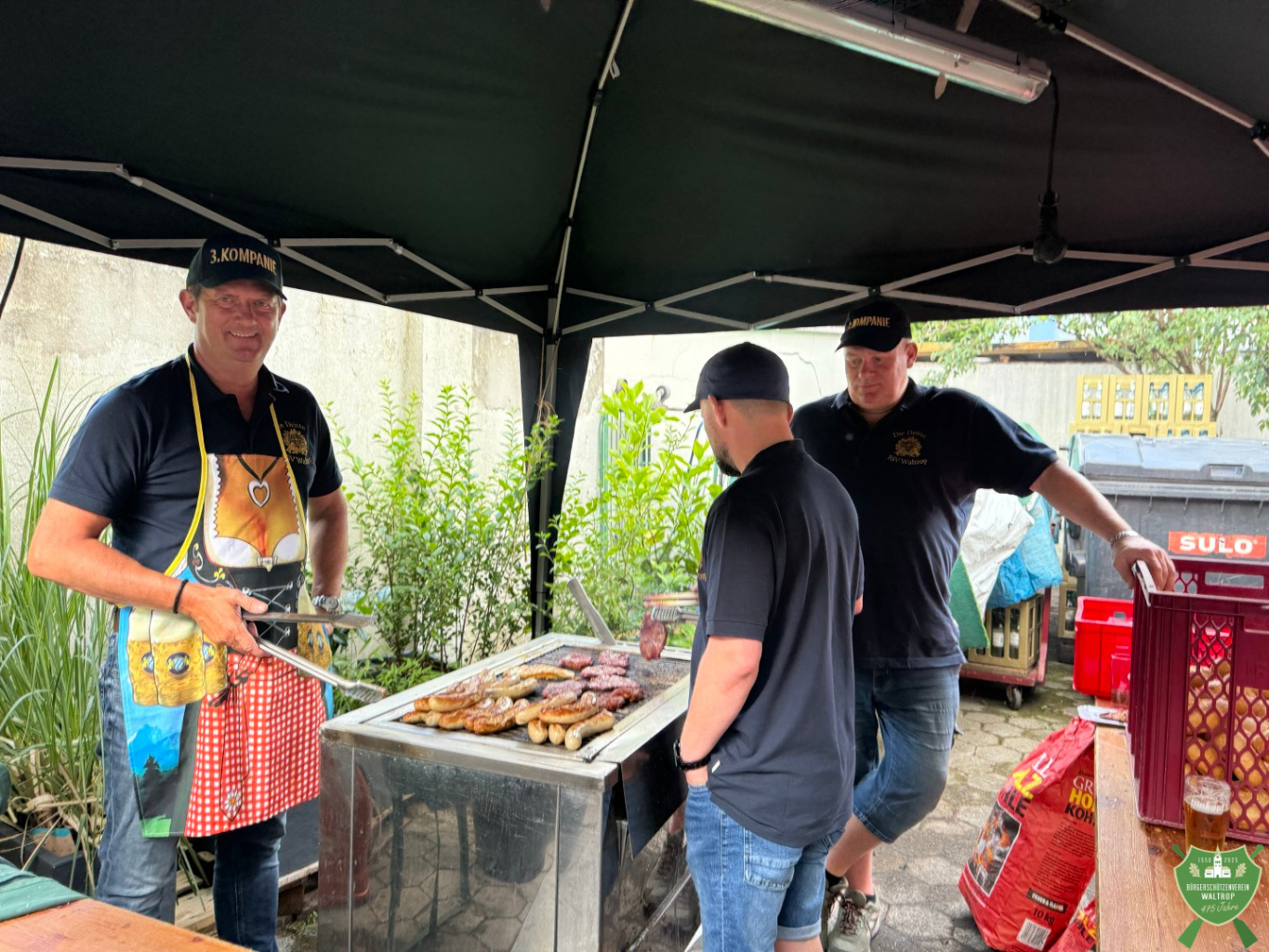 Auch hier warteten viele Schützen zur Begrüßung des ankommenden Trupps. Die Rede von Hauptmann Christoph Rademacher fiel allerdings zunächst etwas kürzer aus, da leider zeitgleich ein Regenschauer einsetzte und es alle vorzogen, unter die trockene Überdachung der Terrasse zu flüchten. Bei kühlen Getränken und Gegrilltem ließ es sich hier aber auch durchaus gut aushalten. Die restlichen Worte wurden dann bei der Verabschiedung nachgeholt, als es wieder an der Zeit war die nächste Kompanie anzusteuern. Glücklicherweise hatte auch der Regen bis dahin nachgelassen.