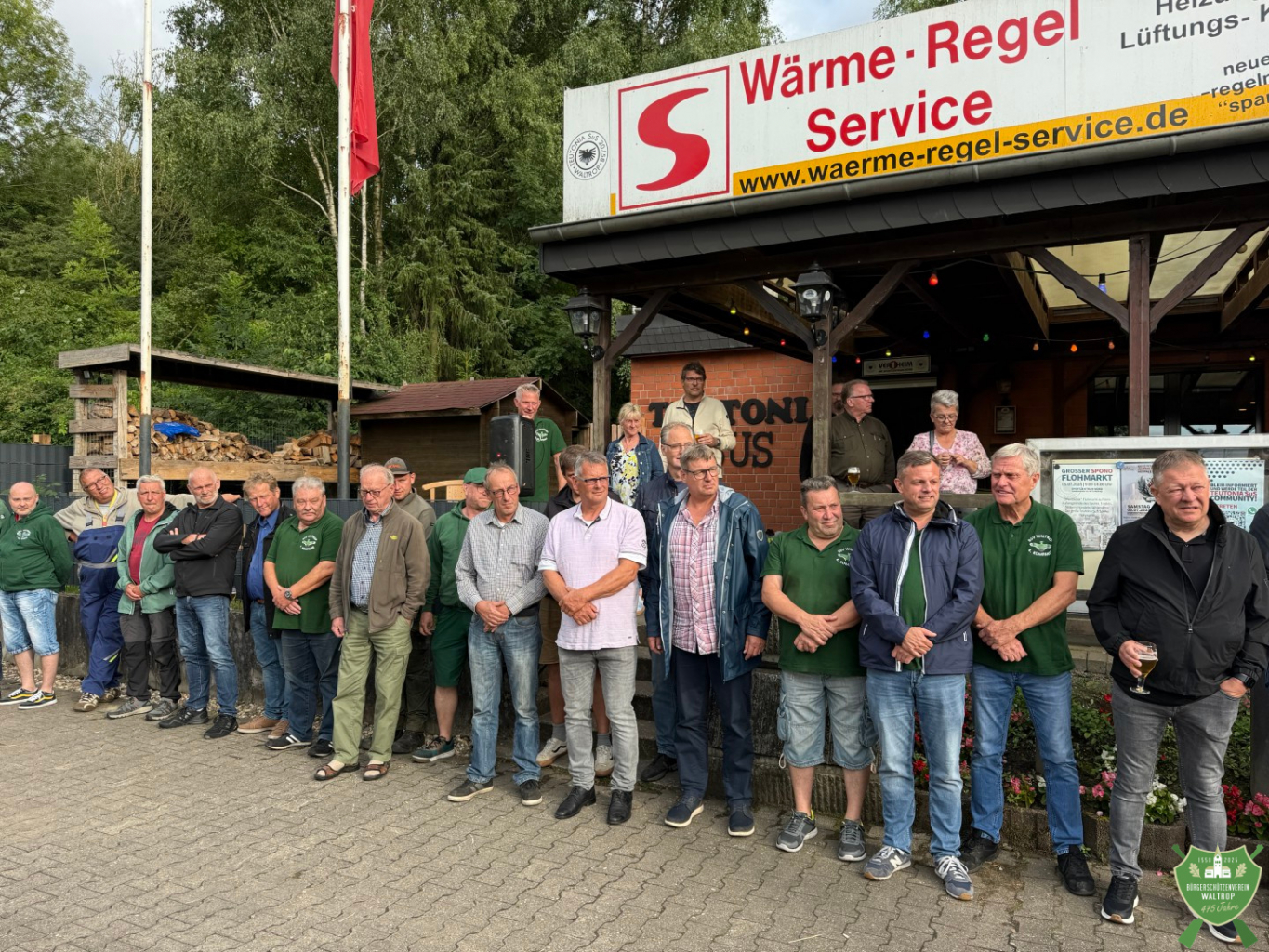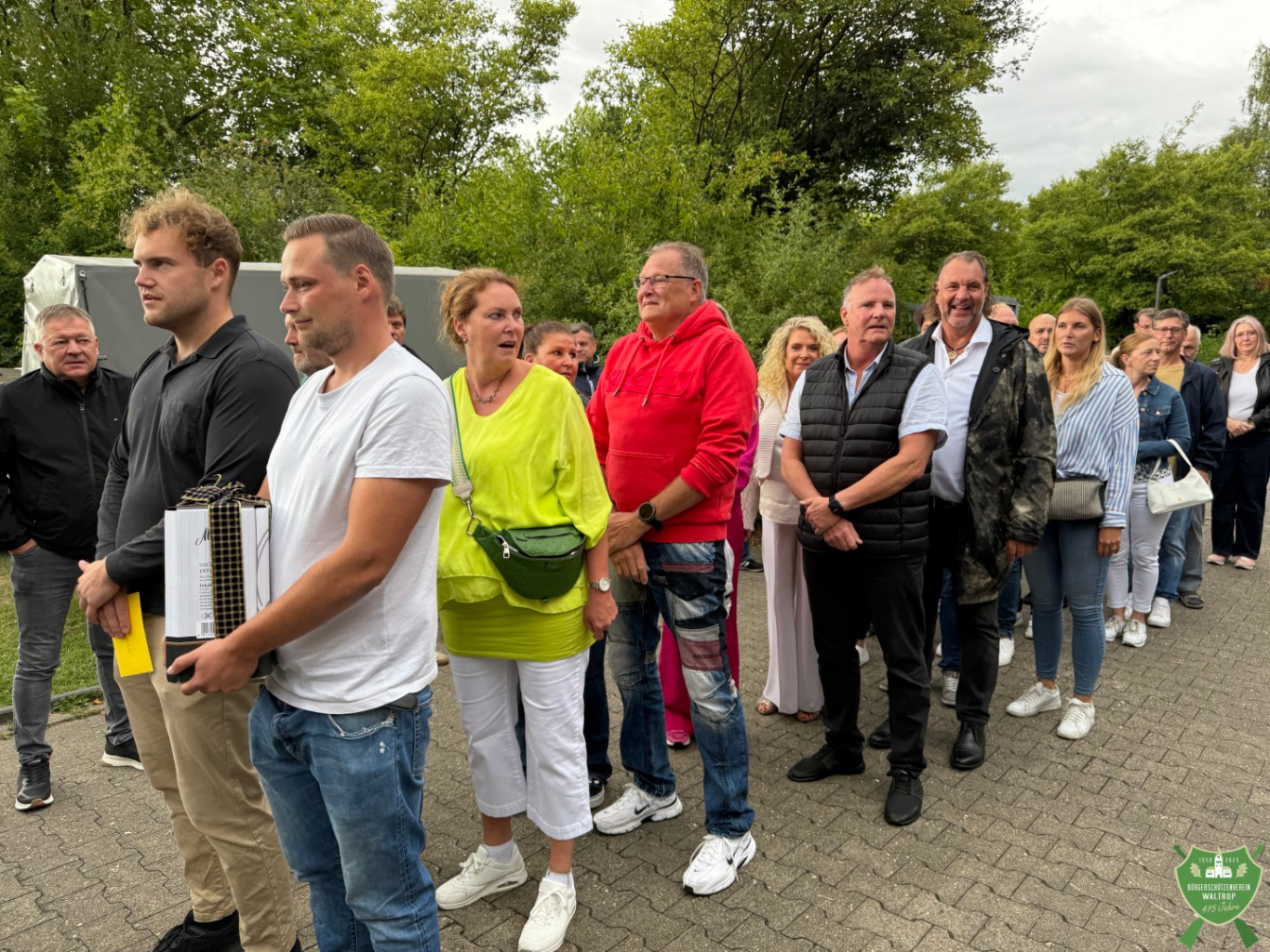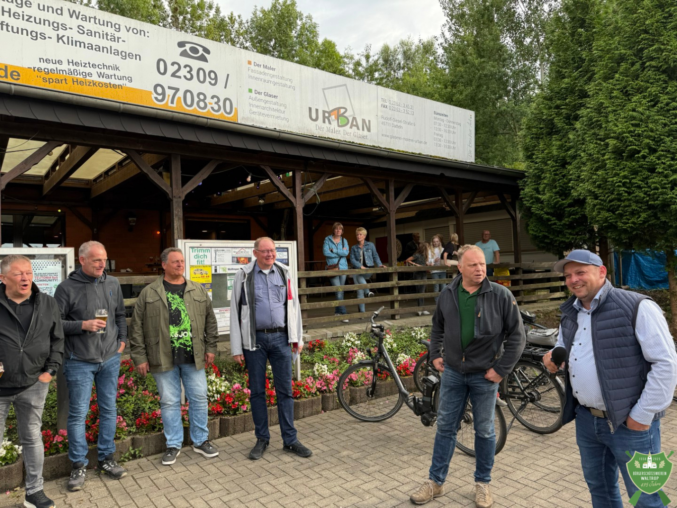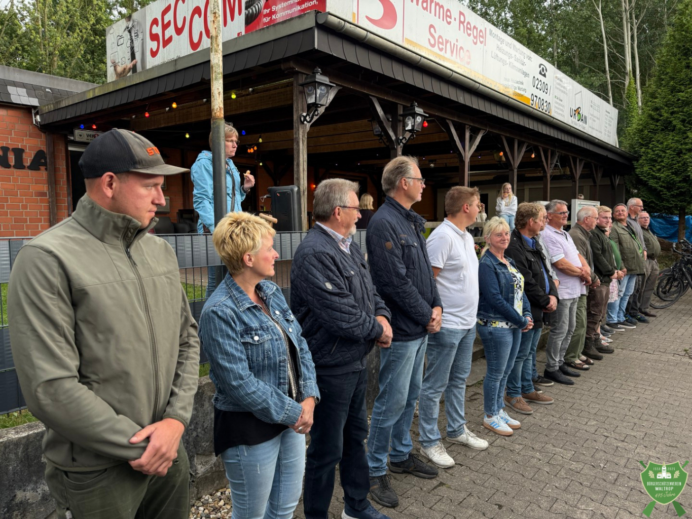Auch hier warteten viele Schützen zur Begrüßung des ankommenden Trupps. Die Rede von Hauptmann Christoph Rademacher fiel allerdings zunächst etwas kürzer aus, da leider zeitgleich ein Regenschauer einsetzte und es alle vorzogen, unter die trockene Überdachung der Terrasse zu flüchten. Bei kühlen Getränken und Gegrilltem ließ es sich hier aber auch durchaus gut aushalten. Die restlichen Worte wurden dann bei der Verabschiedung nachgeholt, als es wieder an der Zeit war die nächste Kompanie anzusteuern. Glücklicherweise hatte auch der Regen bis dahin nachgelassen.