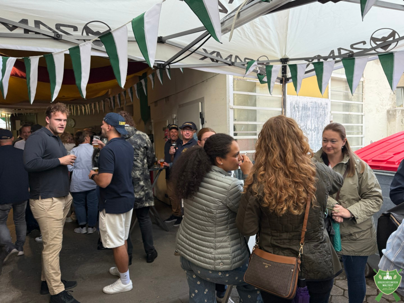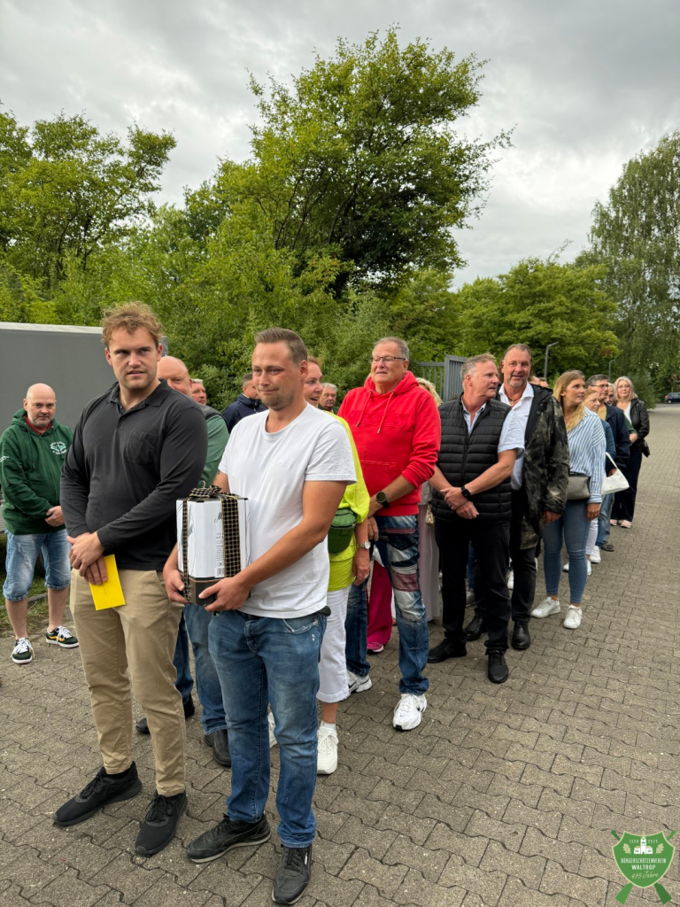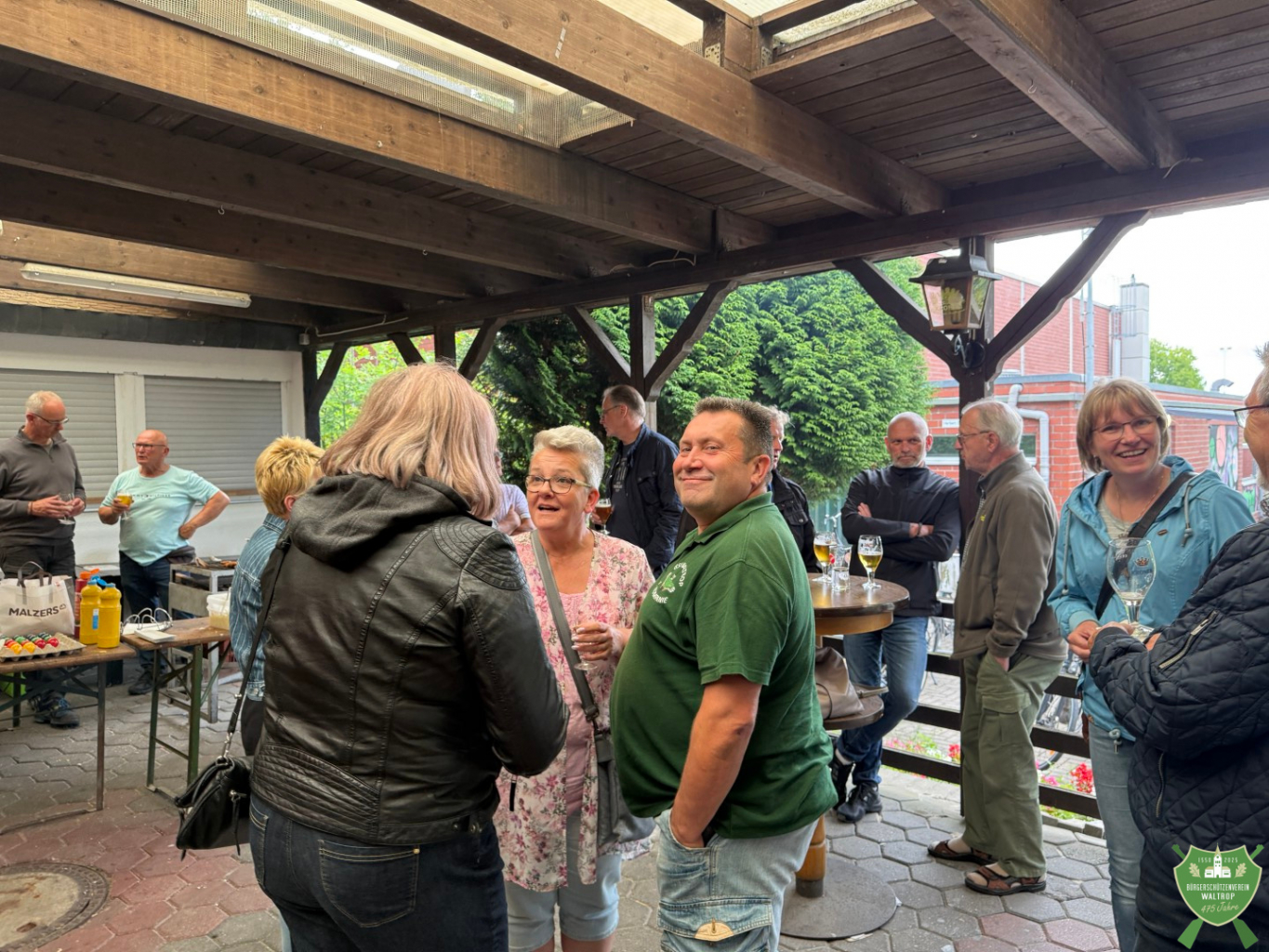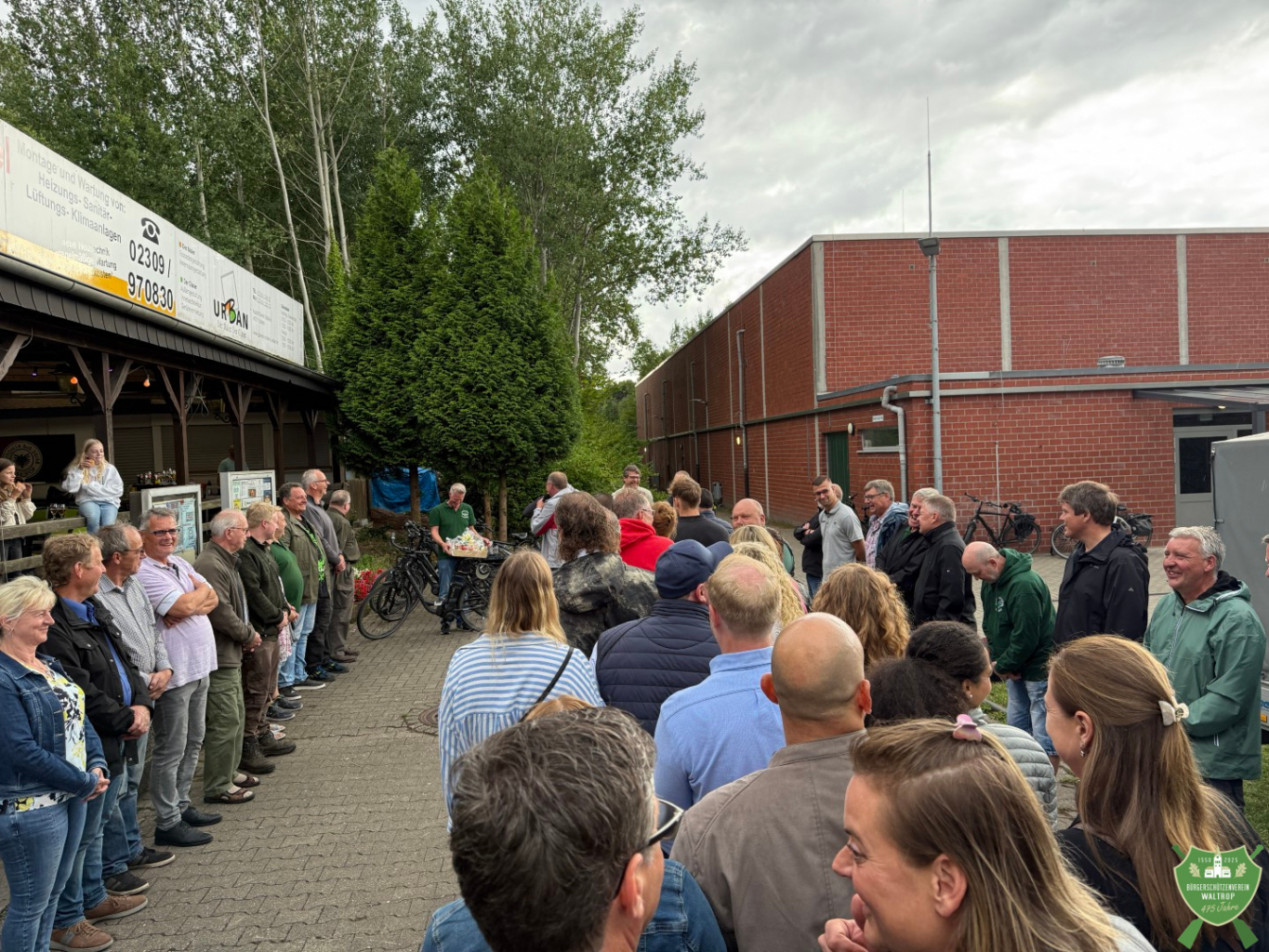 Auch hier warteten viele Schützen zur Begrüßung des ankommenden Trupps. Die Rede von Hauptmann Christoph Rademacher fiel allerdings zunächst etwas kürzer aus, da leider zeitgleich ein Regenschauer einsetzte und es alle vorzogen, unter die trockene Überdachung der Terrasse zu flüchten. Bei kühlen Getränken und Gegrilltem ließ es sich hier aber auch durchaus gut aushalten. Die restlichen Worte wurden dann bei der Verabschiedung nachgeholt, als es wieder an der Zeit war die nächste Kompanie anzusteuern. Glücklicherweise hatte auch der Regen bis dahin nachgelassen.