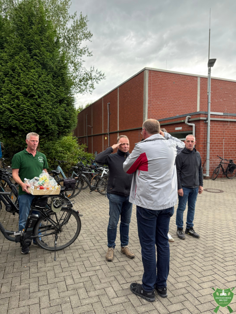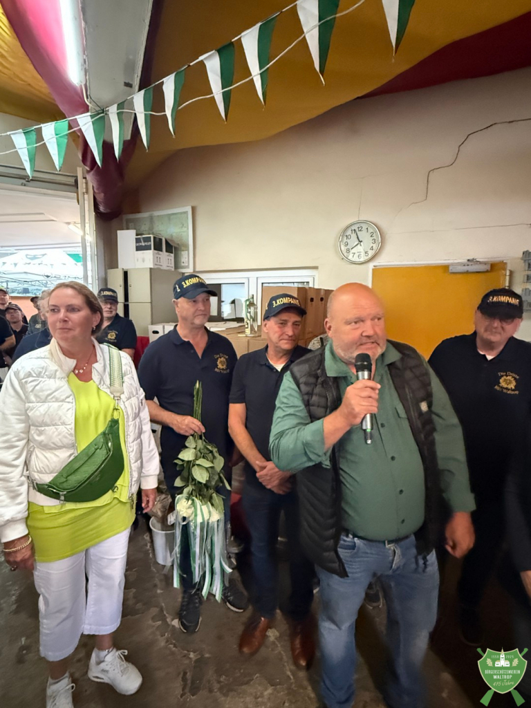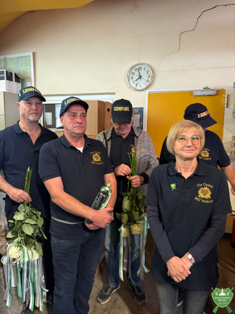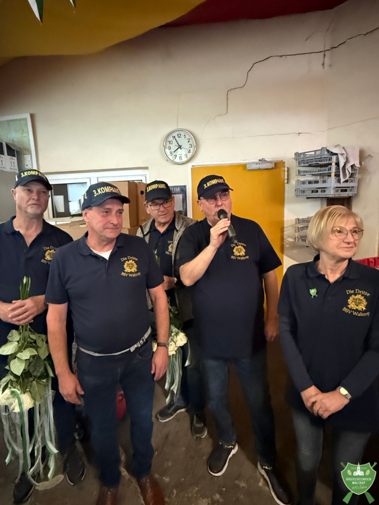 Besucht wurde als nächstes die 3. Kompanie bei Riechmann. Da die Stimme von Rüdiger Holzhüter während des Schützenfestes offenbar etwas gelitten hatte, übernahm nach kurzer Ansprache des Hauptmanns sein Stellvertreter Olaf Kurpiers für die restlichen Worte. Für die Frauen gab es von der Kompanie eine kleine Aufmerksamkeit in Form einer schönen Rose, überreicht durch Spieß Gerd Dammköhler und Stellvertreter Matthias Semmelmann.