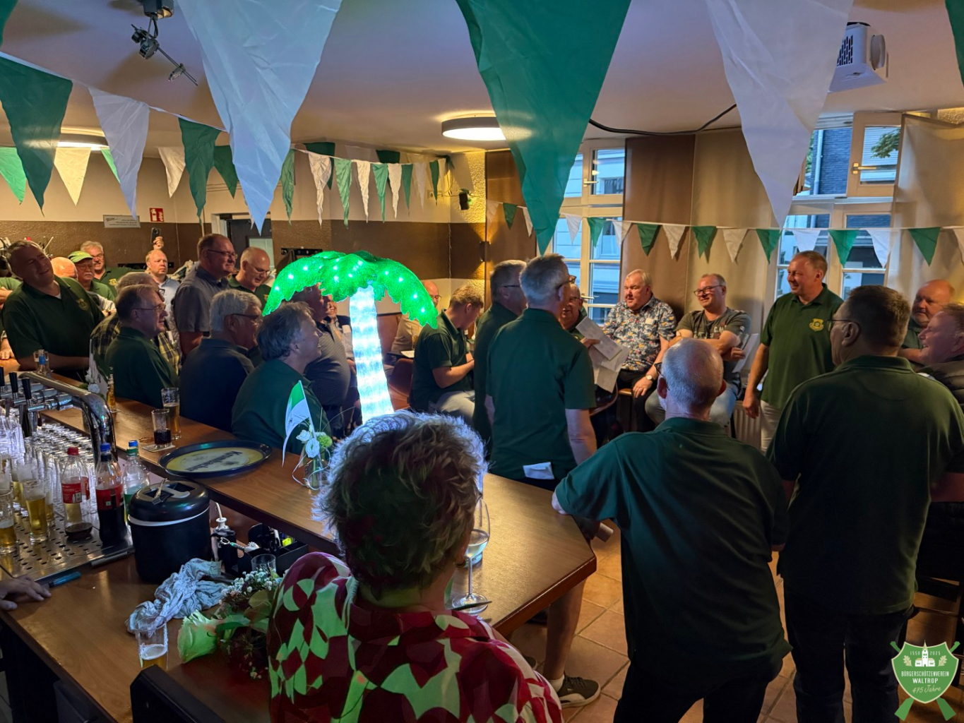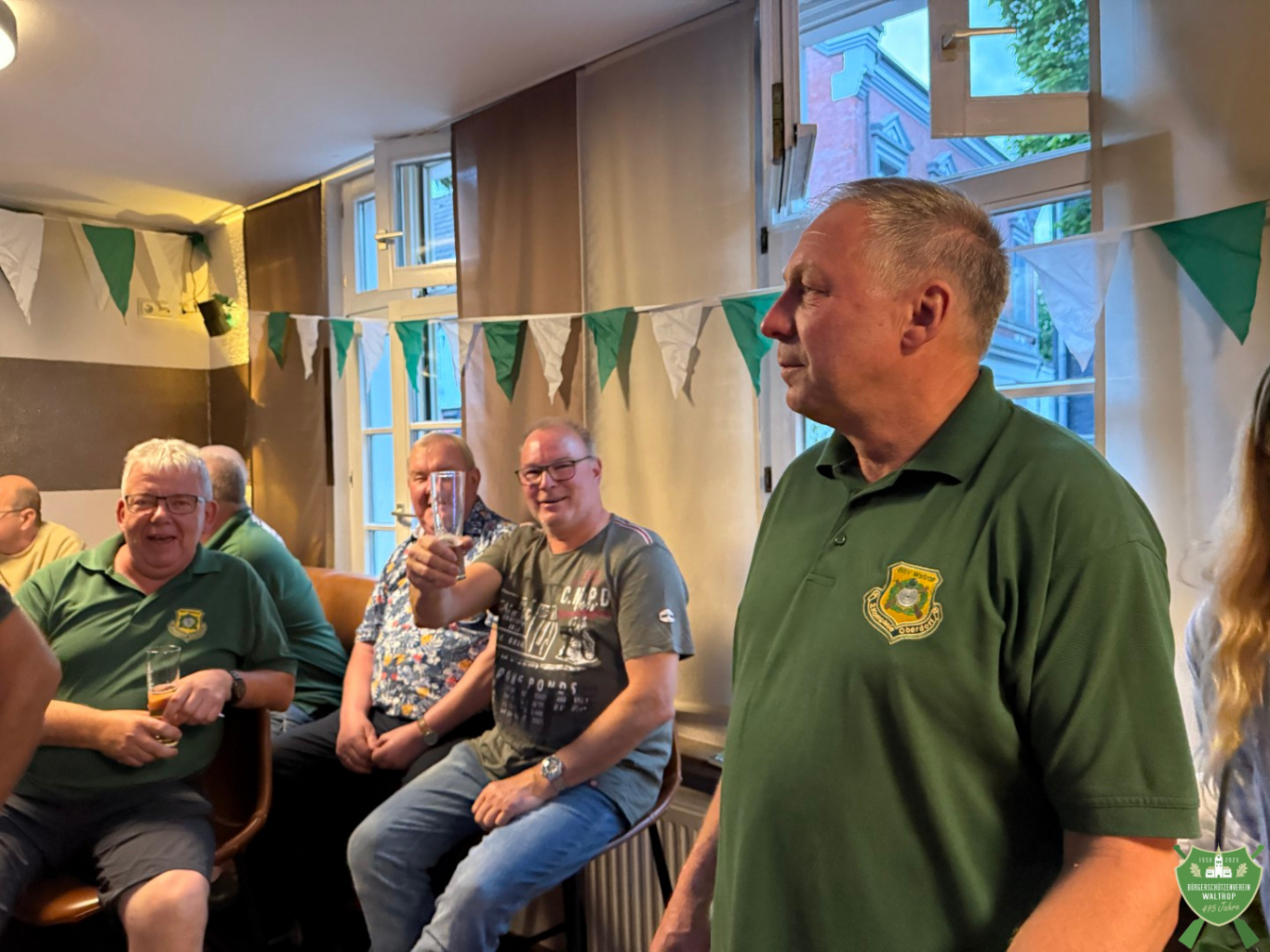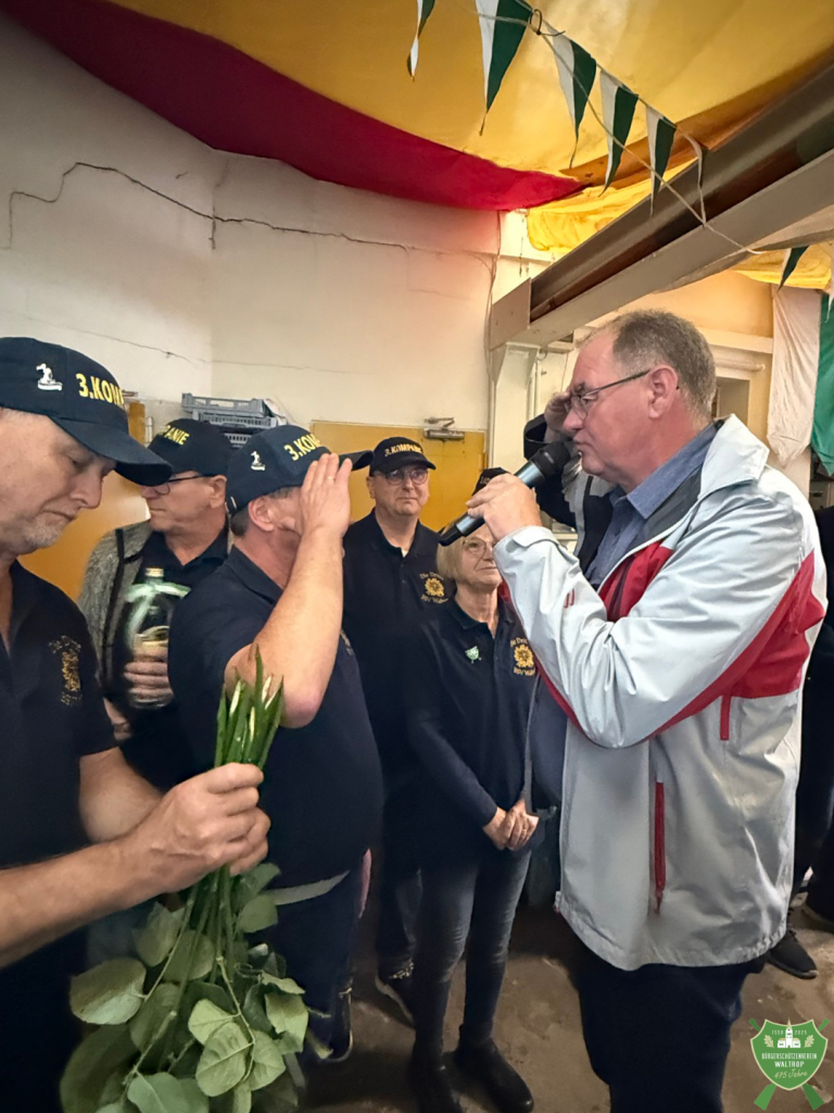 Nicht nur das Königspaar hatte an diesem Abend jeweils ein Präsent für die Kompanien mitgebracht, auch unser neuer General Matthias Brüggemann hatte am Vortag zu seiner Beförderung jeder Kompanie 50 Liter Bier versprochen. Da Matthias keine fünf 50-l-Fässer mit sich herumtragen wollte, wurde das Ganze in Form von einem Gutschein an die jeweiligen Kompaniekassierer überreicht.