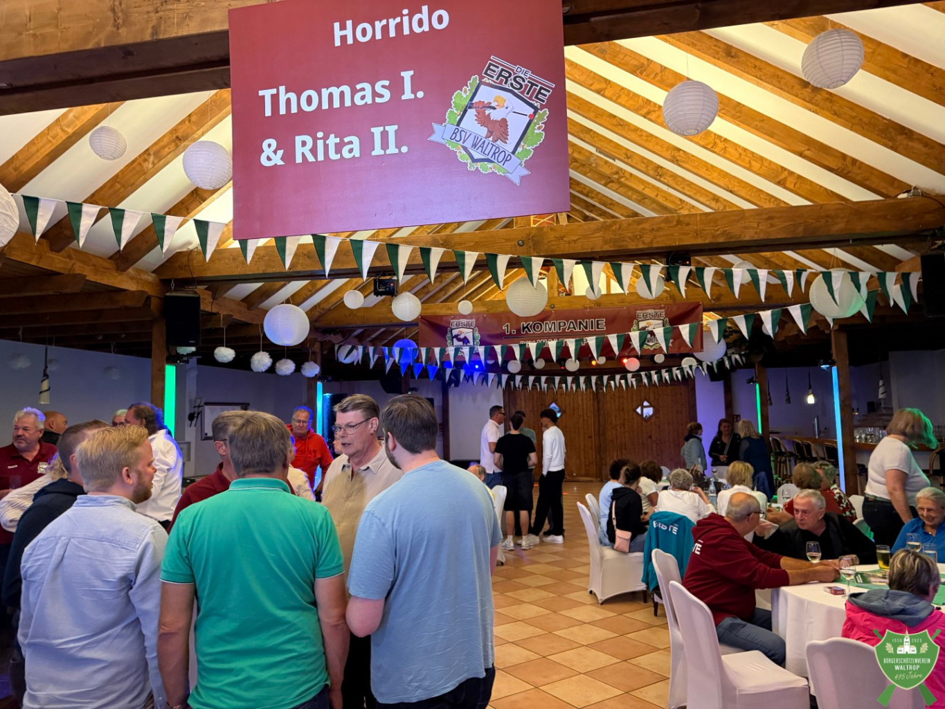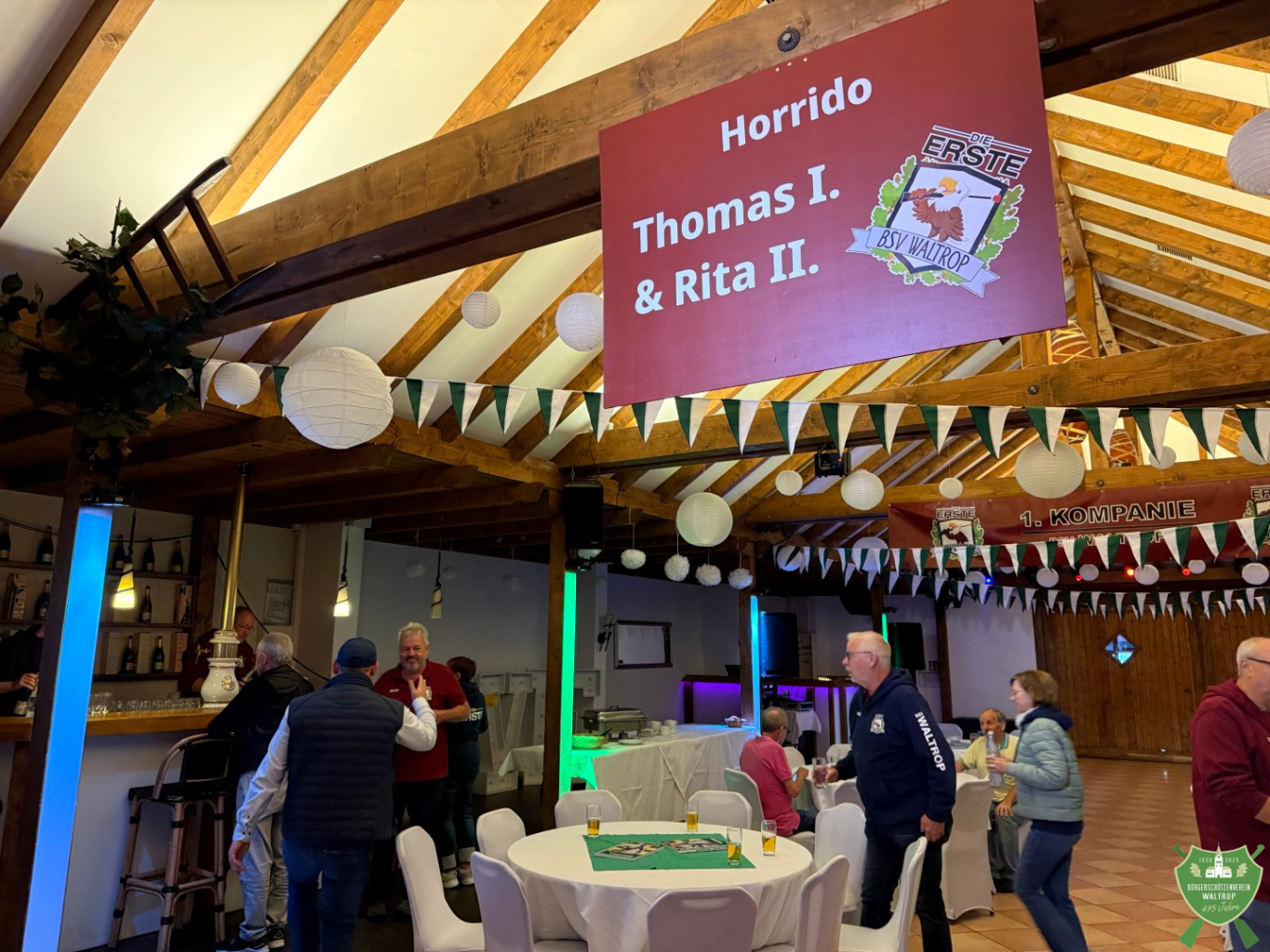 Mittlerweile schon leicht im Zeitverzug trommelte der General die Bataillons-Truppe wieder zusammen, um als nächstes die 1. Kompanie bei Burbaum zu besuchen. Vor der Tenne wartete nicht nur ein Spalier, sondern auch wieder ein krachender Empfang in Form eines kleinen Feuerwerks. Auch ein großes Schild mit „Horrido Thomas I. & Rita II.“ hatte Hauptmann Dirk Lehnhardt in der Kürze der Zeit anfertigen lassen und gut sichtbar zum Empfang in der Tenne angebracht.