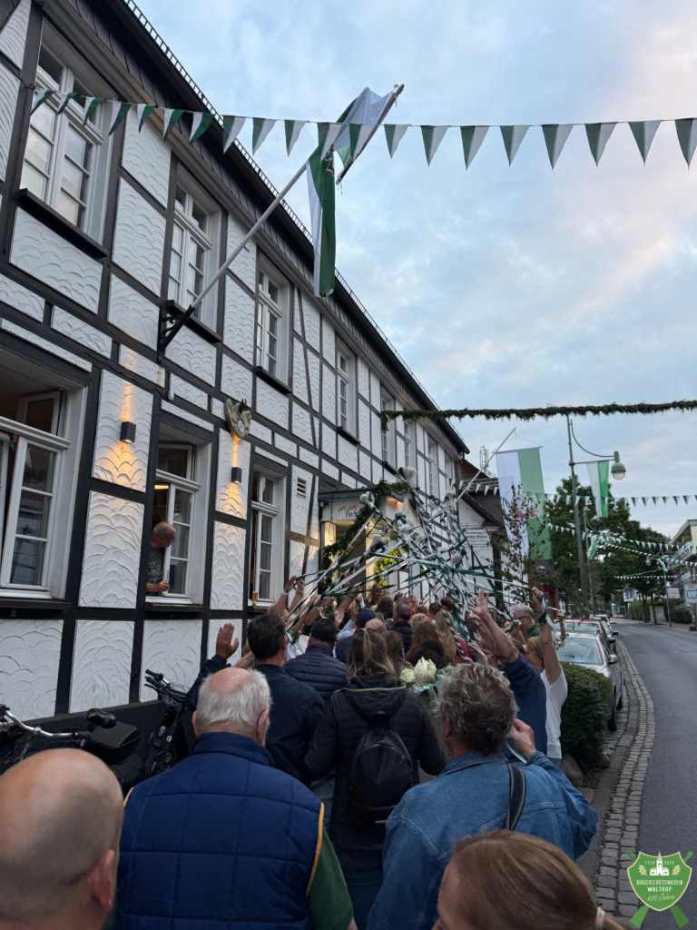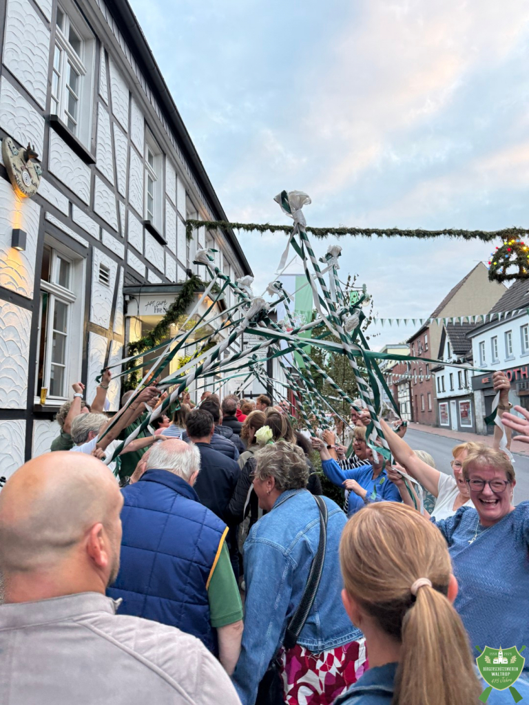 Zum Abschluss des Schützenfestes steht am Tag danach bei allen Kompanien das Abkränzen auf der Tagesordnung. So auch am Montag in diesem Jahr. Wie beim Kranzbinden vor dem Fest, besuchten Bataillonsvorstand und das neue Königspaar samt Hofstaat auch dabei während einer kleinen Tour alle Kompanien.