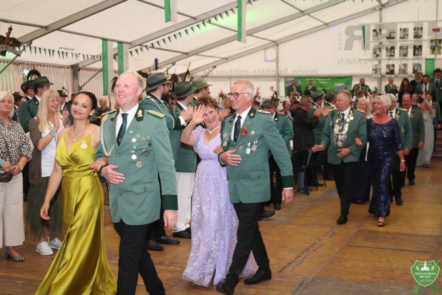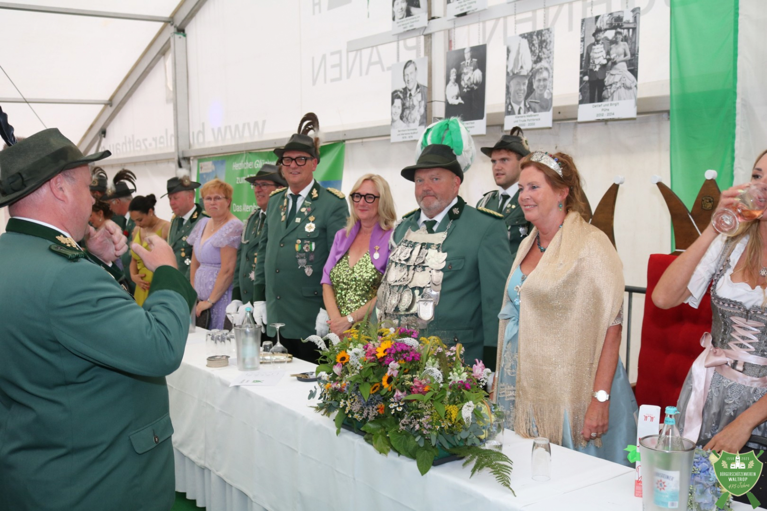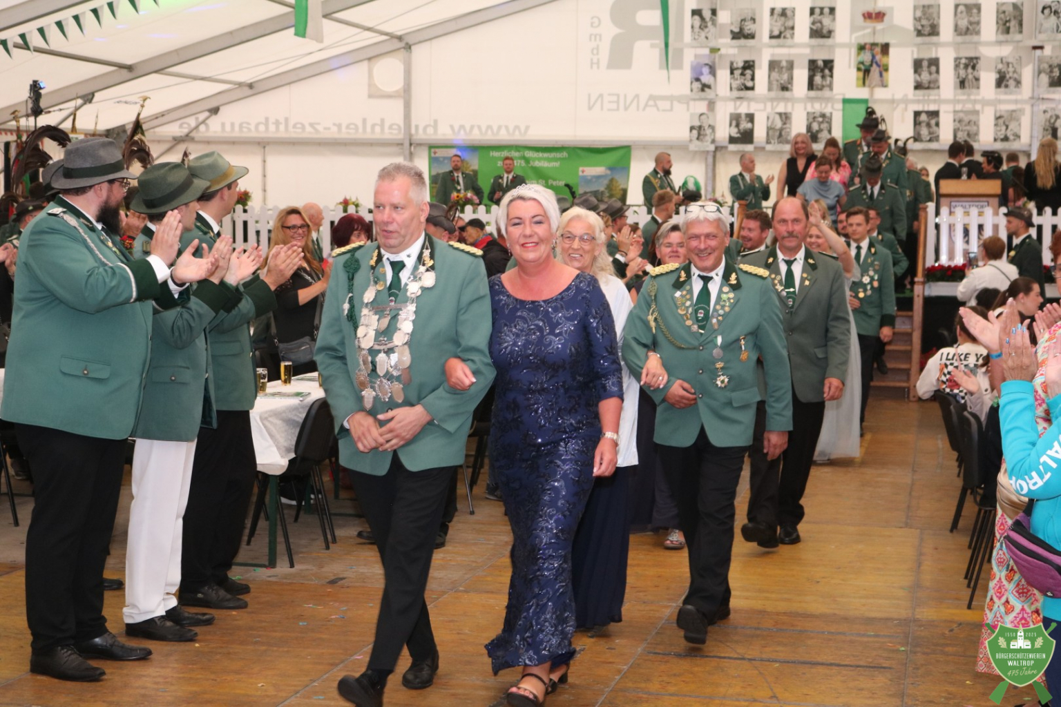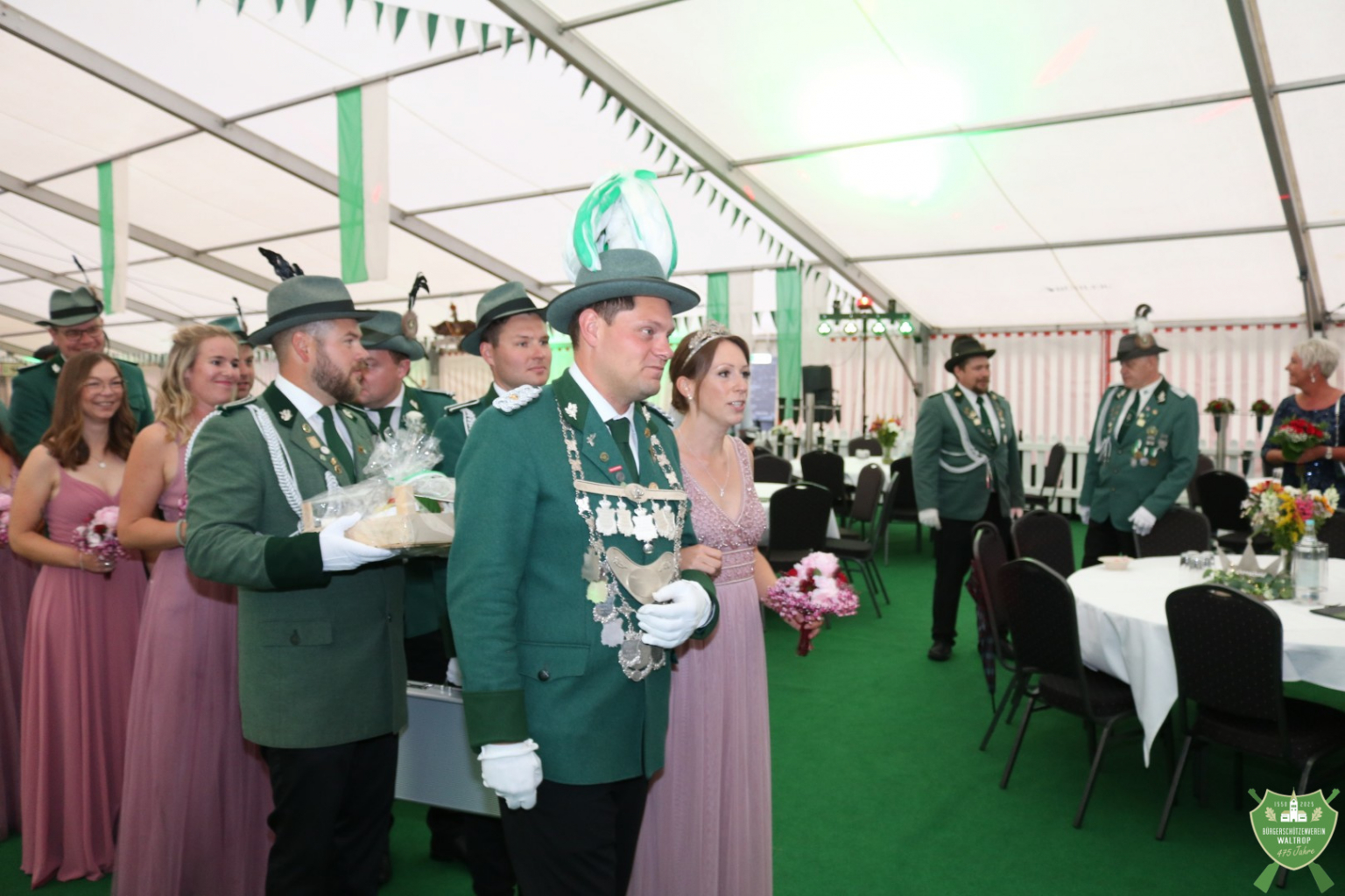 Zum abendlichen Krönungsball konnte das neue Königspaar samt Hofstaat dann auch um 20.00 Uhr direkt noch einmal ins Zelt einmarschieren. Durch ein Spalier von Schützen und Gästen marschierten natürlich auch wieder der Bataillonsvorstand und die Königspaare samt Gefolge unserer befreundeten Nachbarvereine auf den Thron. Entsprechend viele Glückwünsche und Präsente warteten auf Thomas und Rita, denn natürlich ließ es sich kein Verein nehmen, zu gratulieren und eine schöne Zeit auf dem Thron zu wünschen.