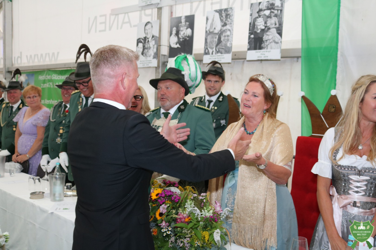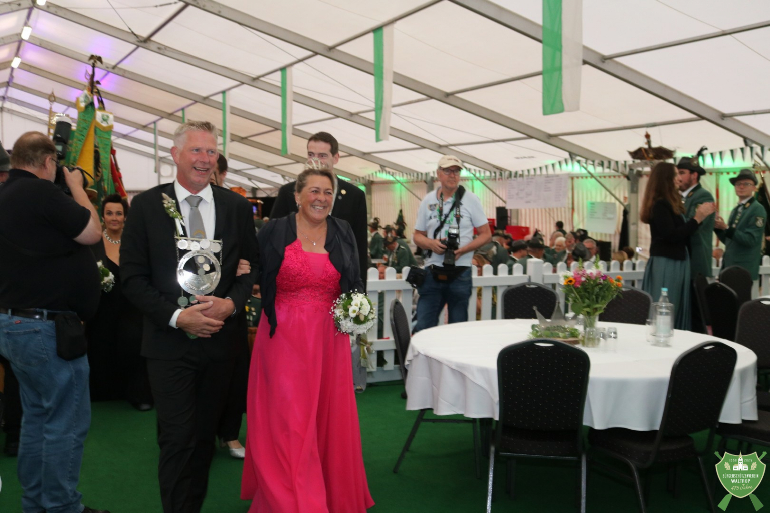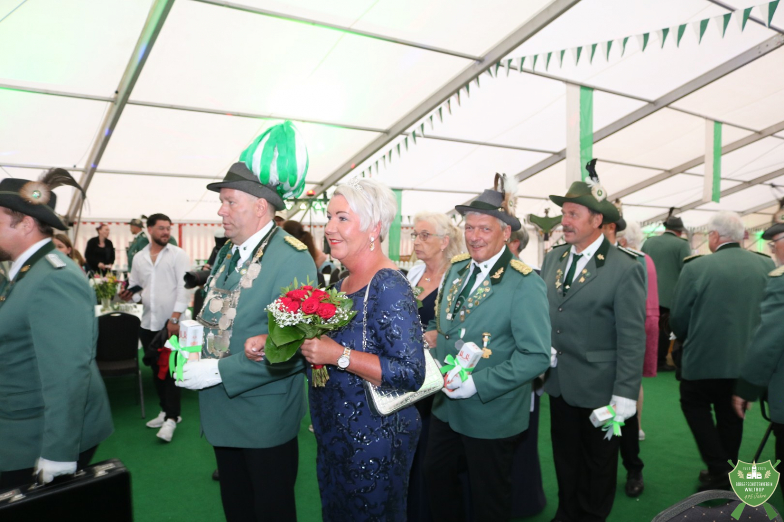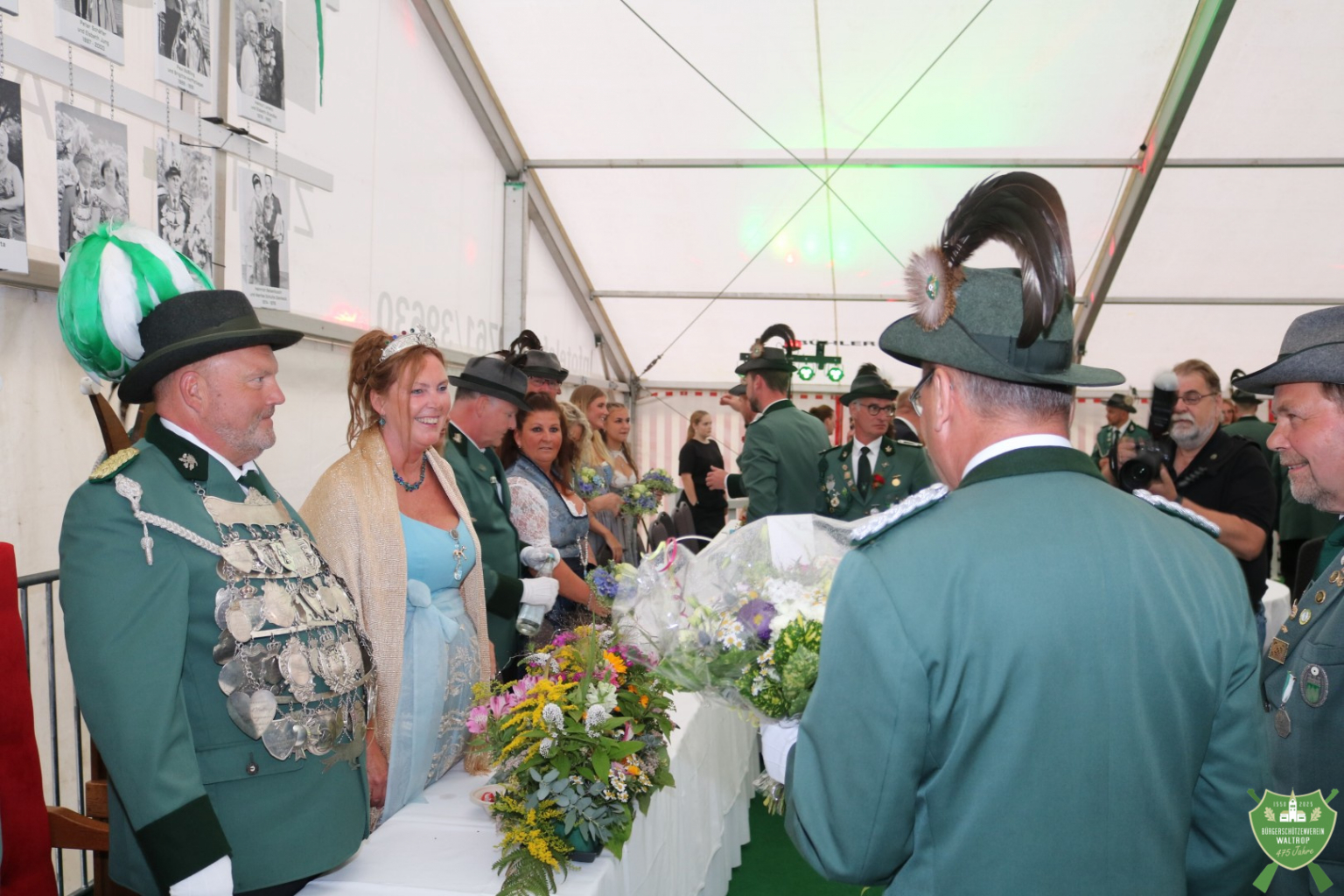 Zum abendlichen Krönungsball konnte das neue Königspaar samt Hofstaat dann auch um 20.00 Uhr direkt noch einmal ins Zelt einmarschieren. Durch ein Spalier von Schützen und Gästen marschierten natürlich auch wieder der Bataillonsvorstand und die Königspaare samt Gefolge unserer befreundeten Nachbarvereine auf den Thron. Entsprechend viele Glückwünsche und Präsente warteten auf Thomas und Rita, denn natürlich ließ es sich kein Verein nehmen, zu gratulieren und eine schöne Zeit auf dem Thron zu wünschen.