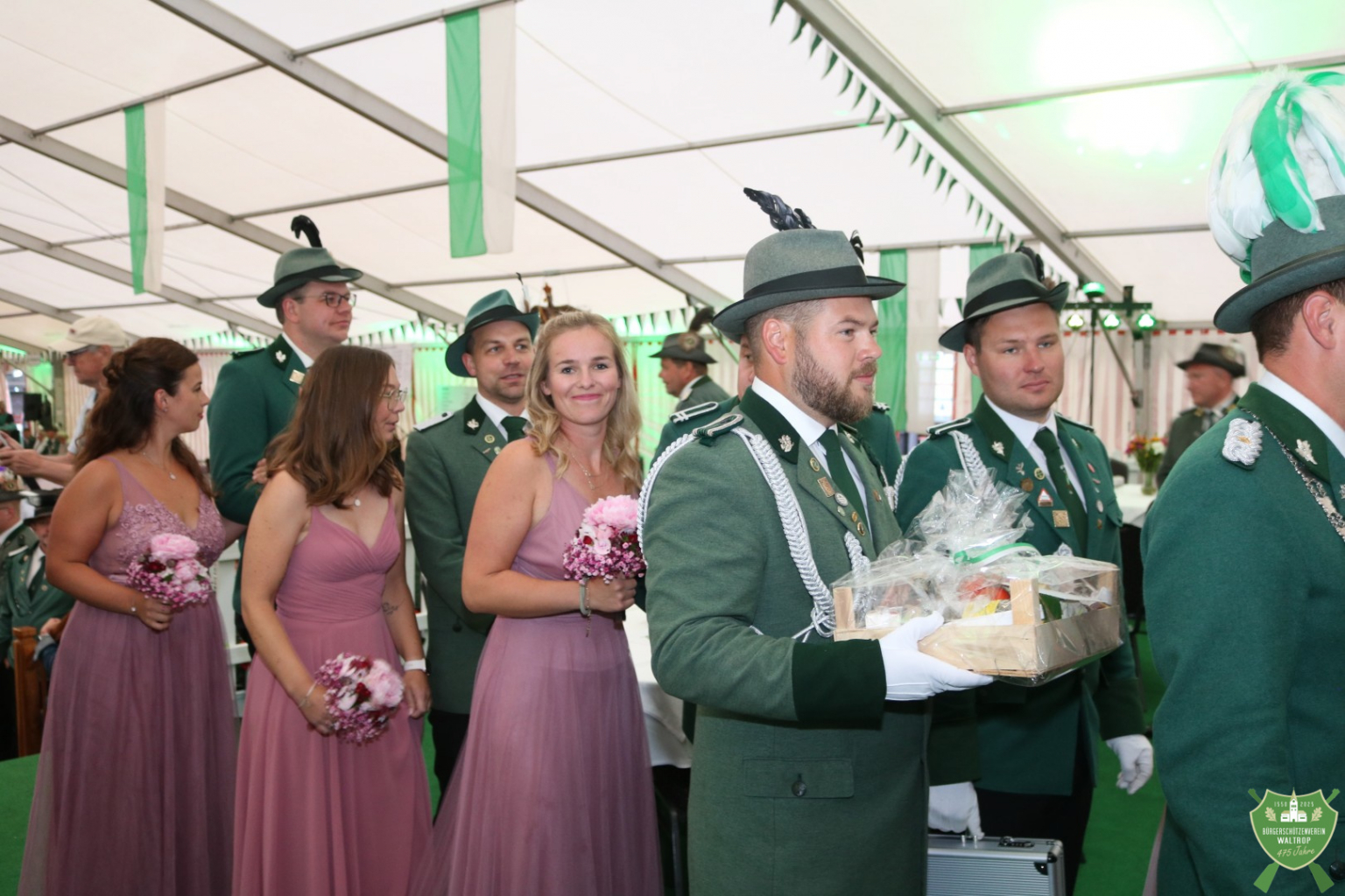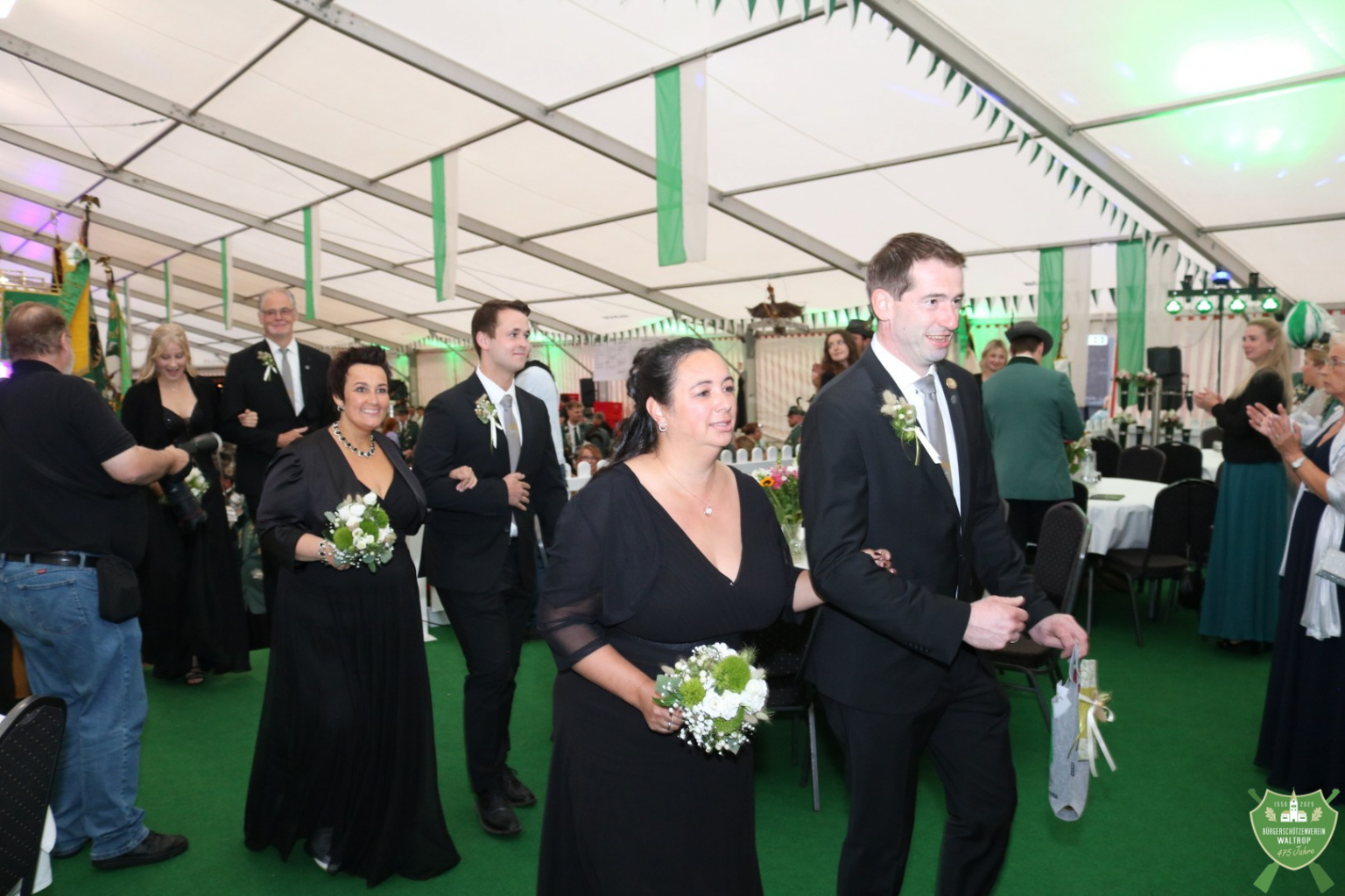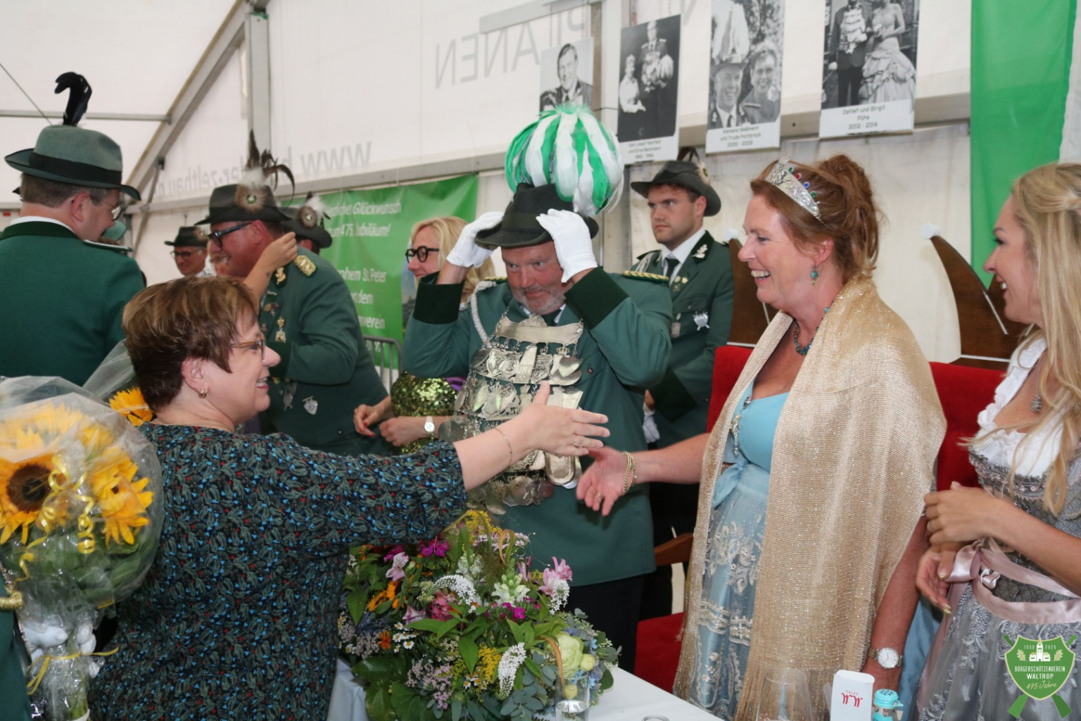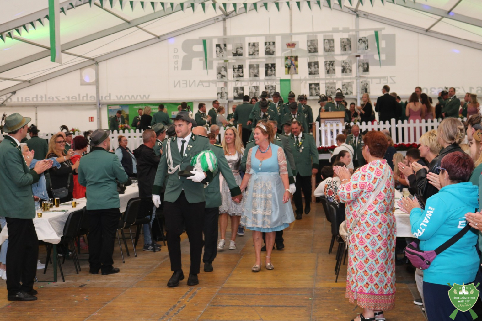 Zum abendlichen Krönungsball konnte das neue Königspaar samt Hofstaat dann auch um 20.00 Uhr direkt noch einmal ins Zelt einmarschieren. Durch ein Spalier von Schützen und Gästen marschierten natürlich auch wieder der Bataillonsvorstand und die Königspaare samt Gefolge unserer befreundeten Nachbarvereine auf den Thron. Entsprechend viele Glückwünsche und Präsente warteten auf Thomas und Rita, denn natürlich ließ es sich kein Verein nehmen, zu gratulieren und eine schöne Zeit auf dem Thron zu wünschen.