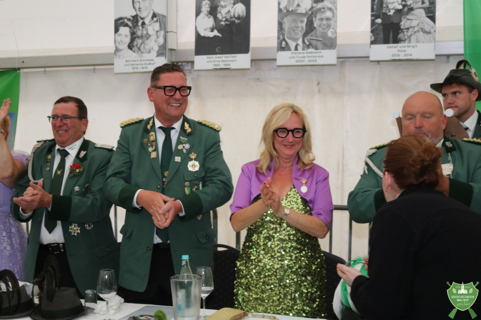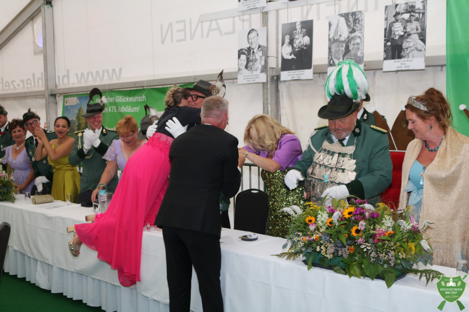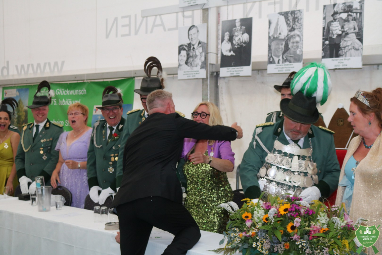 Bevor die Party aber endgültig losgehen konnte, hatten sich noch diverse Gratulanten am Eingang aufgereiht, die noch auf den Thron marschieren und ebenfalls Glückwünsche überbringen wollten, so z.B. der Sparclub aus Thomas und Ritas Kneipe „Kö14“.