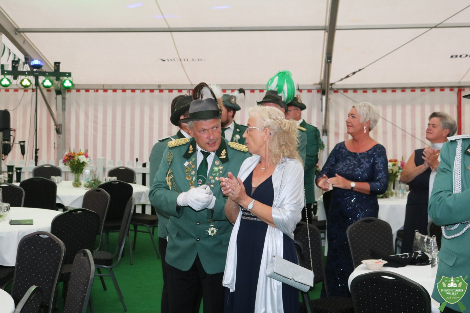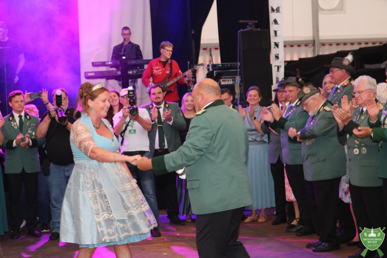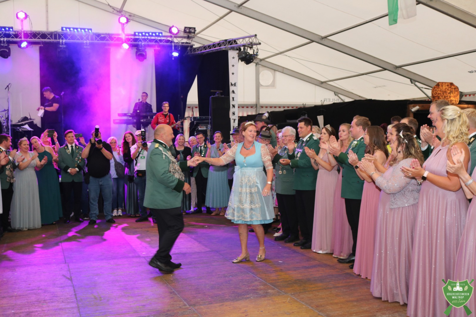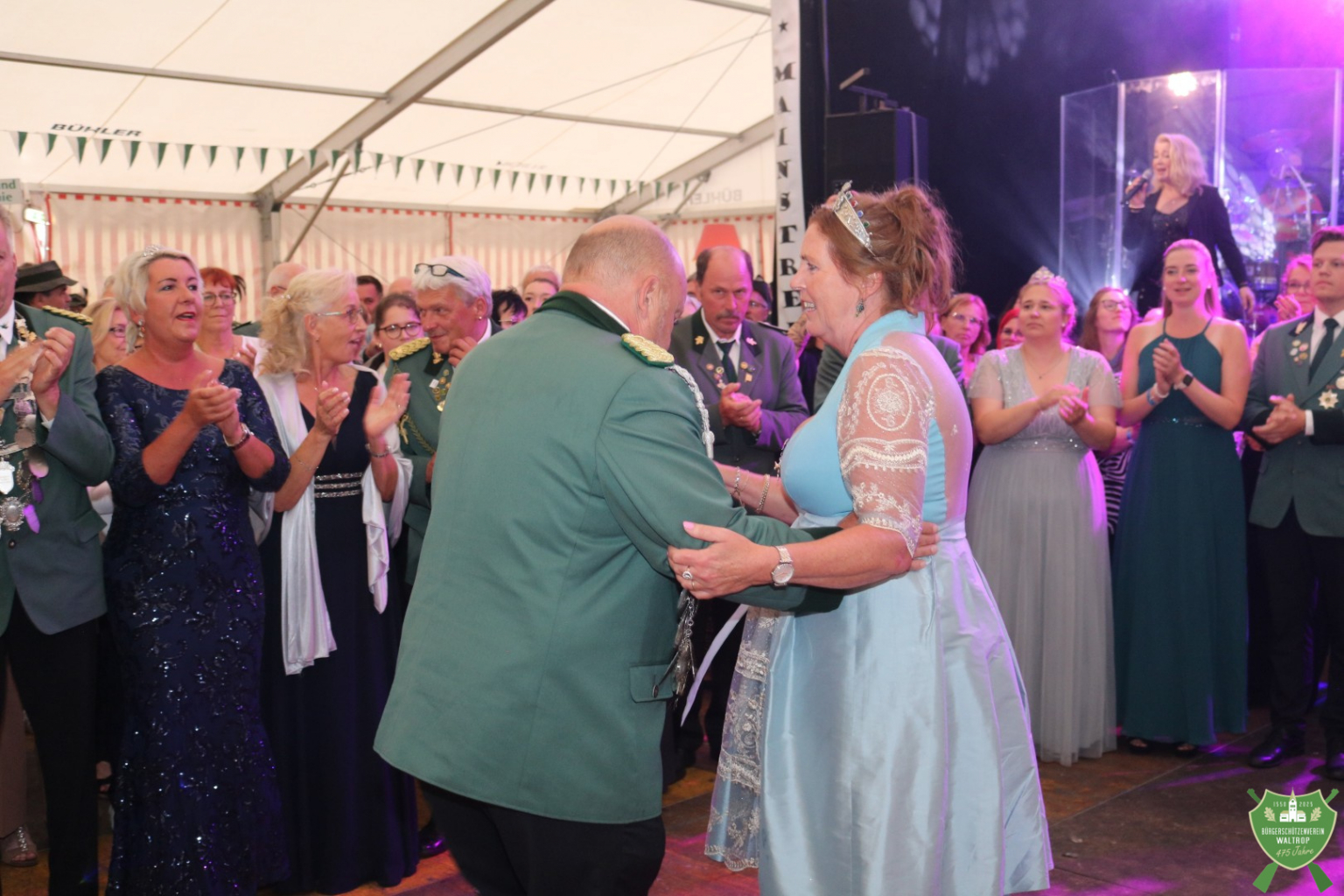 Nachdem auch die Spieße aller fünf Kompanien noch einmal auf den Thron marschierten, um Glückwünsche zu übermitteln, konnte dann auch die Band Mainstreet loslegen und unser Königspaar zum Eröffnungstanz bitten. Thomas und Rita eröffneten dabei souverän die Tanzfläche, womit der feierliche Teil des Abends begonnen hatte.