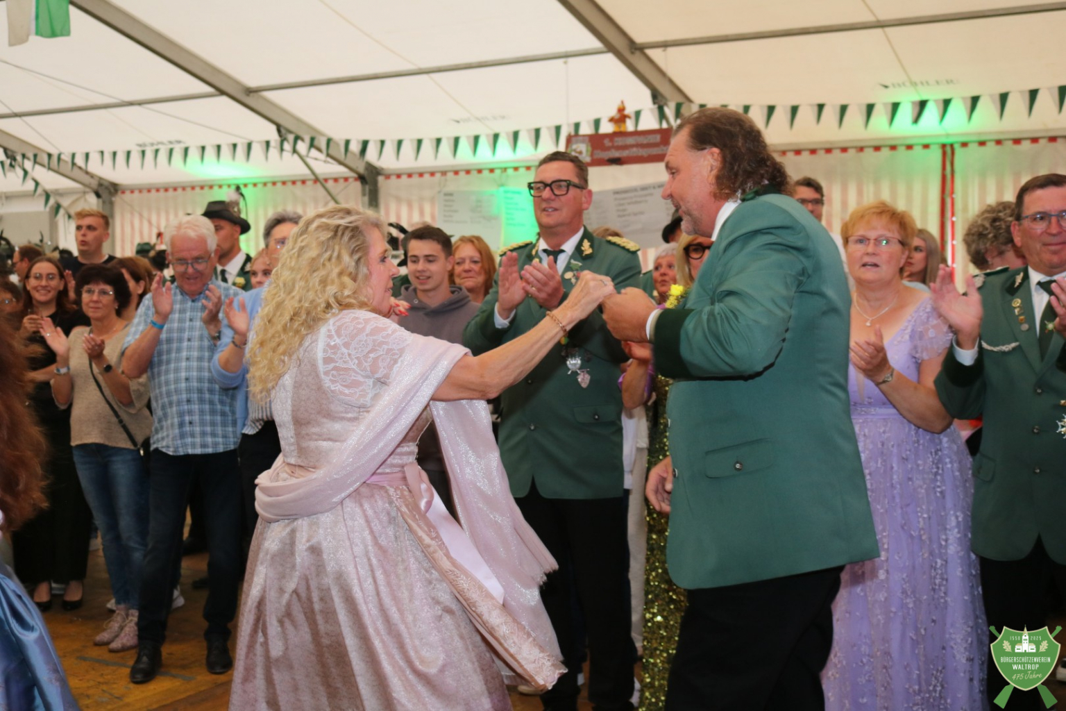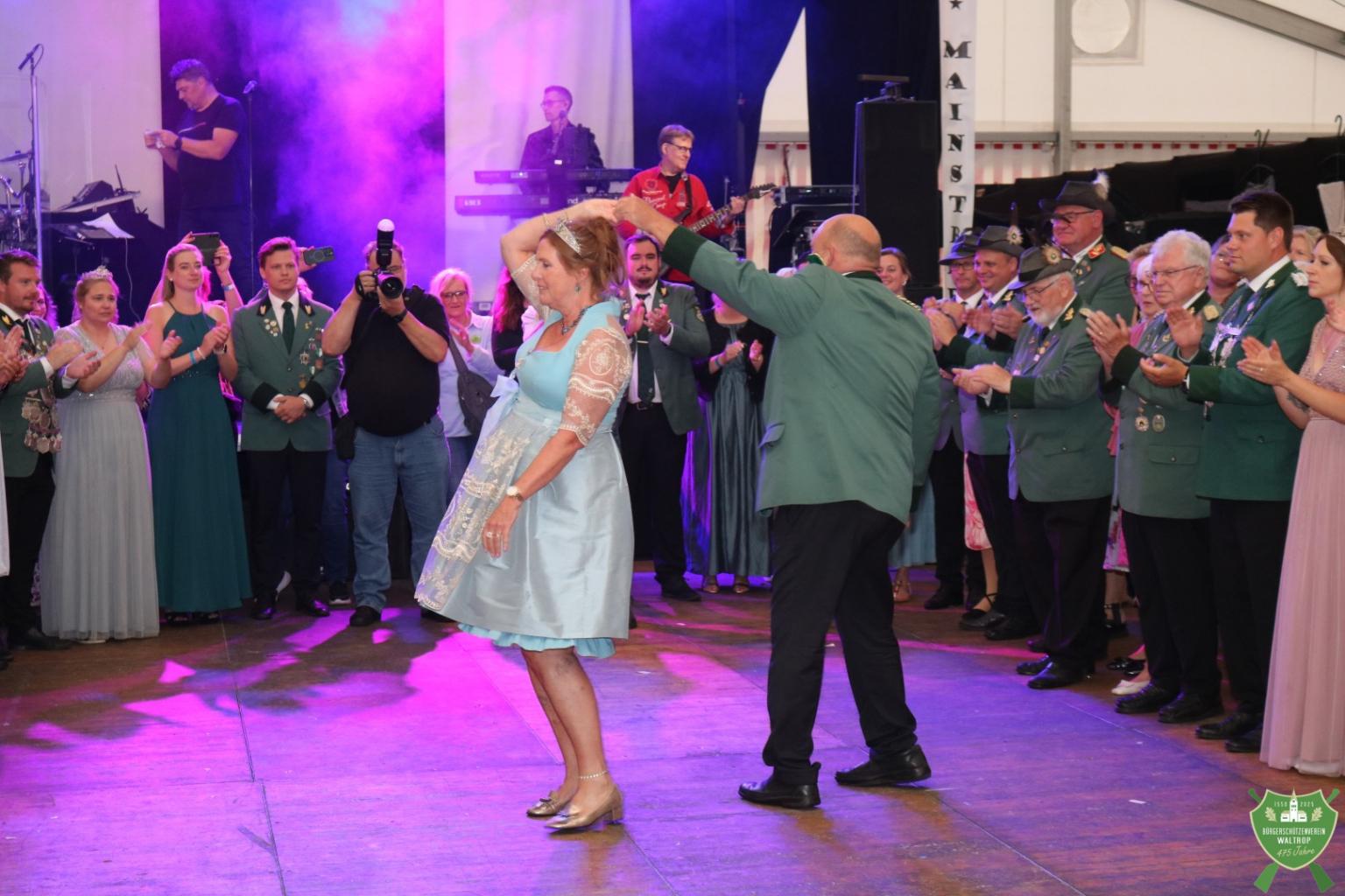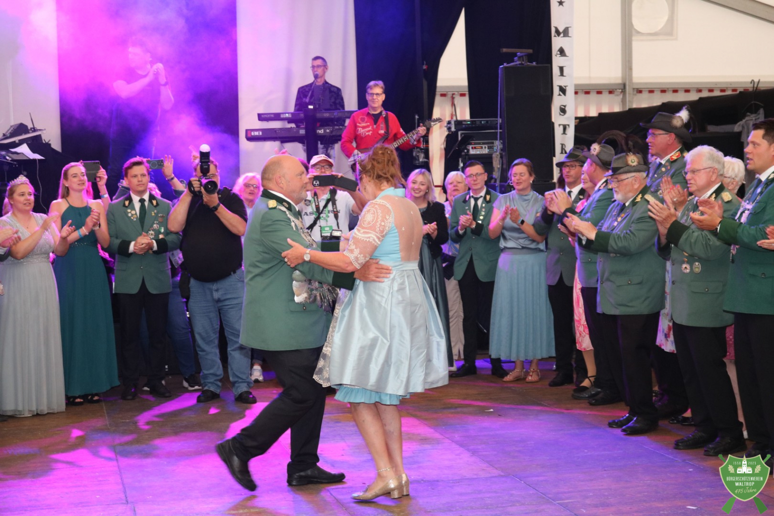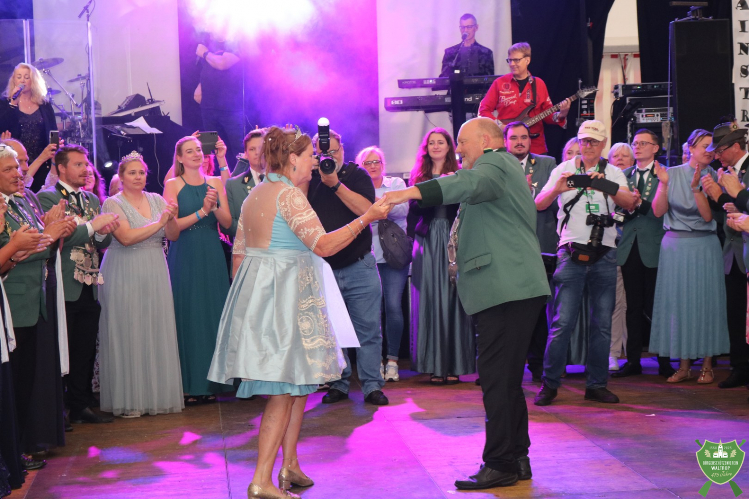 Nachdem auch die Spieße aller fünf Kompanien noch einmal auf den Thron marschierten, um Glückwünsche zu übermitteln, konnte dann auch die Band Mainstreet loslegen und unser Königspaar zum Eröffnungstanz bitten. Thomas und Rita eröffneten dabei souverän die Tanzfläche, womit der feierliche Teil des Abends begonnen hatte.