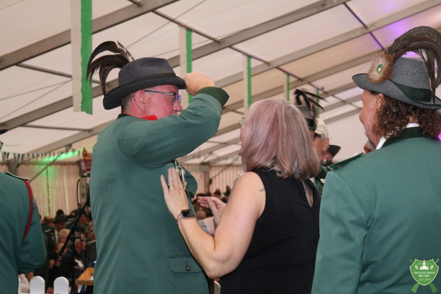 Im Anschluss folgte ein überraschender Programmpunkt. Überraschend auf jeden Fall für unseren Oberst Matthias Brüggemann, der nach vorne gebeten wurde. Matthias, der wenige Stunden zuvor noch mit um die Königswürde kämpfte, aber sich dann gegen Thomas Möllers geschlagen geben musste, wurde vor versammelter Mannschaft vom Bataillonsvorstand zum General ernannt! In einer emotionalen Beförderungszeremonie konnten König und Königin direkt ihre erste Amtshandlung vornehmen und dem sichtlich sprachlosen Matthias die Generals-Schulterklappen an der Jacke befestigen, die zuletzt sein Vorgänger Georg Bertling trug.