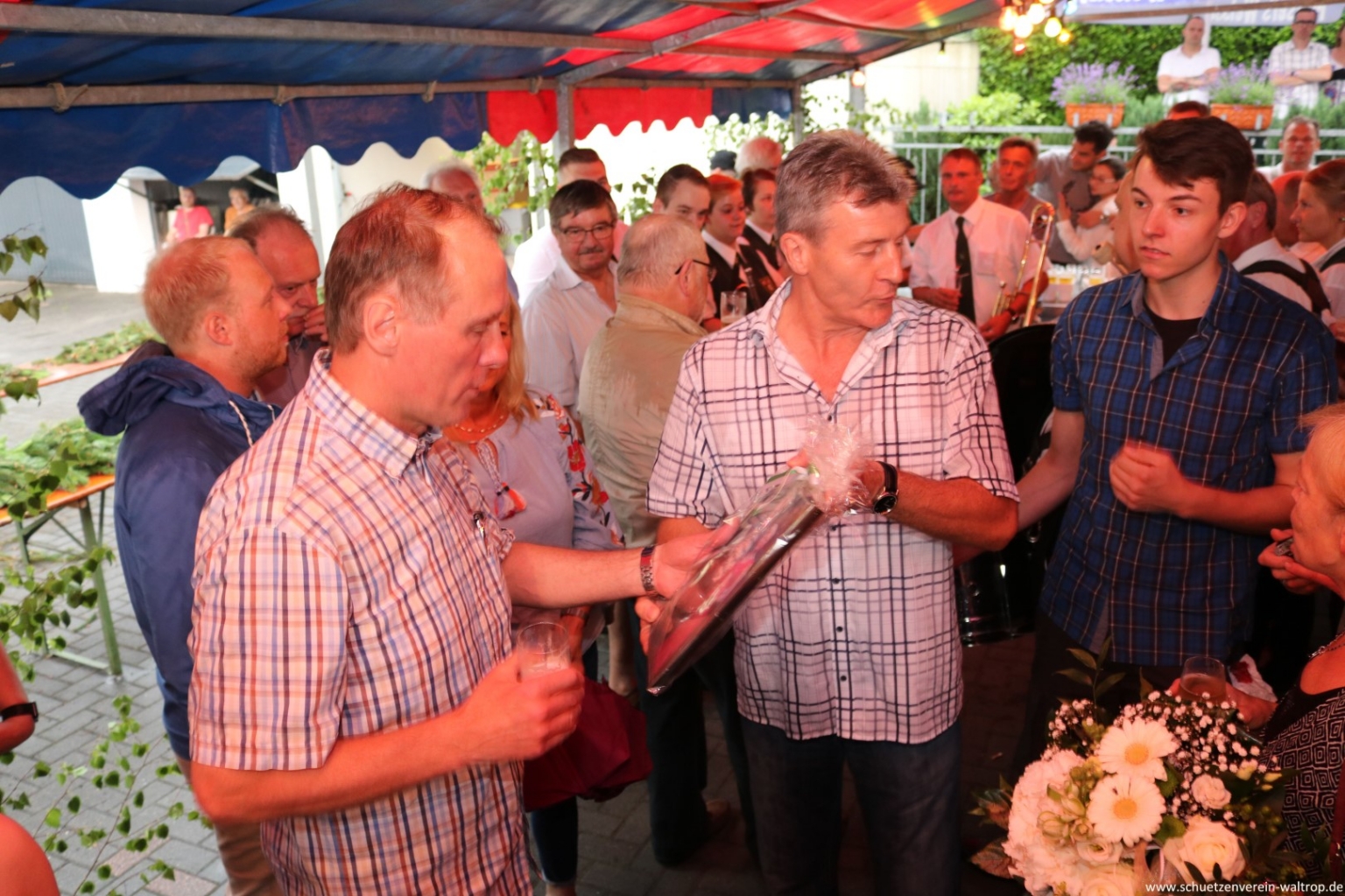 Das erste Ziel war an diesem Abend die fünfte Kompanie an ihrem Kompanielokal "Hotel am Park". Im Innenhof hatten sich schon viele Schützen samt Damen der 5. Kompanie eingefunden und begrüßten den ankommenden Tross. In dem aufgebauten Zelt rückten alle etwas näher zusammen, sodass während den Begrüßungs-Ansprachen jeder einen trockenen Platz finden konnte. Vorsitzender Ludger Grothus hatte für die Kompanie natürlich noch ein kleines Präsent in Form von einer Flasche Doppel-Wacholder parat. König Winni überreichte Hauptmann Thomas Finke anschließend noch ein Foto des scheidenden Königspaares und einen Strauß Blumen für die Gattin.