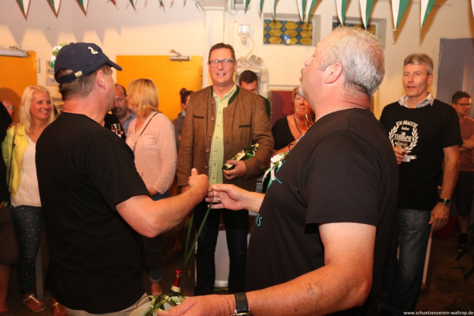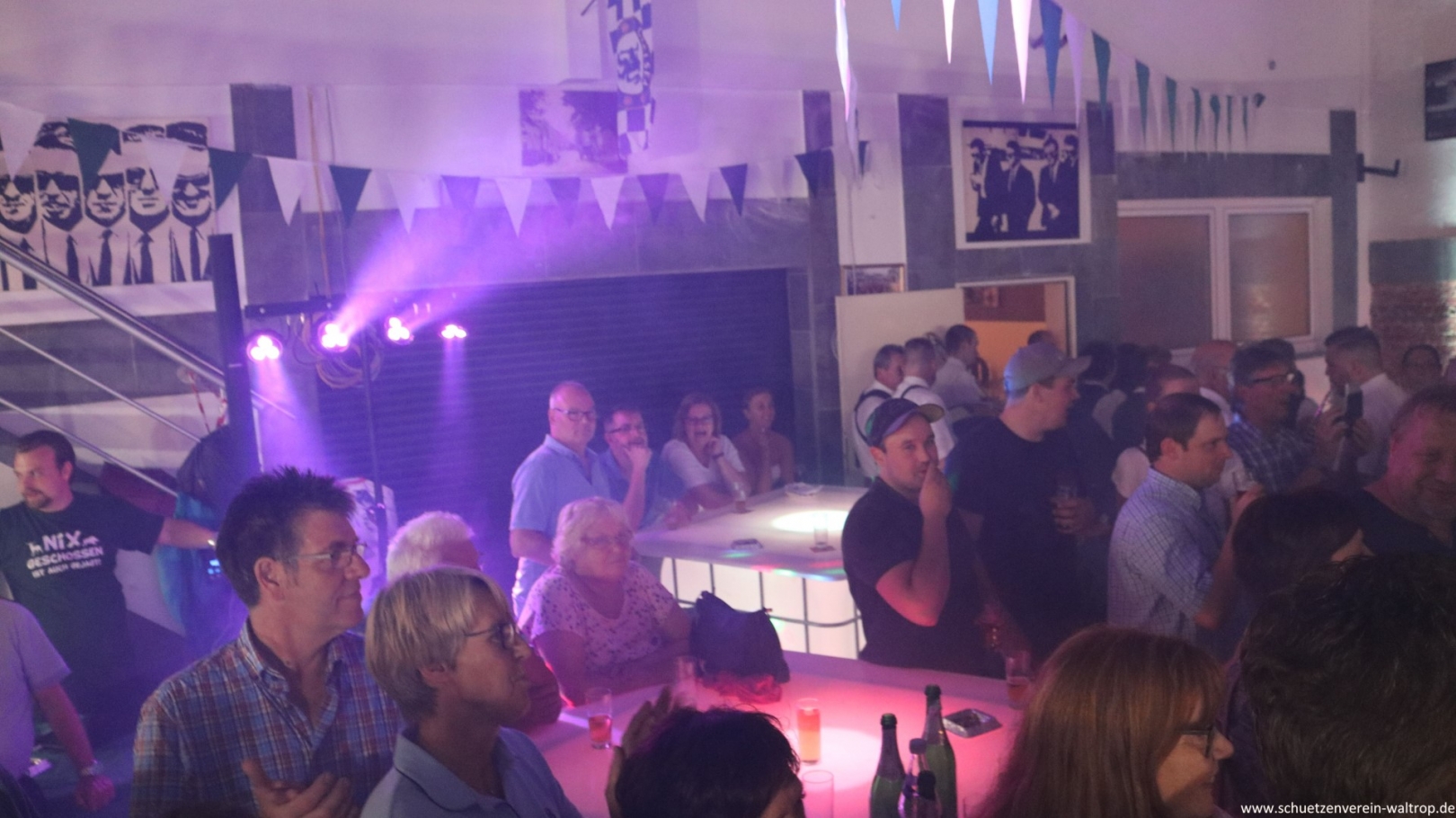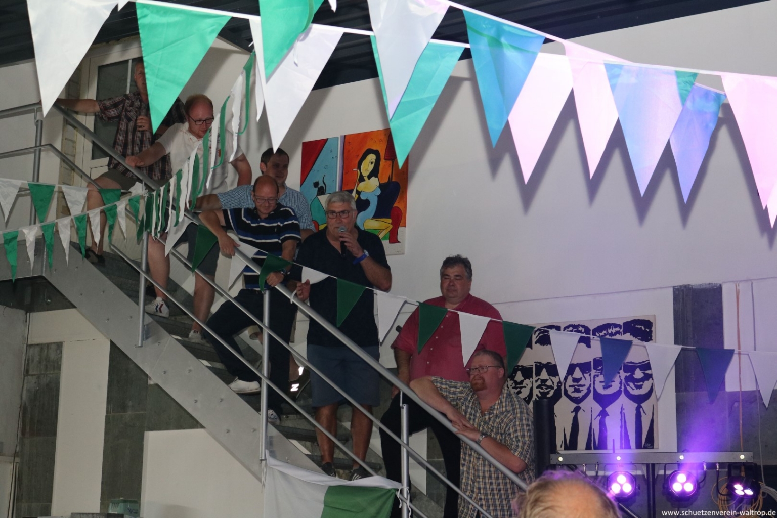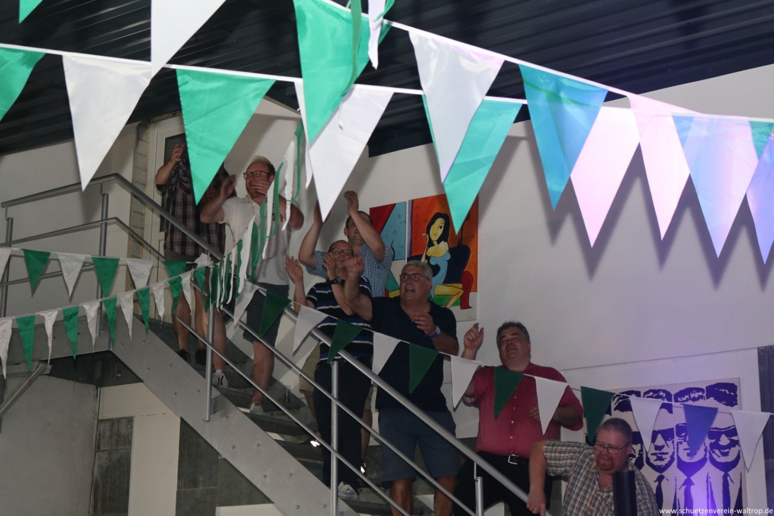 Nach der Verabschiedung und dem Ausmarsch folgte ein nur kurzer Fußweg. Das Ziel war die 2. Kompanie am Kompanielokal bei Sascha Müller. Gekränzt und gefeiert wurde im hinteren Teil in der großen Halle. Über die Dorfmüllerstraße zog der Tross durch ein Spalier von Schützen in die Partyhalle ein. Eingehüllt in Nebel aus der Nebelmaschine gab es im Inneren natürlich auch hier die üblichen Begrüßungen und Präsentübergaben.