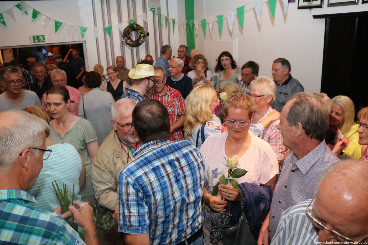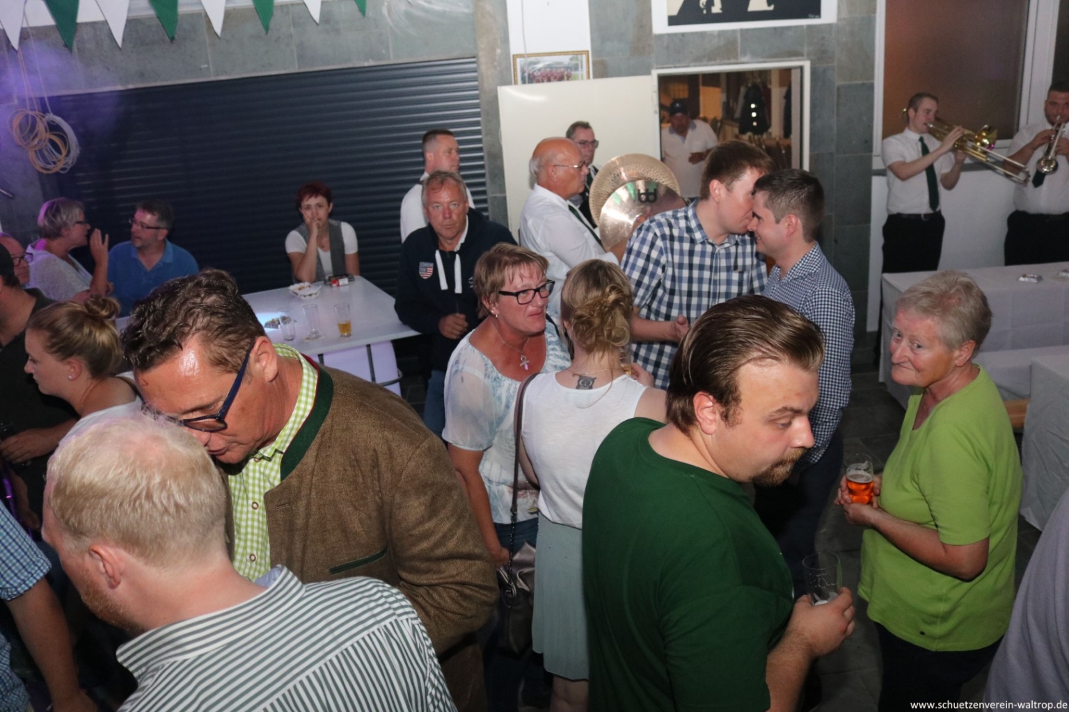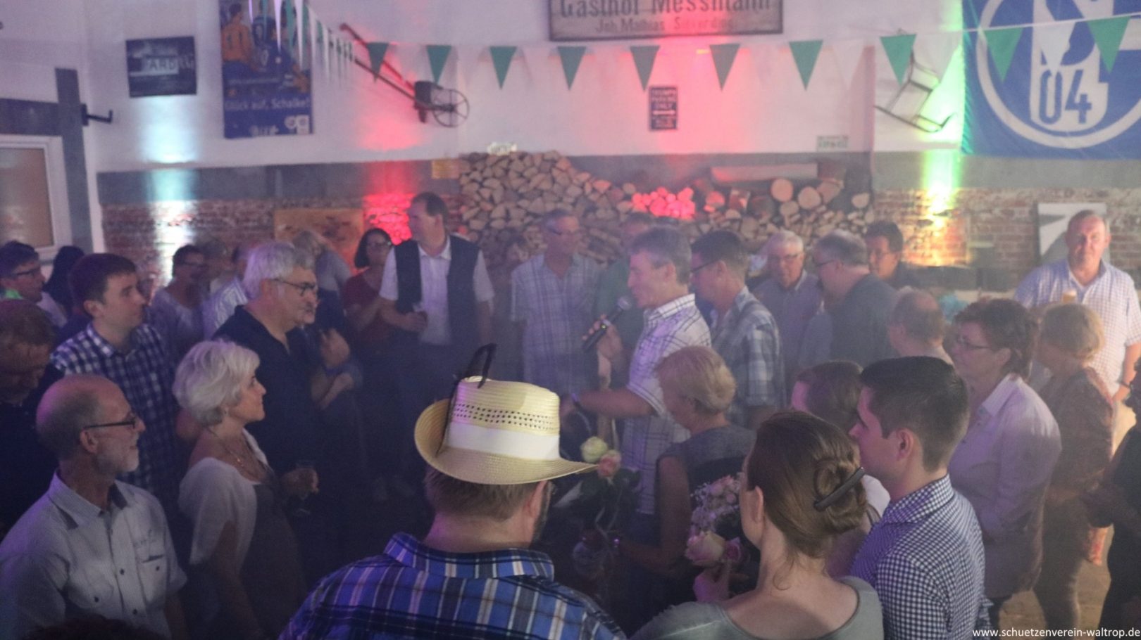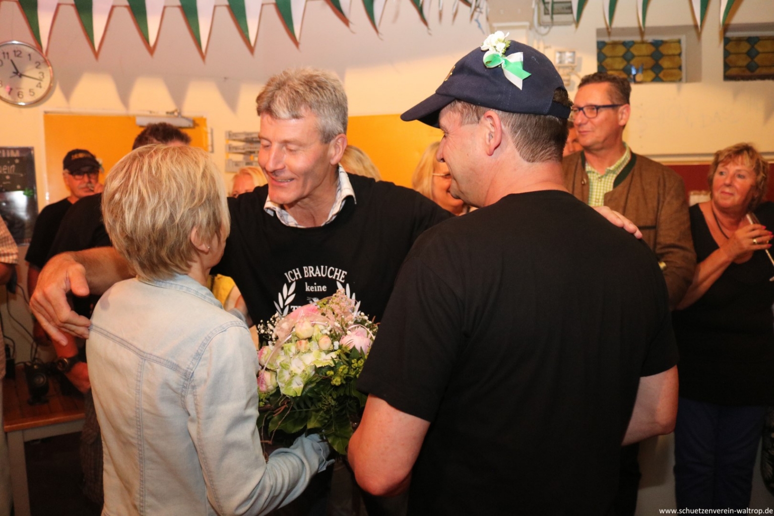 Nach der Verabschiedung und dem Ausmarsch folgte ein nur kurzer Fußweg. Das Ziel war die 2. Kompanie am Kompanielokal bei Sascha Müller. Gekränzt und gefeiert wurde im hinteren Teil in der großen Halle. Über die Dorfmüllerstraße zog der Tross durch ein Spalier von Schützen in die Partyhalle ein. Eingehüllt in Nebel aus der Nebelmaschine gab es im Inneren natürlich auch hier die üblichen Begrüßungen und Präsentübergaben.
