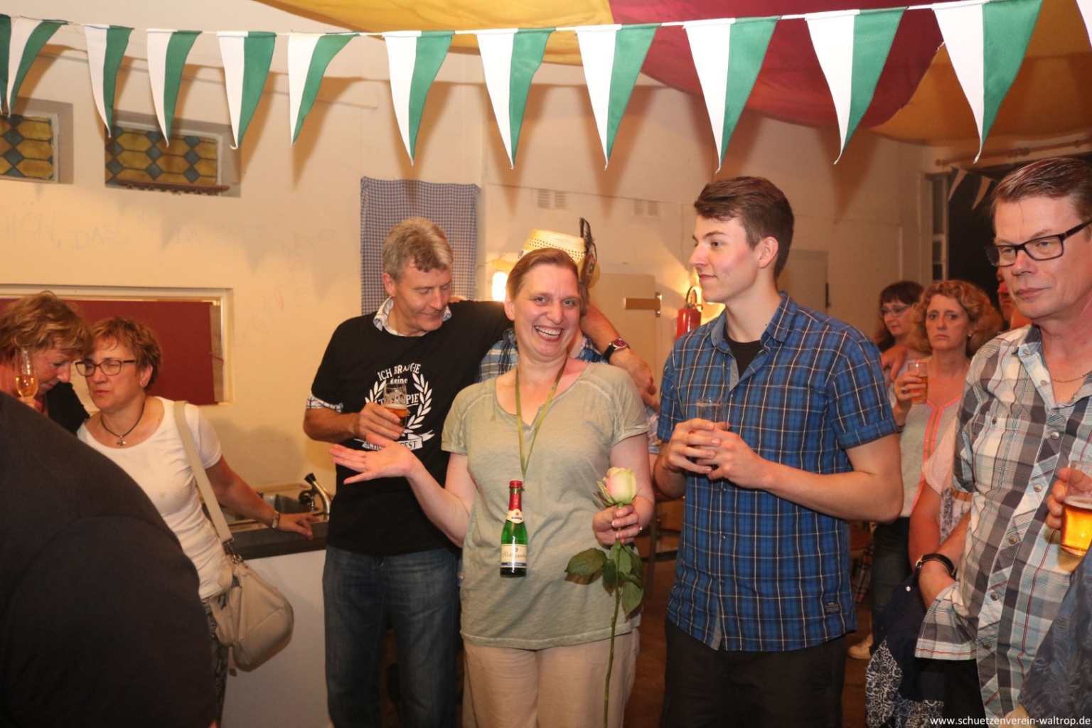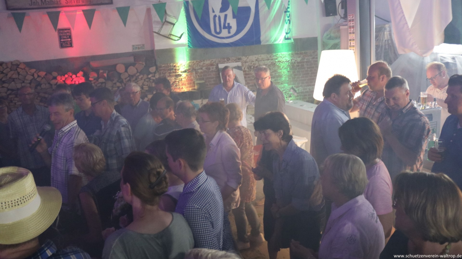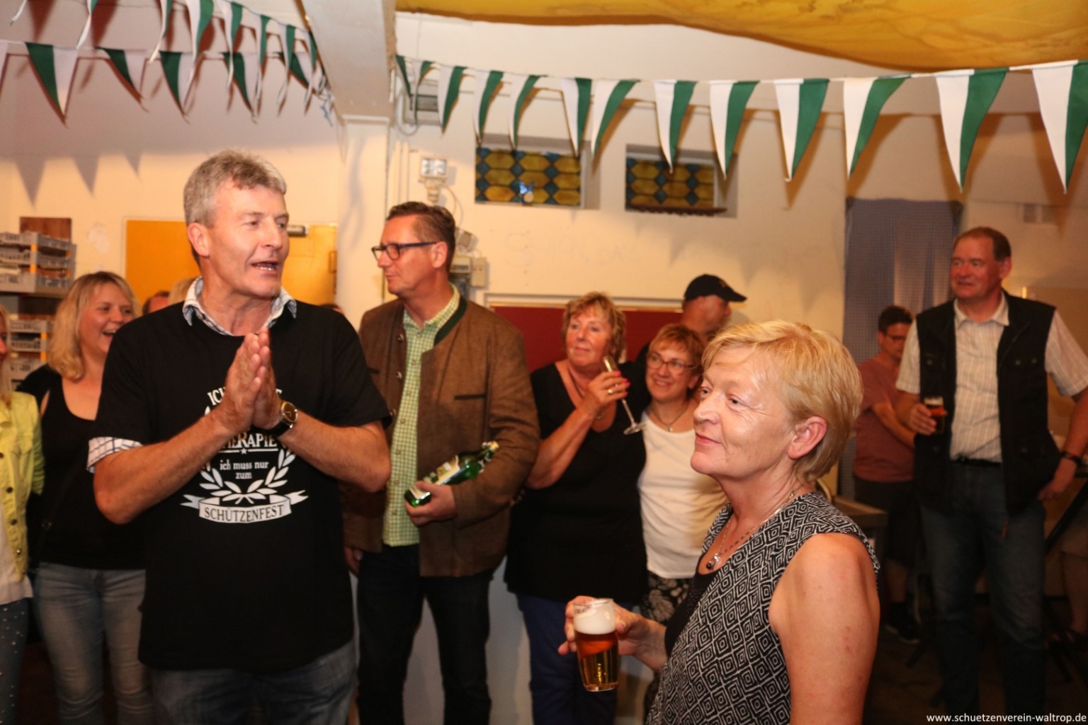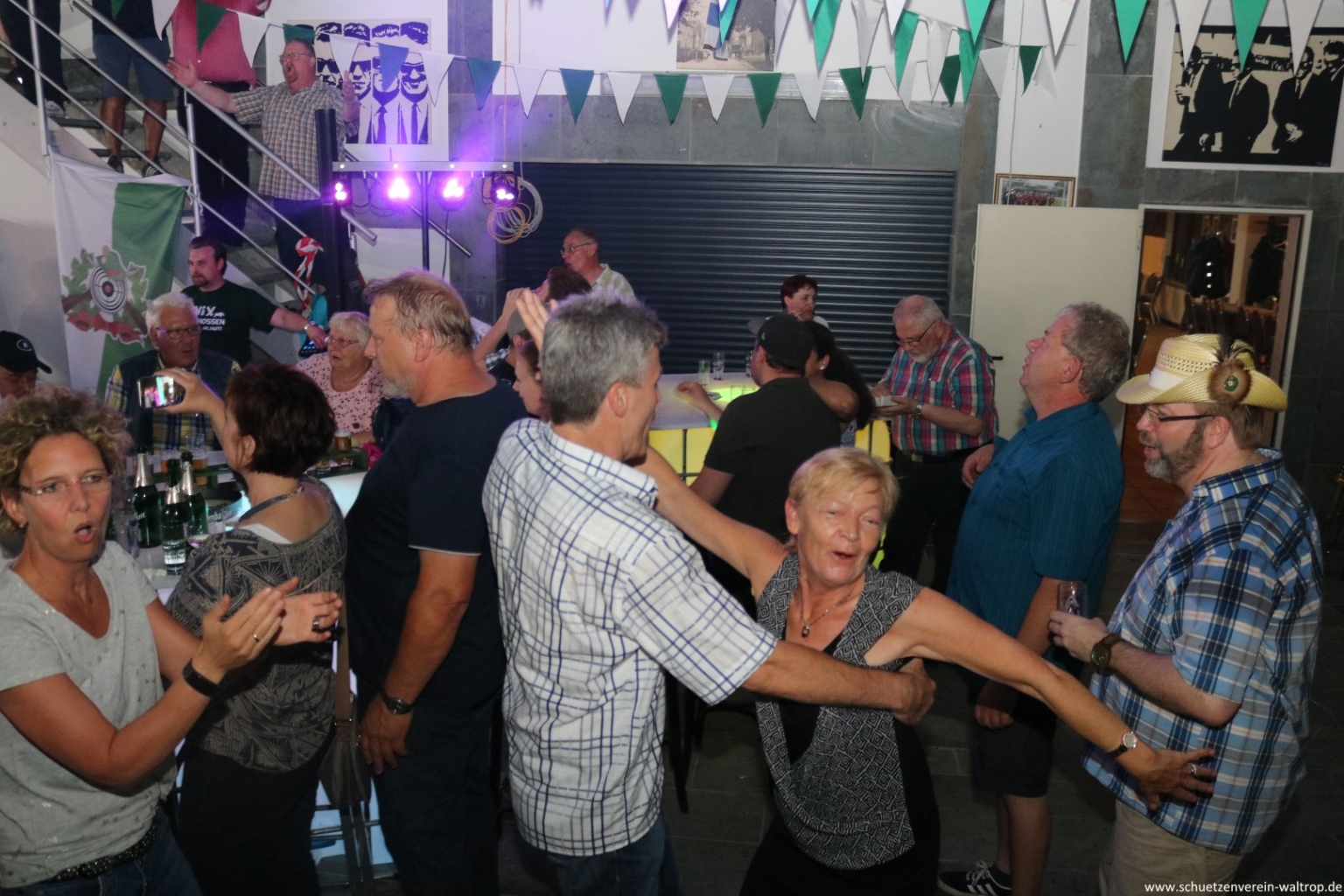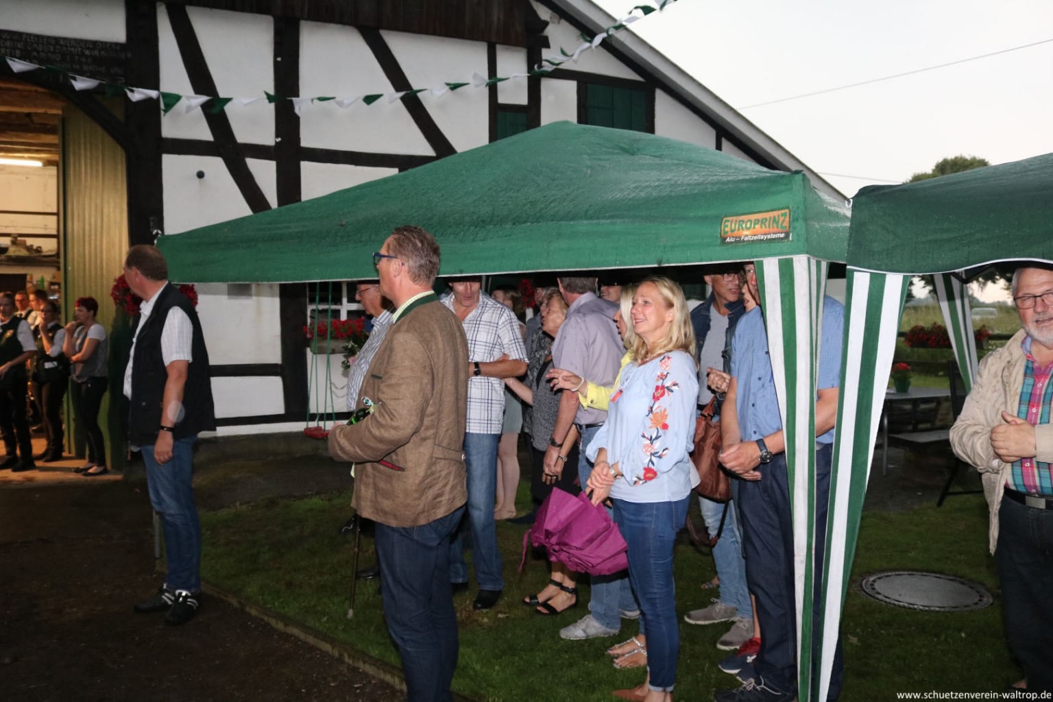 Nach der Verabschiedung und dem Ausmarsch folgte ein nur kurzer Fußweg. Das Ziel war die 2. Kompanie am Kompanielokal bei Sascha Müller. Gekränzt und gefeiert wurde im hinteren Teil in der großen Halle. Über die Dorfmüllerstraße zog der Tross durch ein Spalier von Schützen in die Partyhalle ein. Eingehüllt in Nebel aus der Nebelmaschine gab es im Inneren natürlich auch hier die üblichen Begrüßungen und Präsentübergaben.