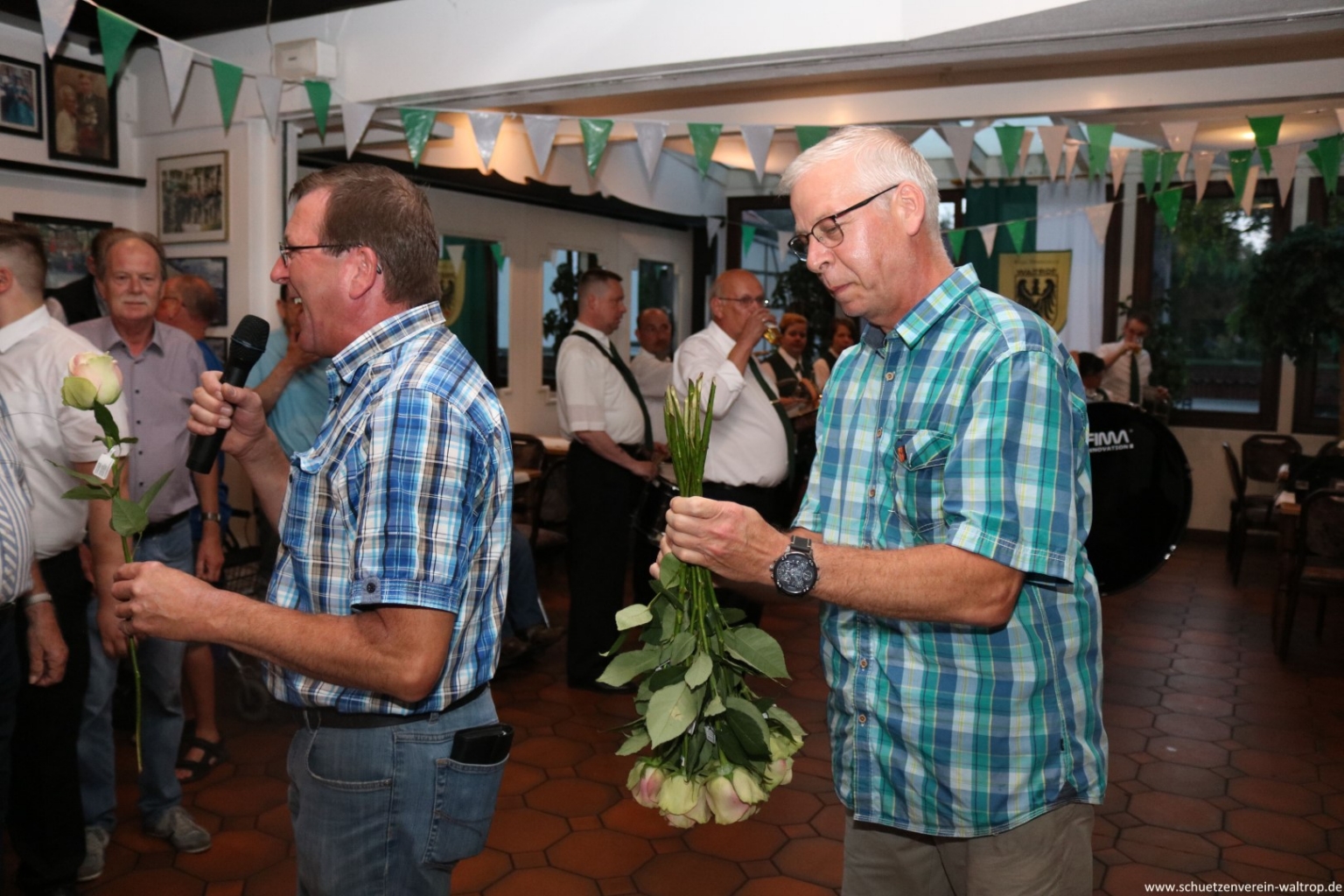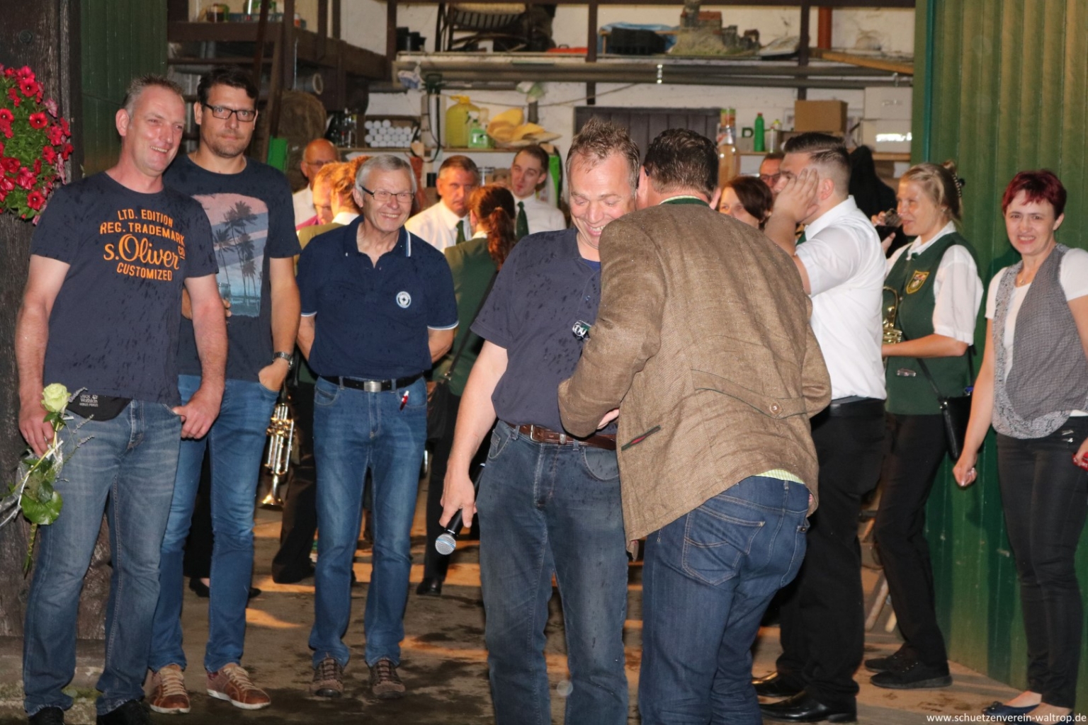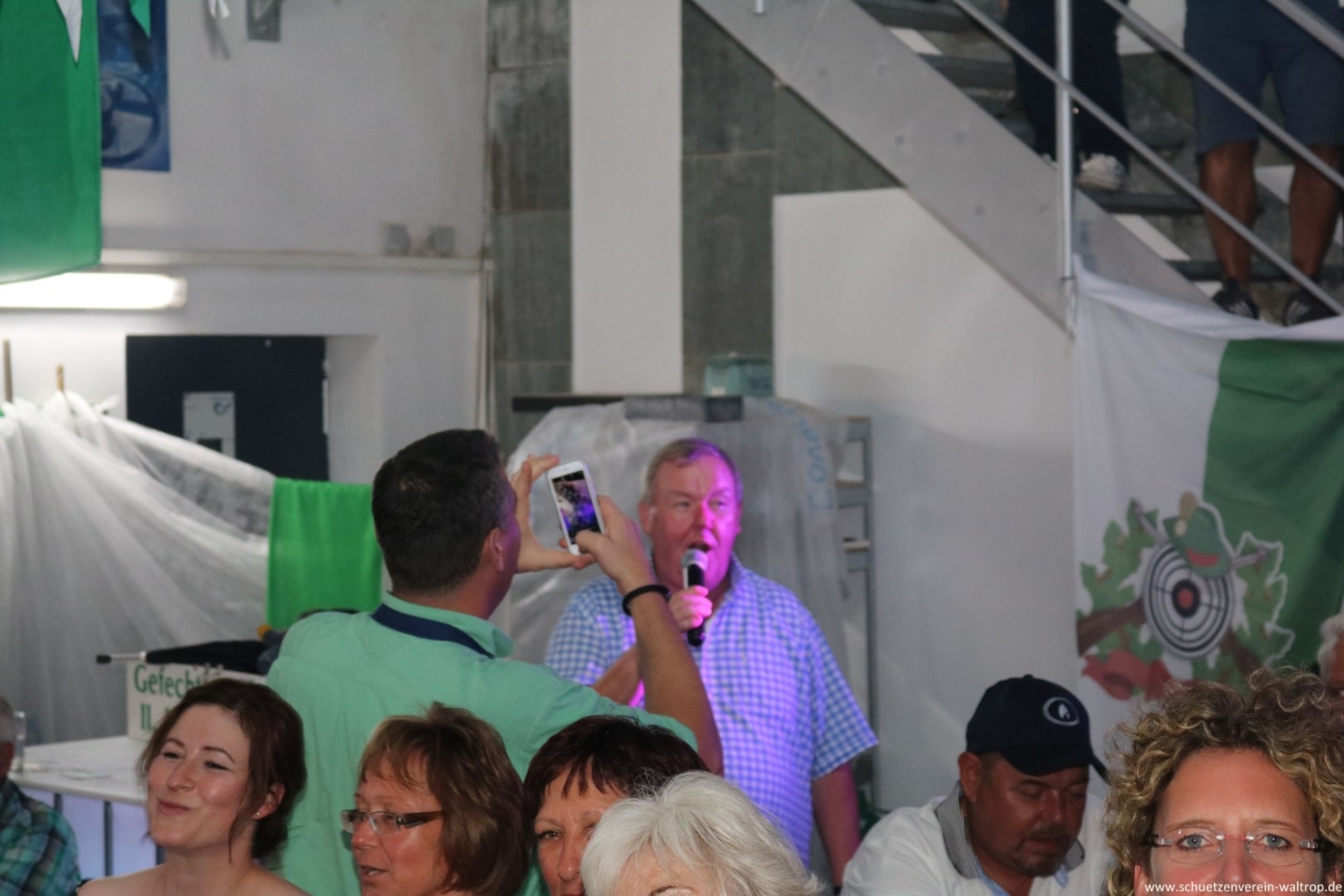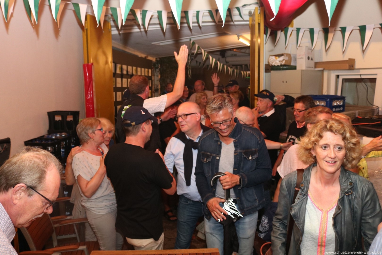 Nach der Verabschiedung und dem Ausmarsch folgte ein nur kurzer Fußweg. Das Ziel war die 2. Kompanie am Kompanielokal bei Sascha Müller. Gekränzt und gefeiert wurde im hinteren Teil in der großen Halle. Über die Dorfmüllerstraße zog der Tross durch ein Spalier von Schützen in die Partyhalle ein. Eingehüllt in Nebel aus der Nebelmaschine gab es im Inneren natürlich auch hier die üblichen Begrüßungen und Präsentübergaben.