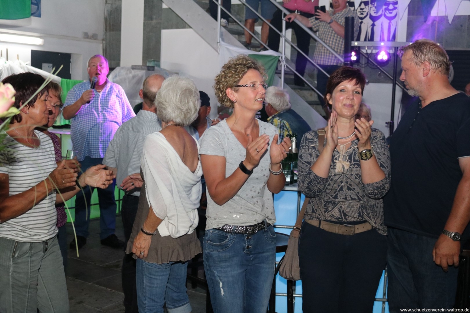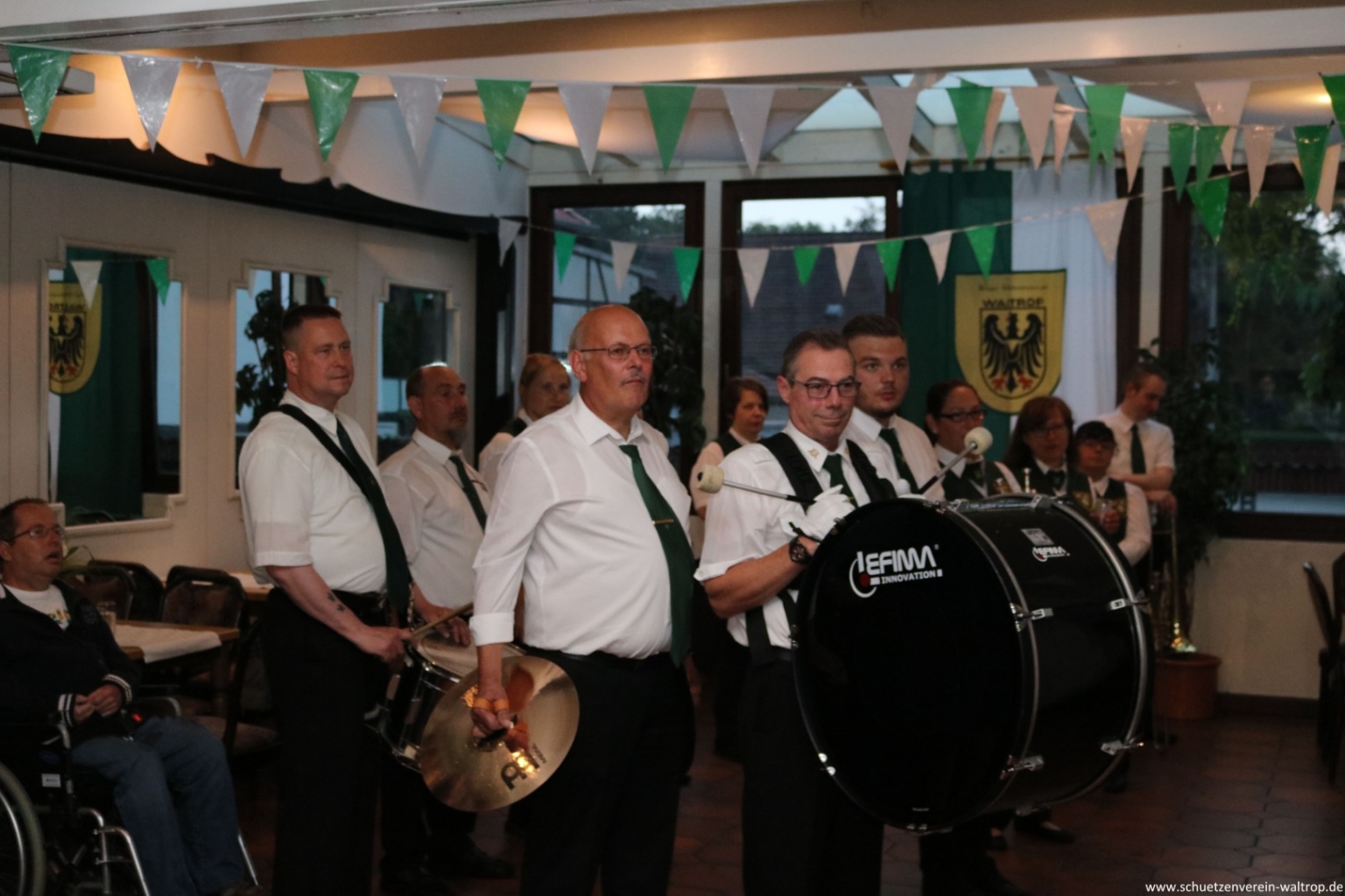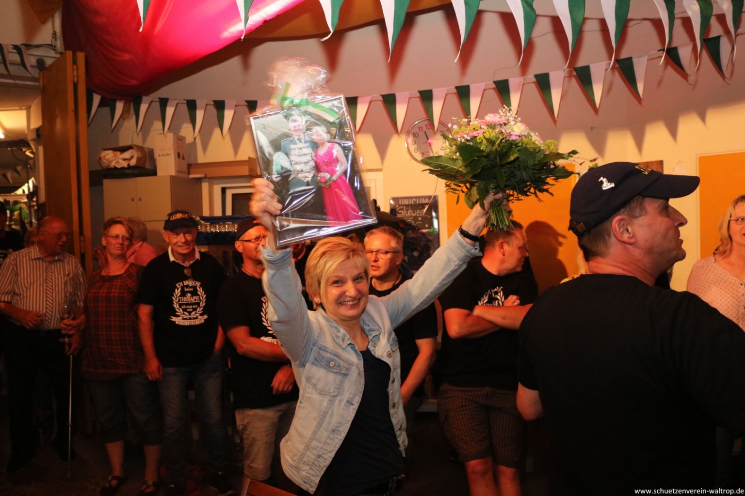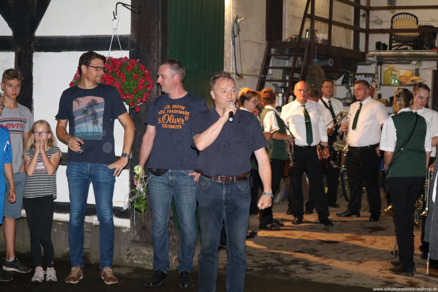 Nach der Verabschiedung und dem Ausmarsch folgte ein nur kurzer Fußweg. Das Ziel war die 2. Kompanie am Kompanielokal bei Sascha Müller. Gekränzt und gefeiert wurde im hinteren Teil in der großen Halle. Über die Dorfmüllerstraße zog der Tross durch ein Spalier von Schützen in die Partyhalle ein. Eingehüllt in Nebel aus der Nebelmaschine gab es im Inneren natürlich auch hier die üblichen Begrüßungen und Präsentübergaben.