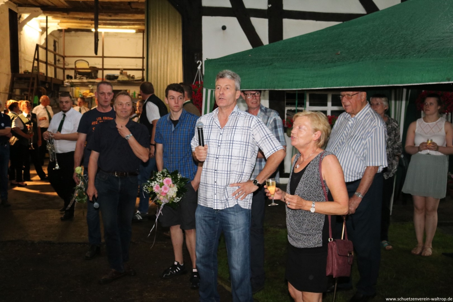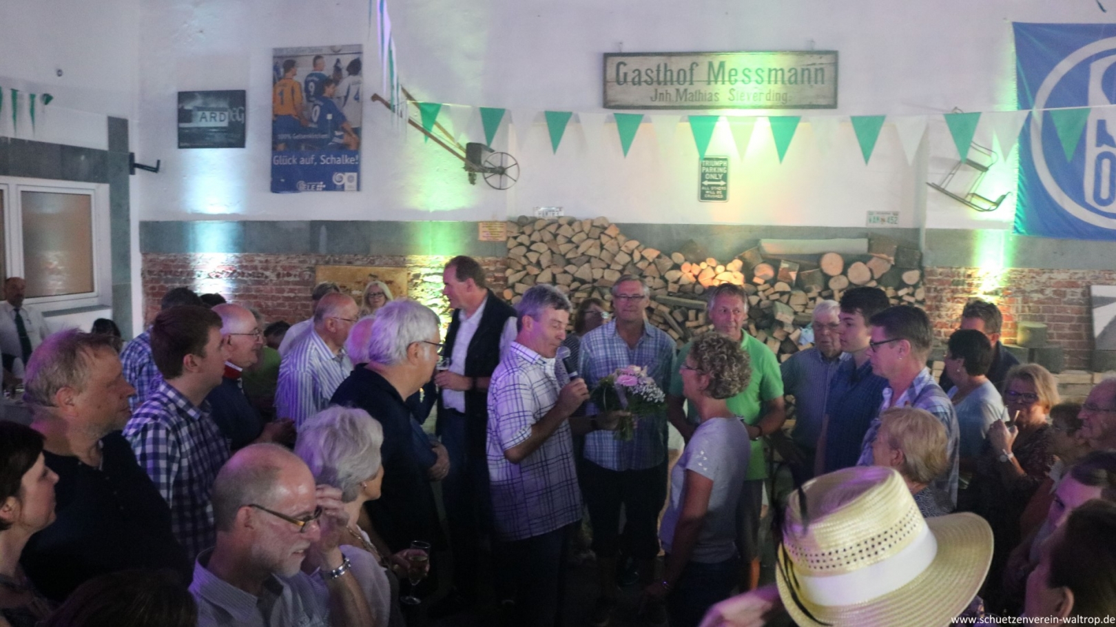 Nächster Halt war das Haus Burbaum, wo die Erste beheimatet ist und ihr Kränzen veranstaltete. Durch ein Spalier der Anwesenden zogen Königspaar und Bataillonsvorstand in den großen Saal ein, wo Hauptmann Vitus Bülhoff bereits wartete und den ankommenden Zug begrüßte. Auch hier gab es neben den kurzen Ansprachen natürlich auch wieder die üblichen Präsente.