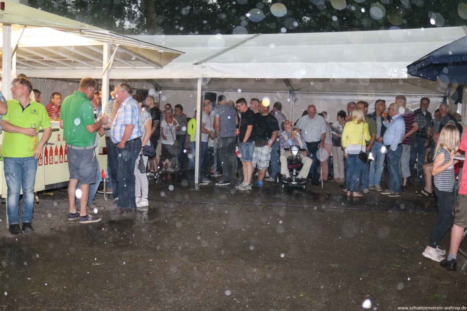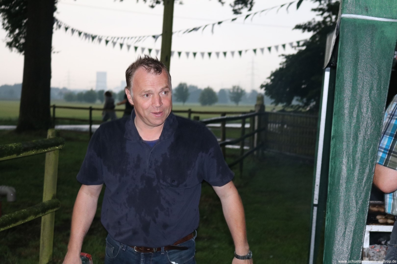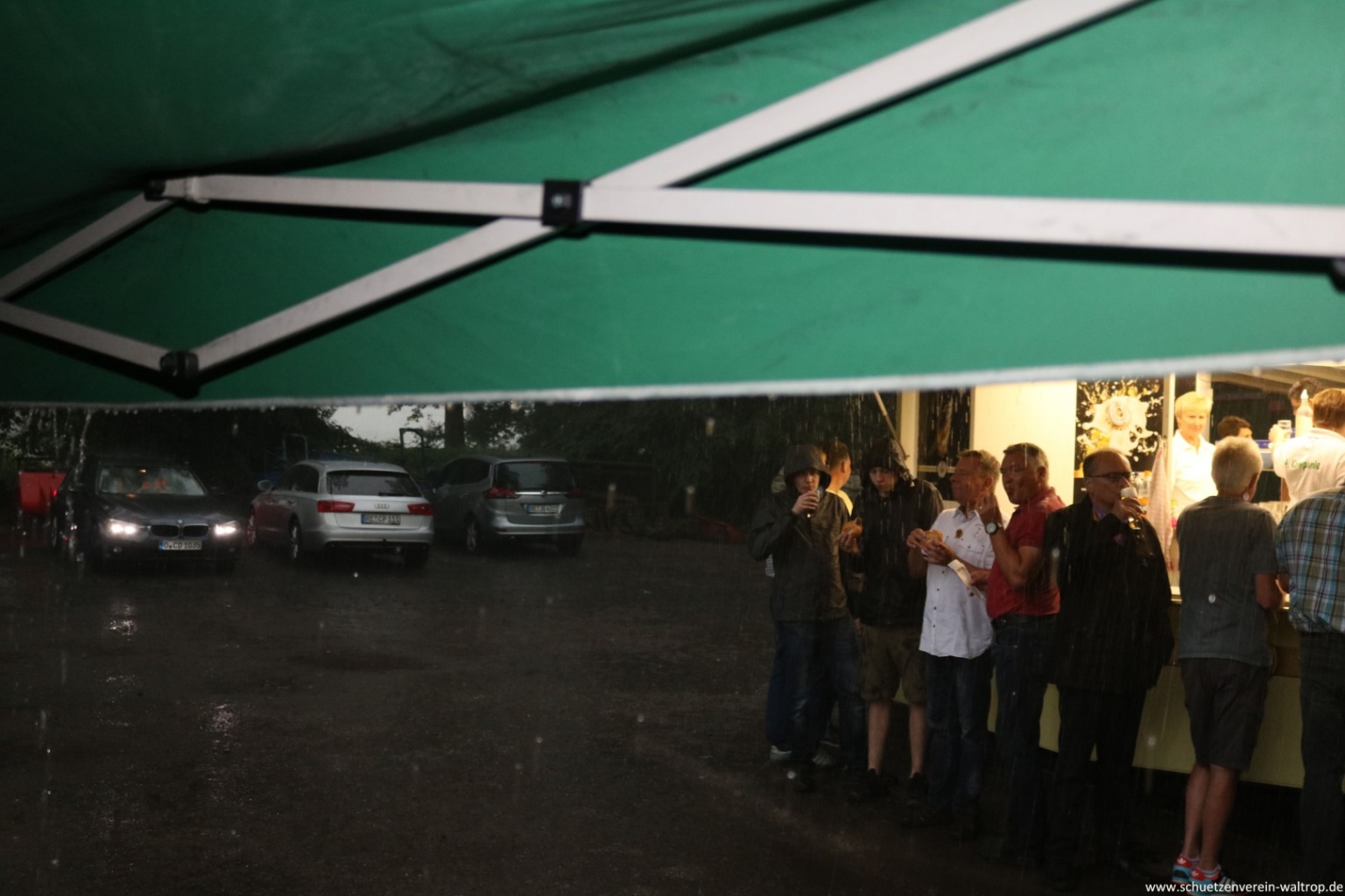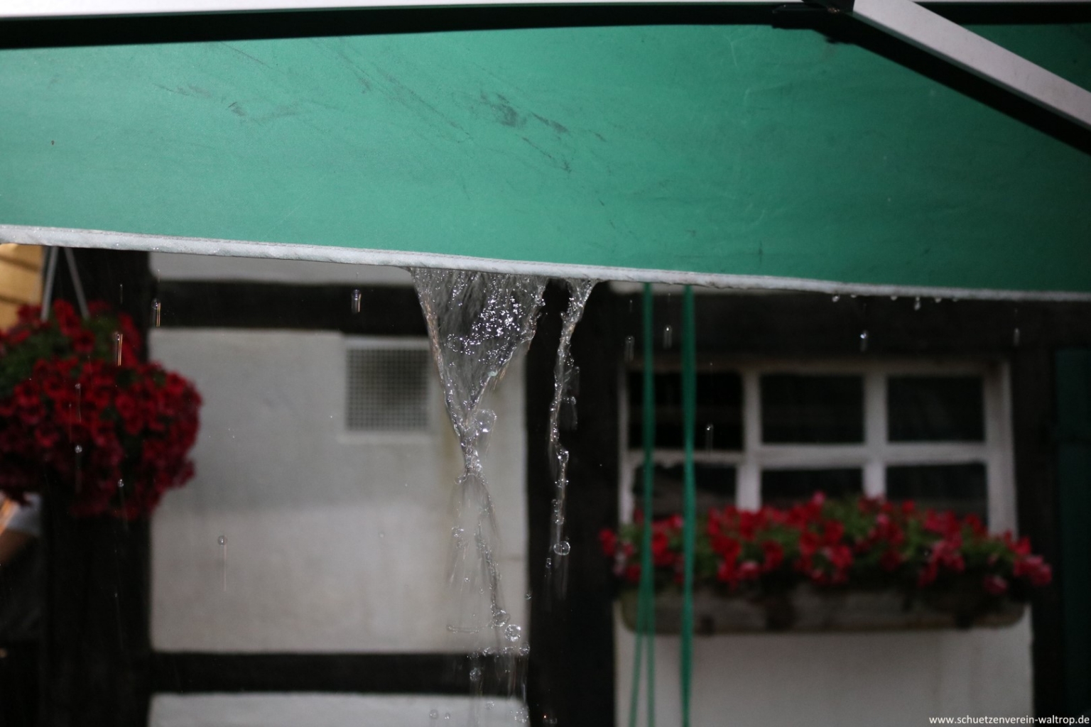 Der Himmel allerdings ließ es bereits erahnen, das nächste Unwetter braute sich zusammen und zog mit Blitz und Donner im Hintergrund auf. Die Ansprachen und Begrüßungen konnten noch halbwegs trocken erfolgen, kurz darauf goss es dann in strömen. Scheune, Zelt, das Dach des Bierwagens und einige Pavillons boten immerhin genügend Unterstellmöglichkeiten. Einen feucht-fröhlichen Abend hatte sich zwar jeder gewünscht, aber doch eher in anderer Form...