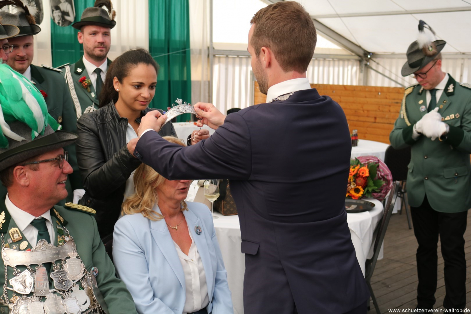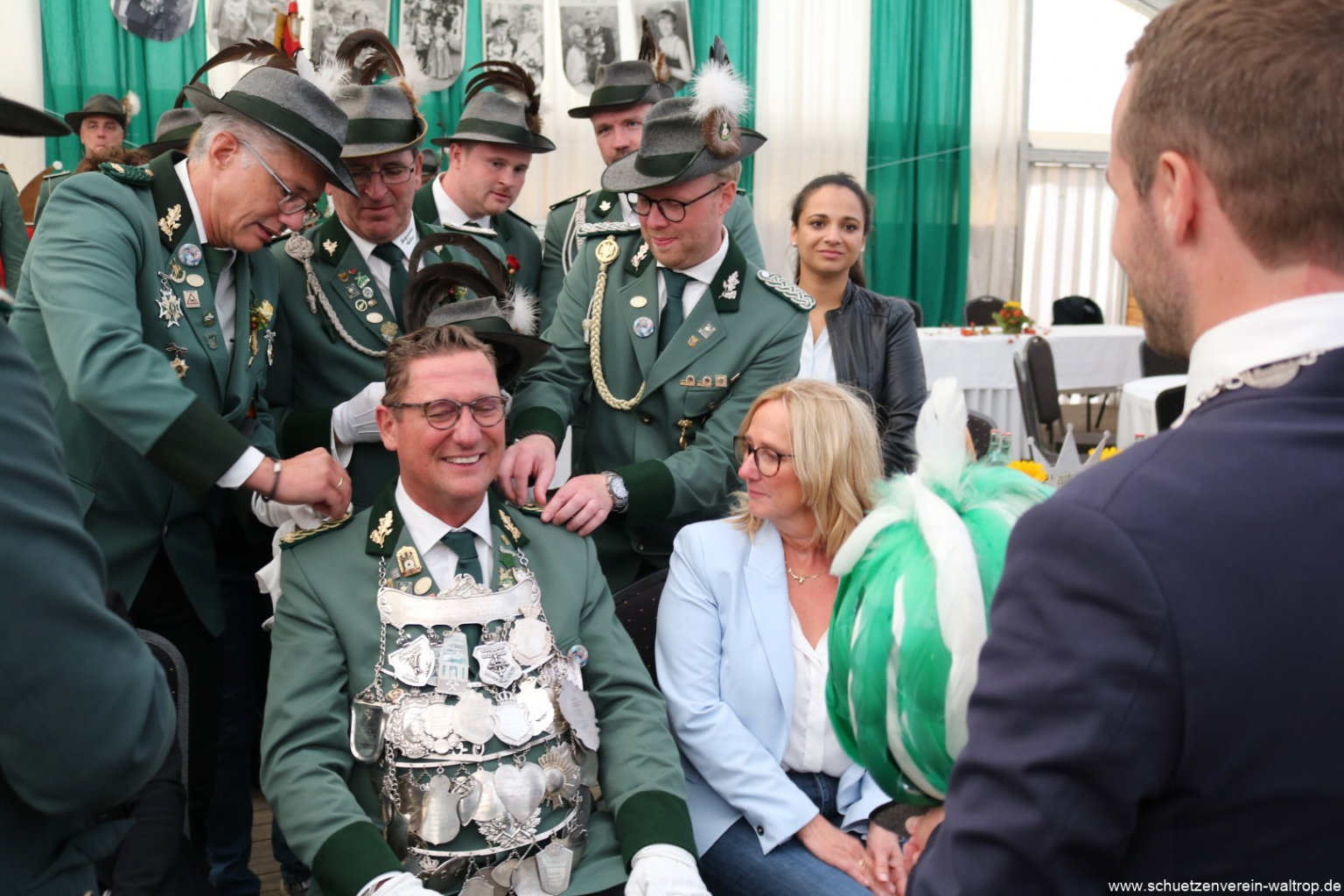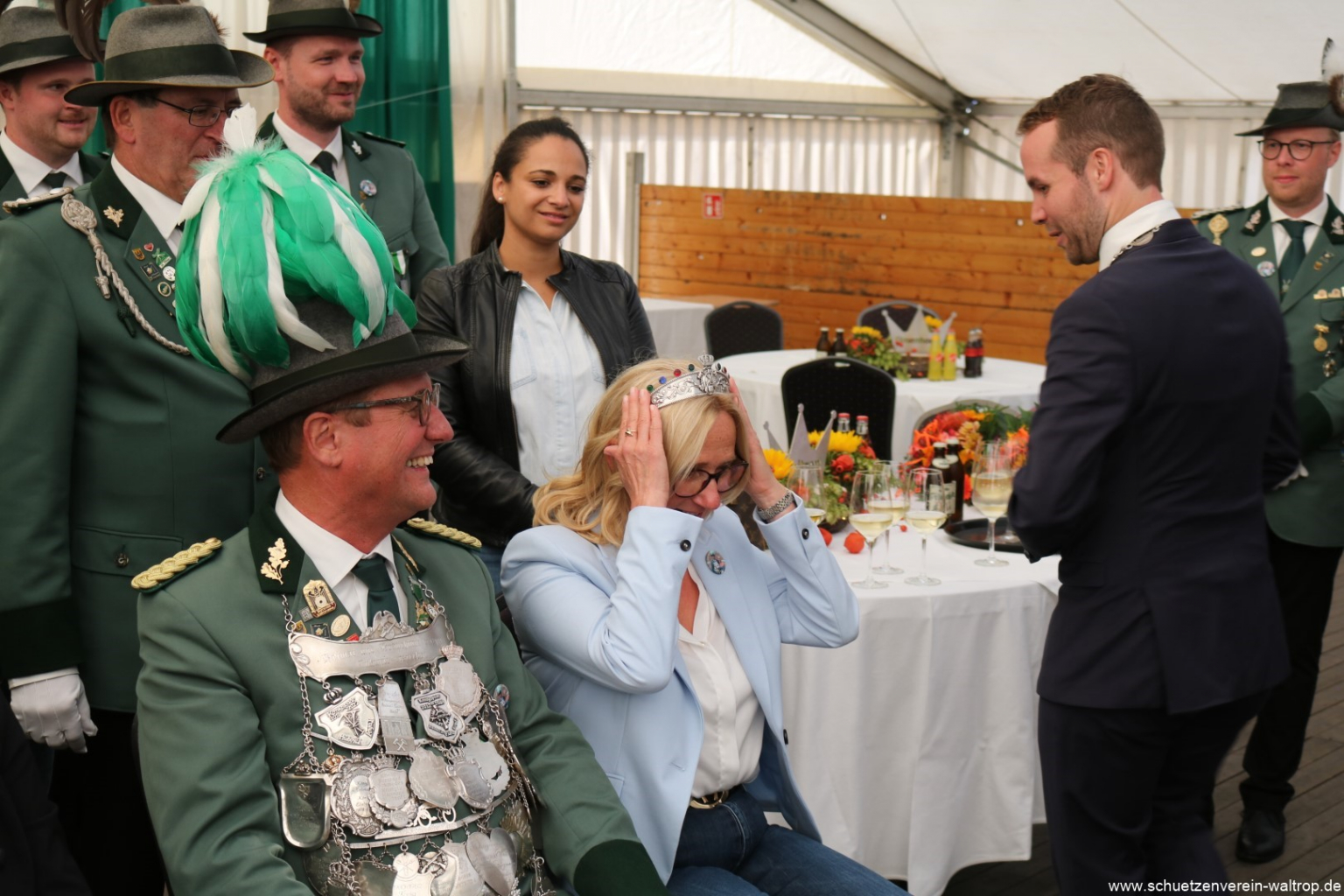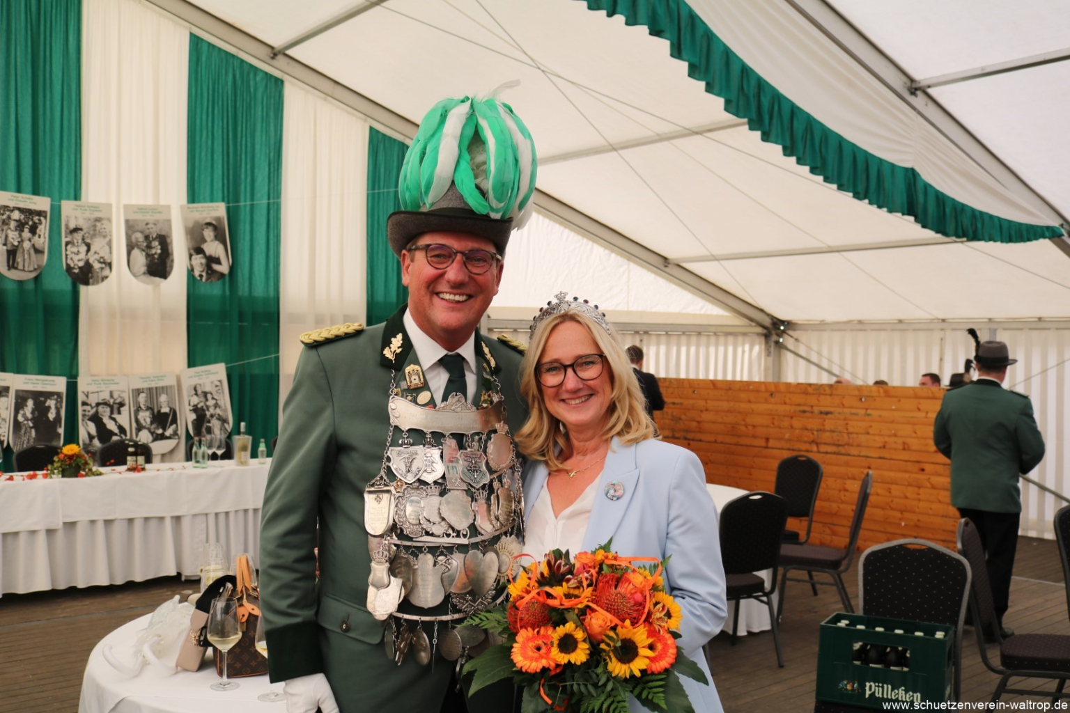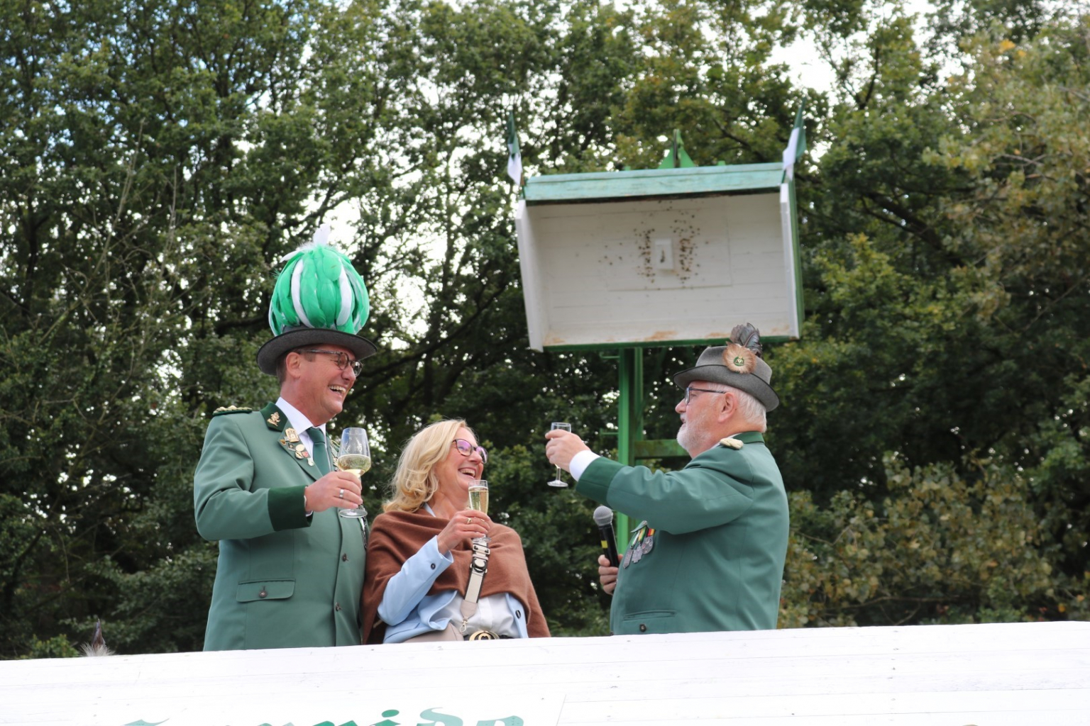 Beim Schießen um die Königswürde waren am Schluss noch zwei ernsthafte Anwärter im Rennen: Ludger Grothus und Karsten Pilger. In einem spannenden Schießen landete Ludger dabei den entscheidenden Schuss und holte den Vogel von der Stange. Zusammen mit seiner Frau Claudia regieren beide nun als Ludger I. und Claudia I.! Die Krönung im Festzelt erfolgte anschließend durch Bürgermeister Marcel Mittelbach.