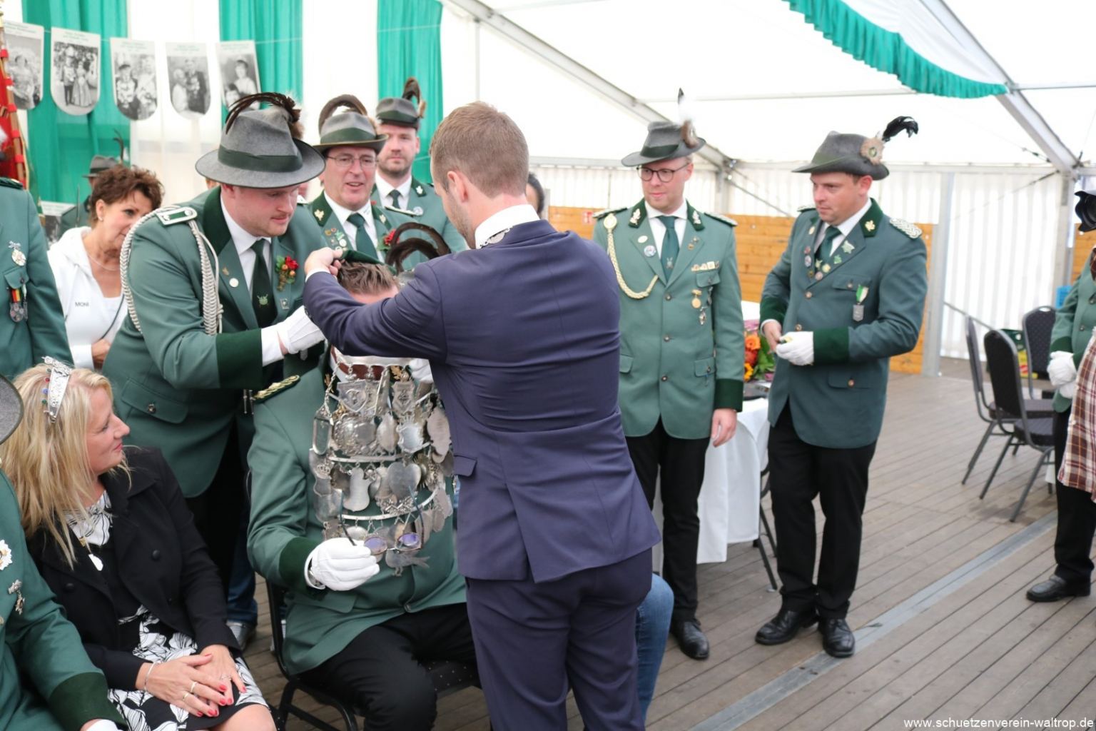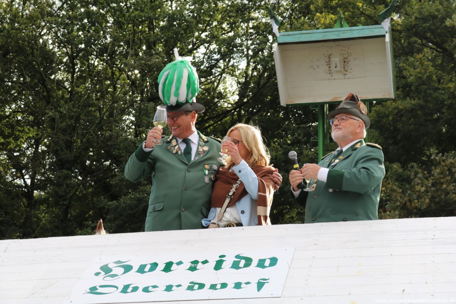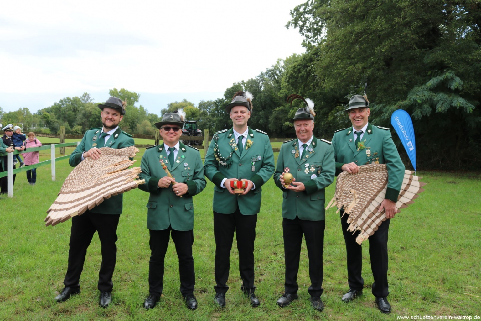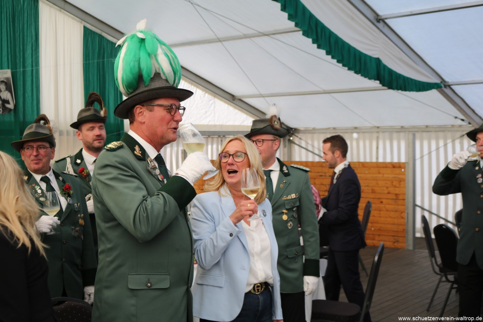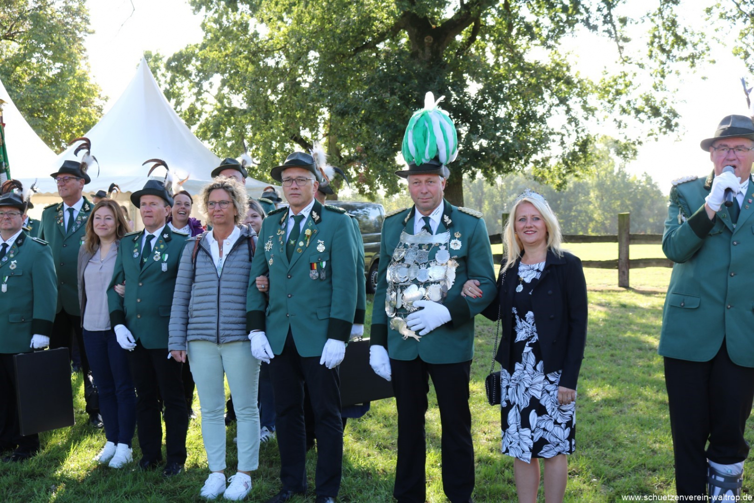 Beim Schießen um die Königswürde waren am Schluss noch zwei ernsthafte Anwärter im Rennen: Ludger Grothus und Karsten Pilger. In einem spannenden Schießen landete Ludger dabei den entscheidenden Schuss und holte den Vogel von der Stange. Zusammen mit seiner Frau Claudia regieren beide nun als Ludger I. und Claudia I.! Die Krönung im Festzelt erfolgte anschließend durch Bürgermeister Marcel Mittelbach.
