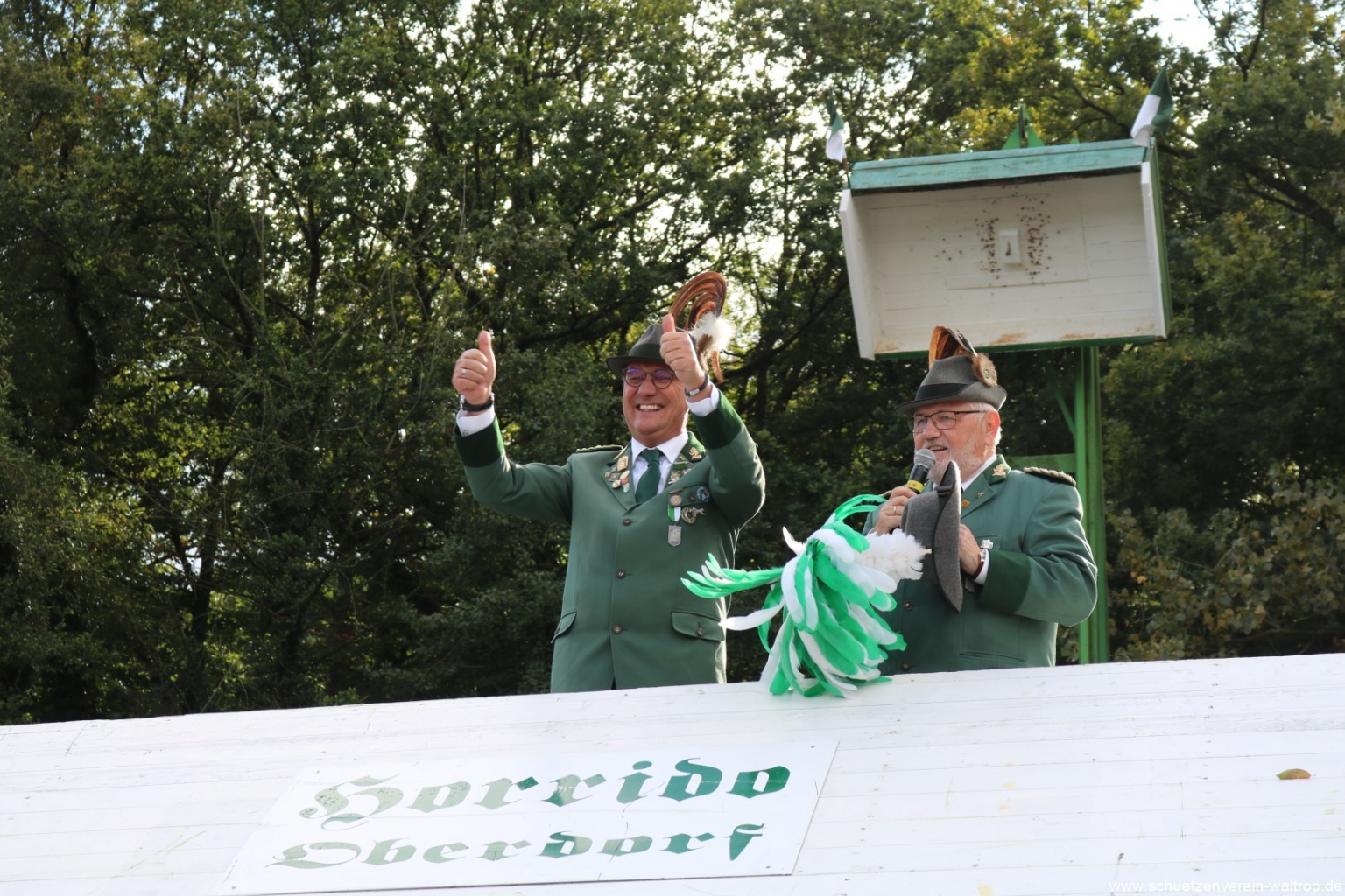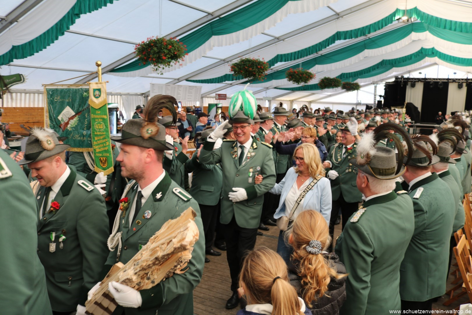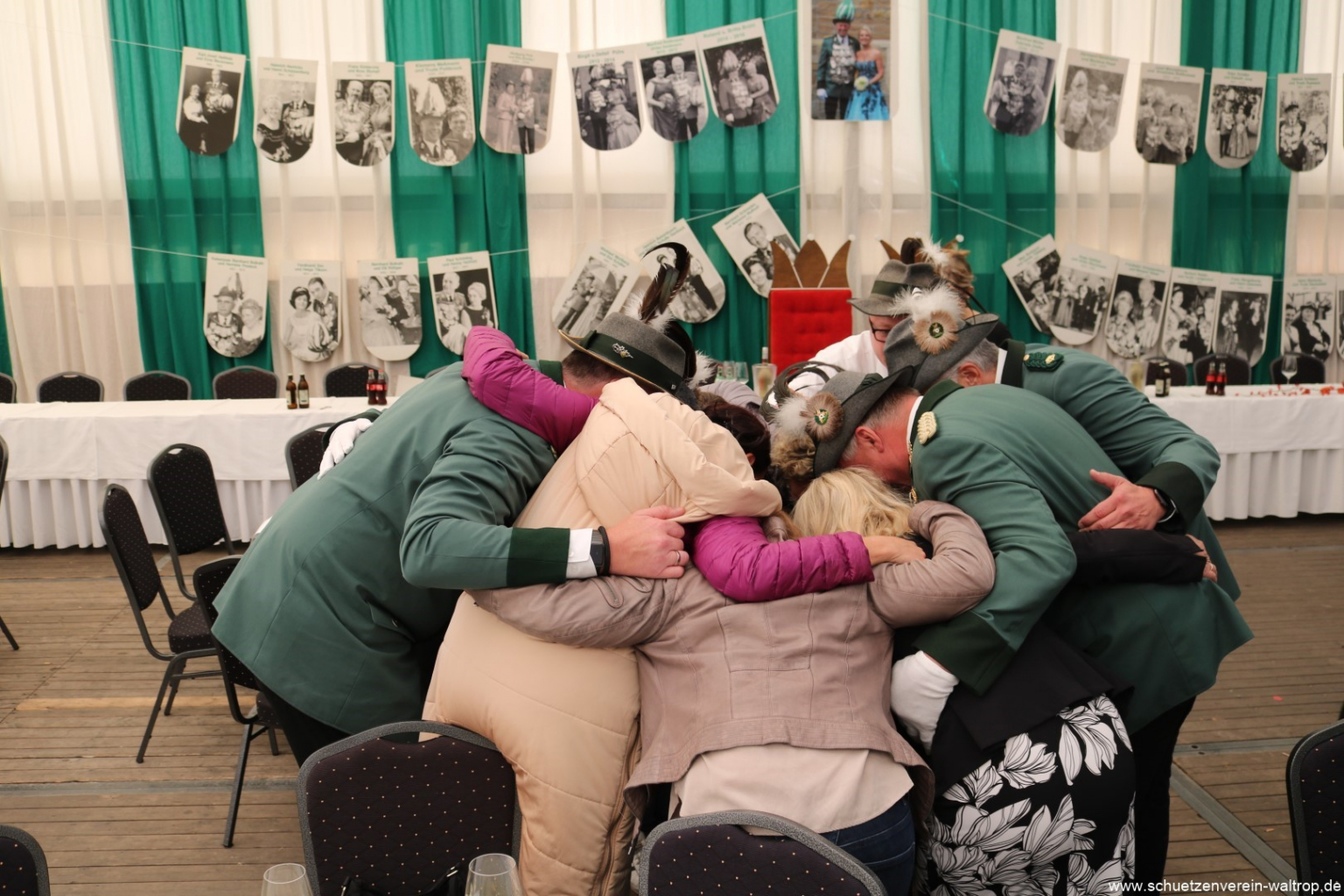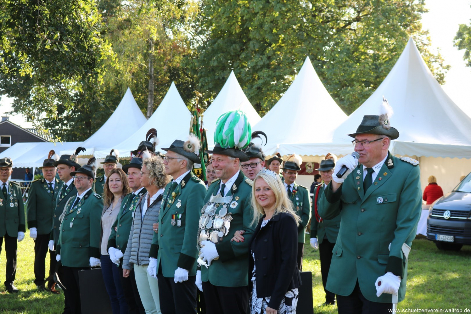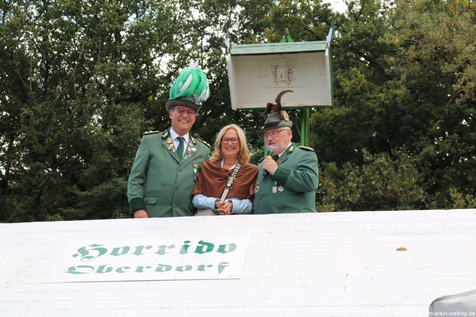 Beim Schießen um die Königswürde waren am Schluss noch zwei ernsthafte Anwärter im Rennen: Ludger Grothus und Karsten Pilger. In einem spannenden Schießen landete Ludger dabei den entscheidenden Schuss und holte den Vogel von der Stange. Zusammen mit seiner Frau Claudia regieren beide nun als Ludger I. und Claudia I.! Die Krönung im Festzelt erfolgte anschließend durch Bürgermeister Marcel Mittelbach.