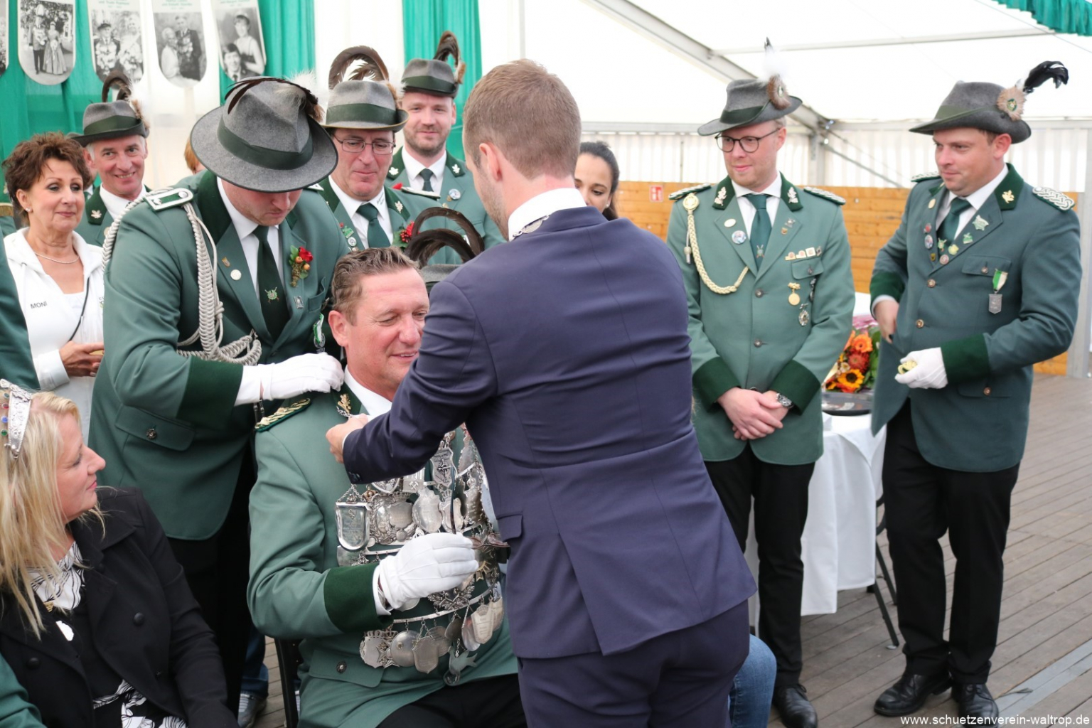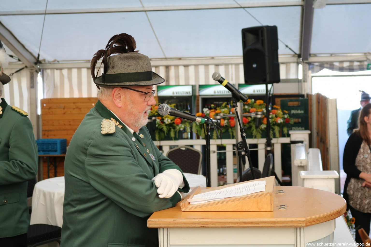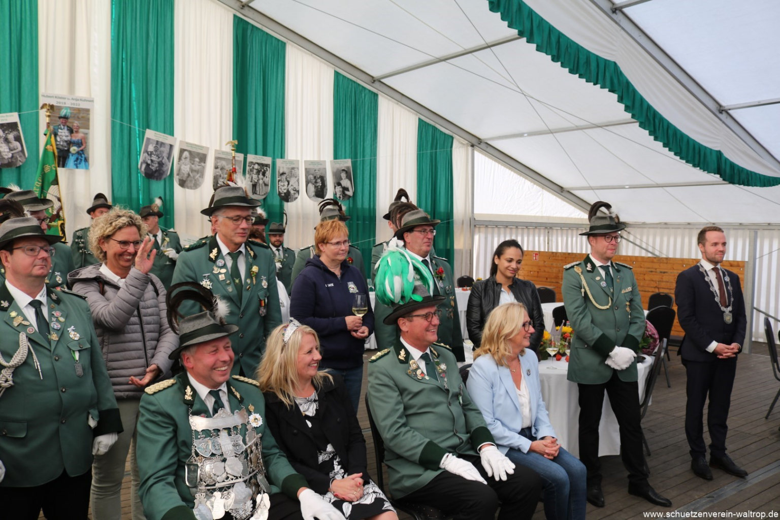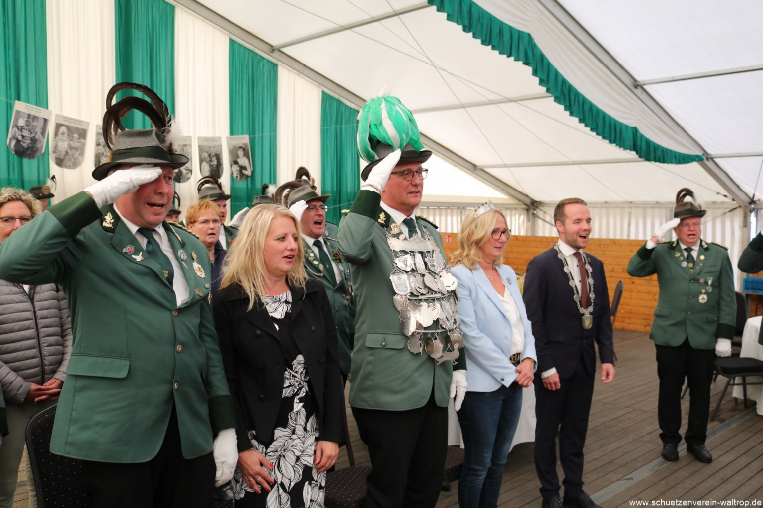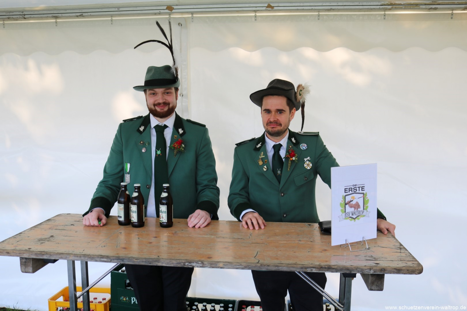 Beim Schießen um die Königswürde waren am Schluss noch zwei ernsthafte Anwärter im Rennen: Ludger Grothus und Karsten Pilger. In einem spannenden Schießen landete Ludger dabei den entscheidenden Schuss und holte den Vogel von der Stange. Zusammen mit seiner Frau Claudia regieren beide nun als Ludger I. und Claudia I.! Die Krönung im Festzelt erfolgte anschließend durch Bürgermeister Marcel Mittelbach.