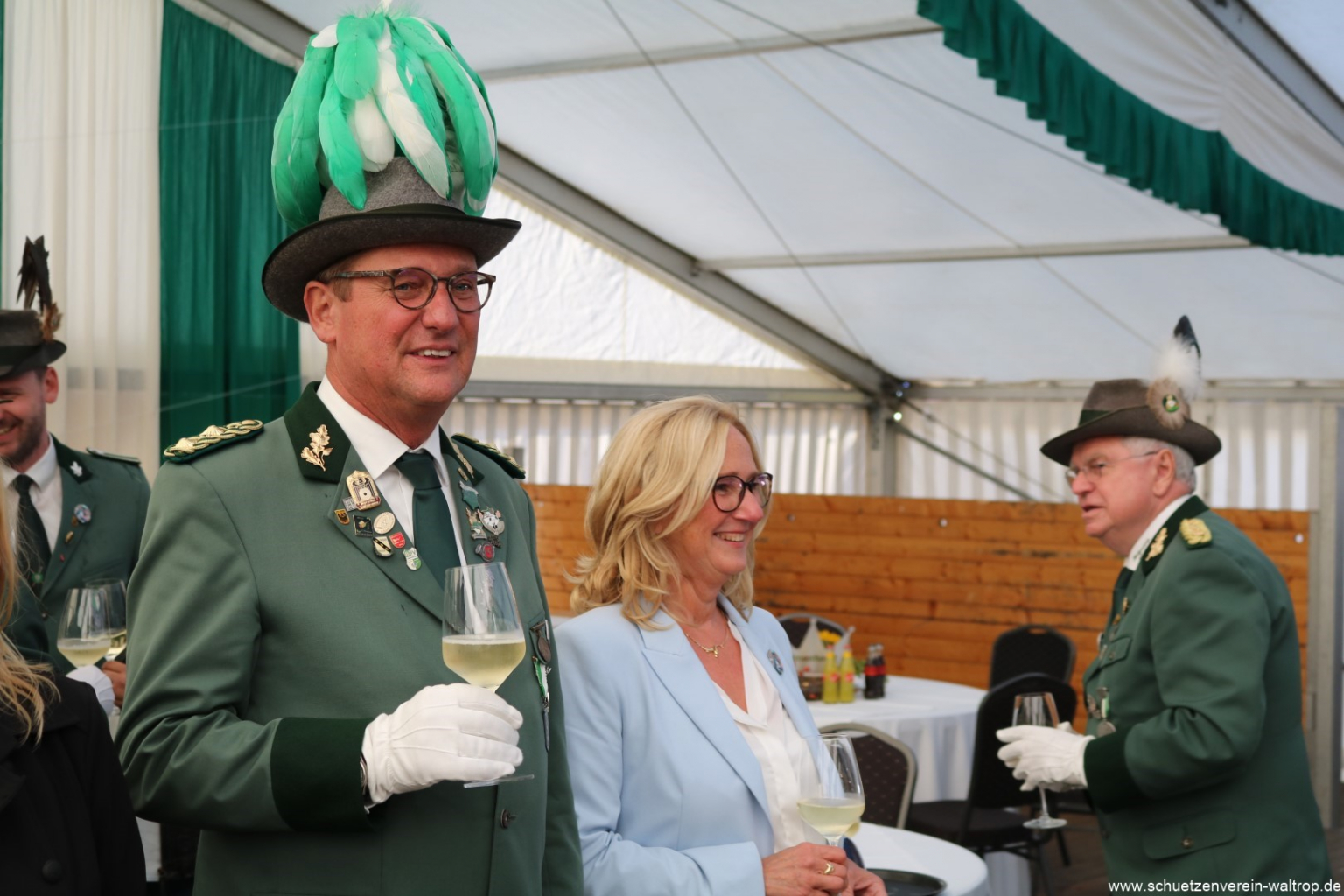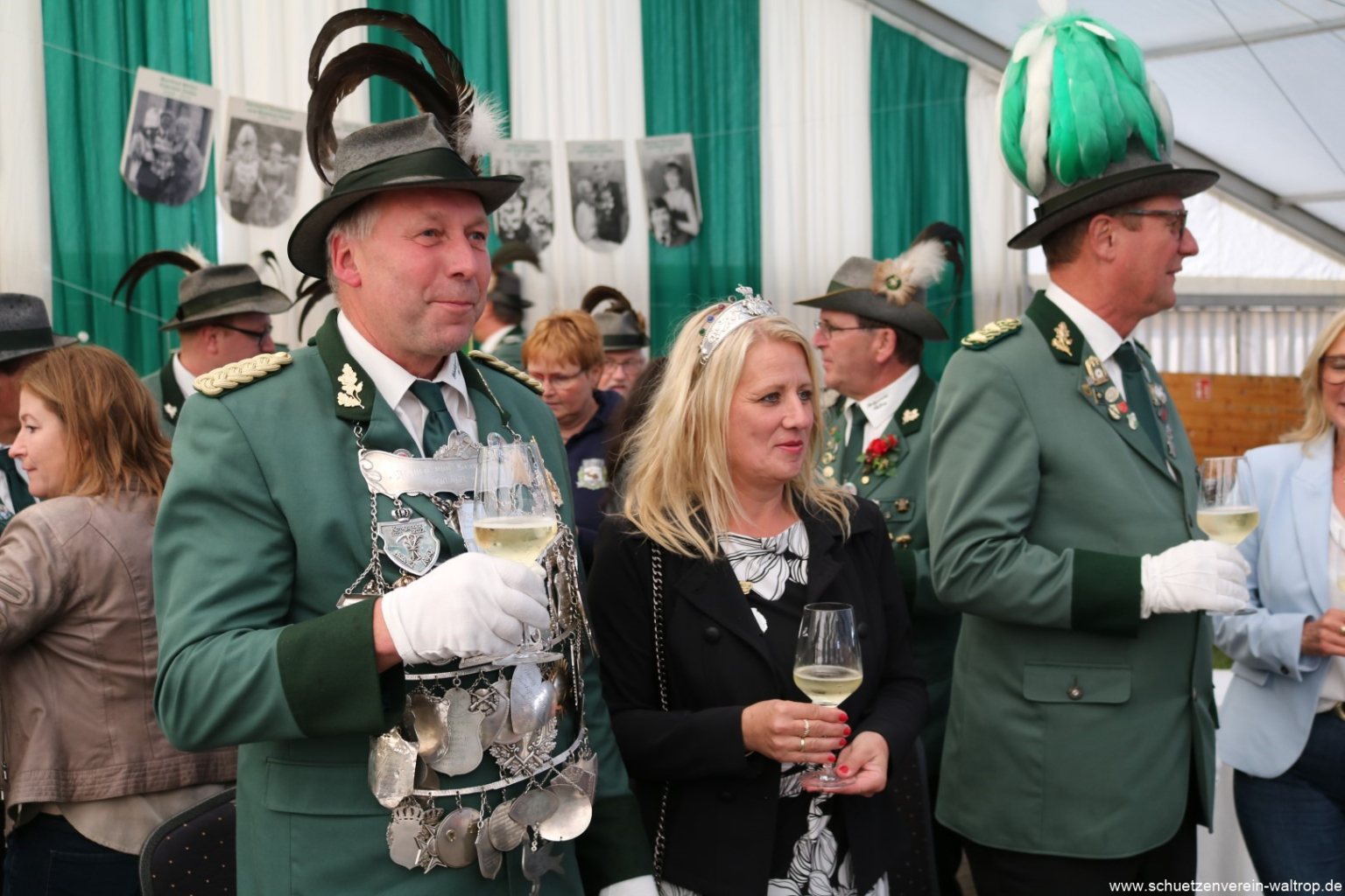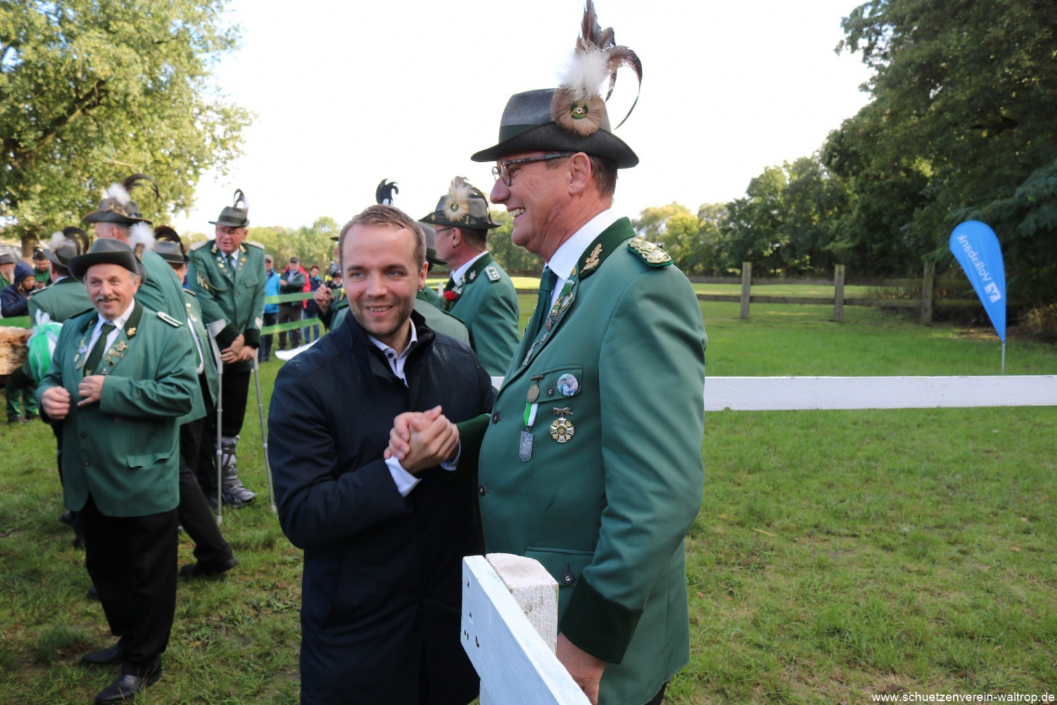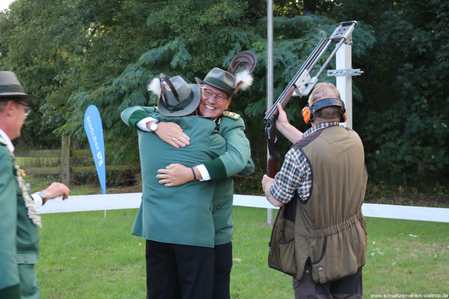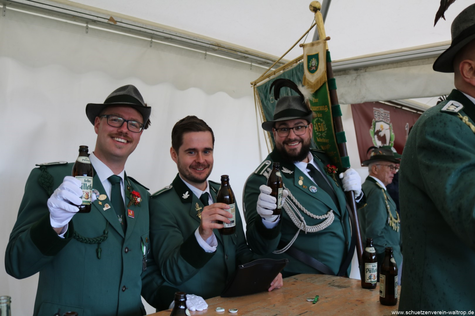 Beim Schießen um die Königswürde waren am Schluss noch zwei ernsthafte Anwärter im Rennen: Ludger Grothus und Karsten Pilger. In einem spannenden Schießen landete Ludger dabei den entscheidenden Schuss und holte den Vogel von der Stange. Zusammen mit seiner Frau Claudia regieren beide nun als Ludger I. und Claudia I.! Die Krönung im Festzelt erfolgte anschließend durch Bürgermeister Marcel Mittelbach.