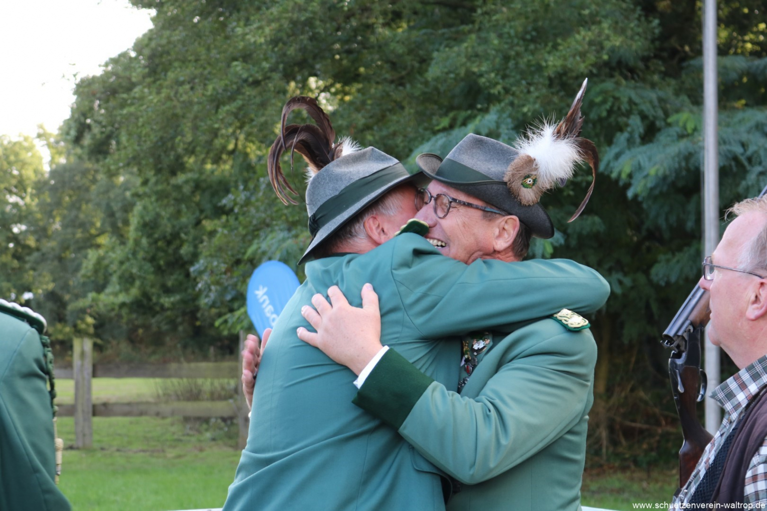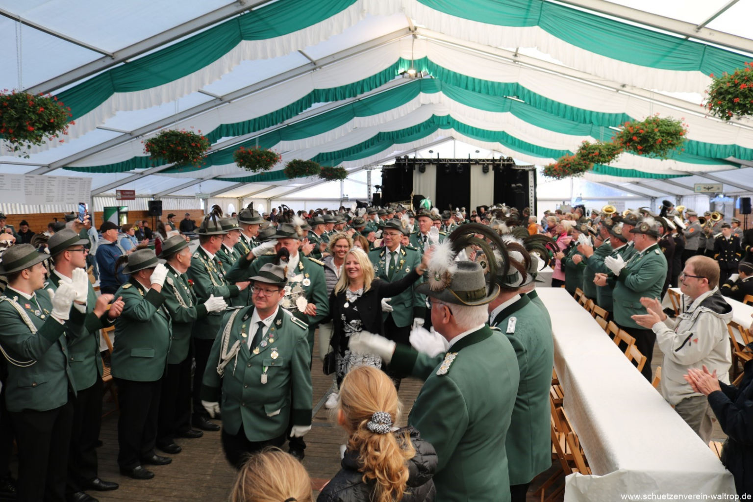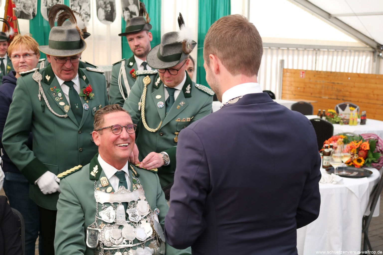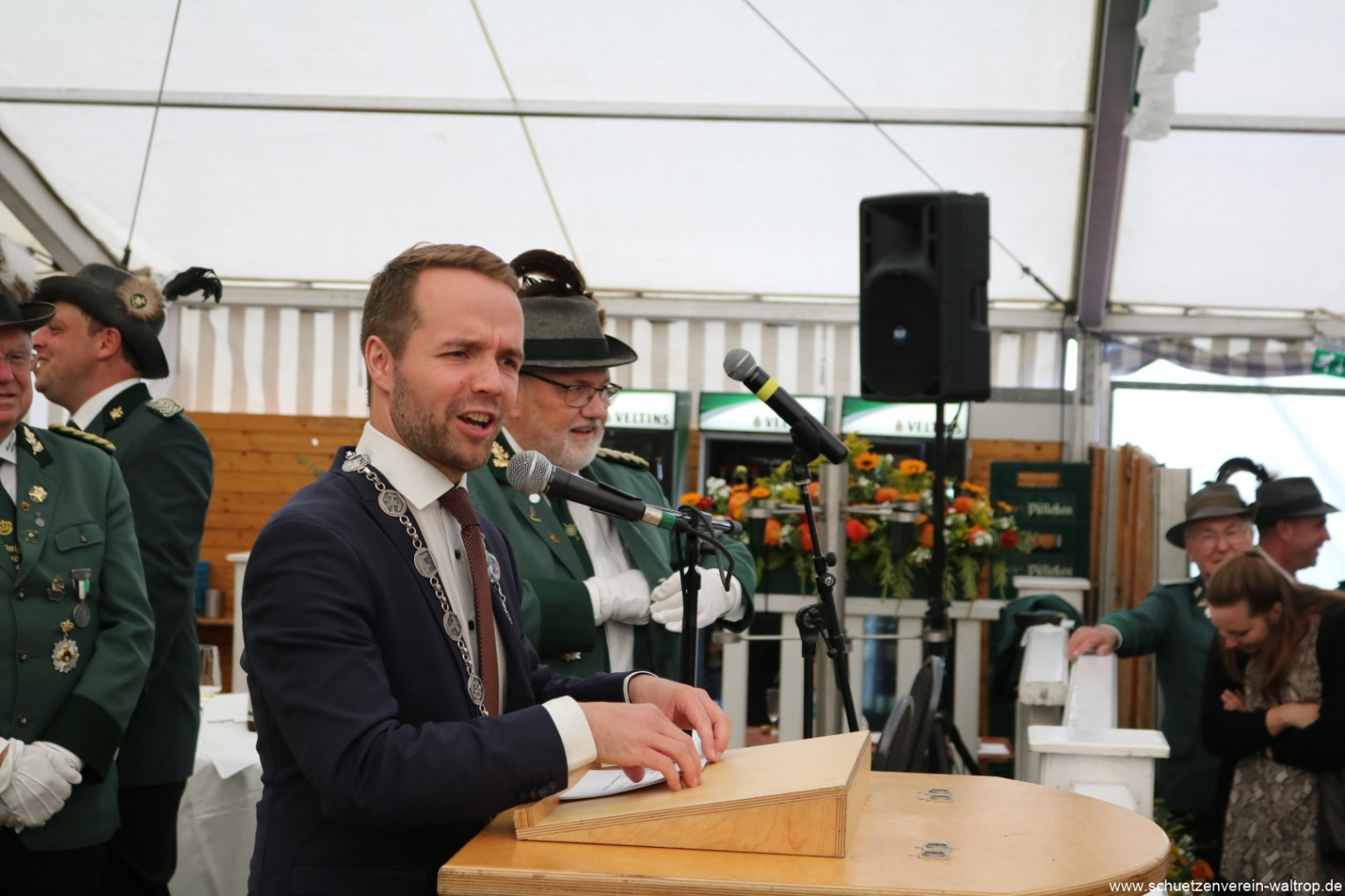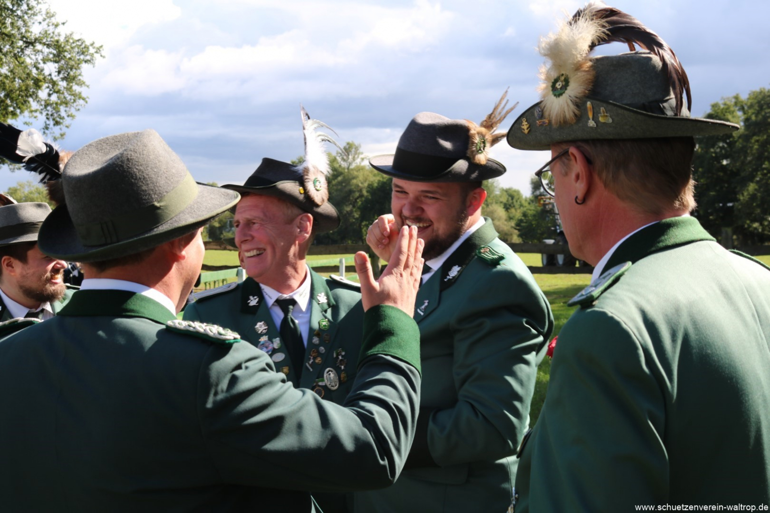 Beim Schießen um die Königswürde waren am Schluss noch zwei ernsthafte Anwärter im Rennen: Ludger Grothus und Karsten Pilger. In einem spannenden Schießen landete Ludger dabei den entscheidenden Schuss und holte den Vogel von der Stange. Zusammen mit seiner Frau Claudia regieren beide nun als Ludger I. und Claudia I.! Die Krönung im Festzelt erfolgte anschließend durch Bürgermeister Marcel Mittelbach.