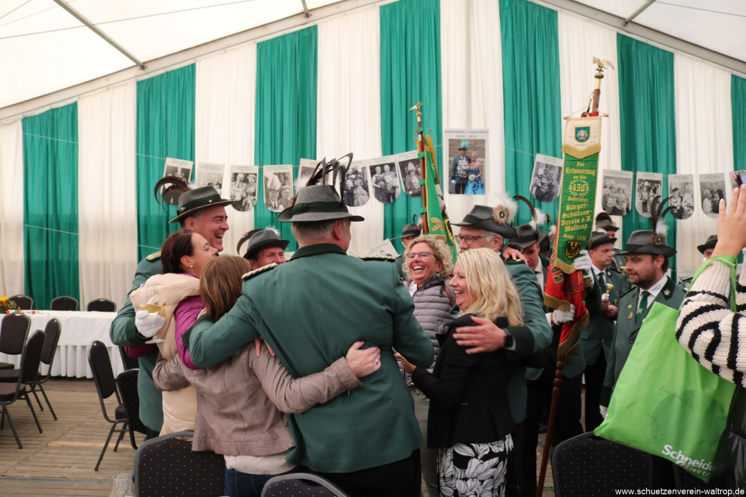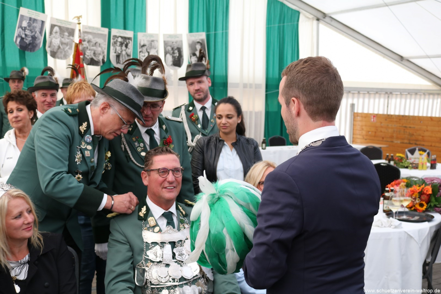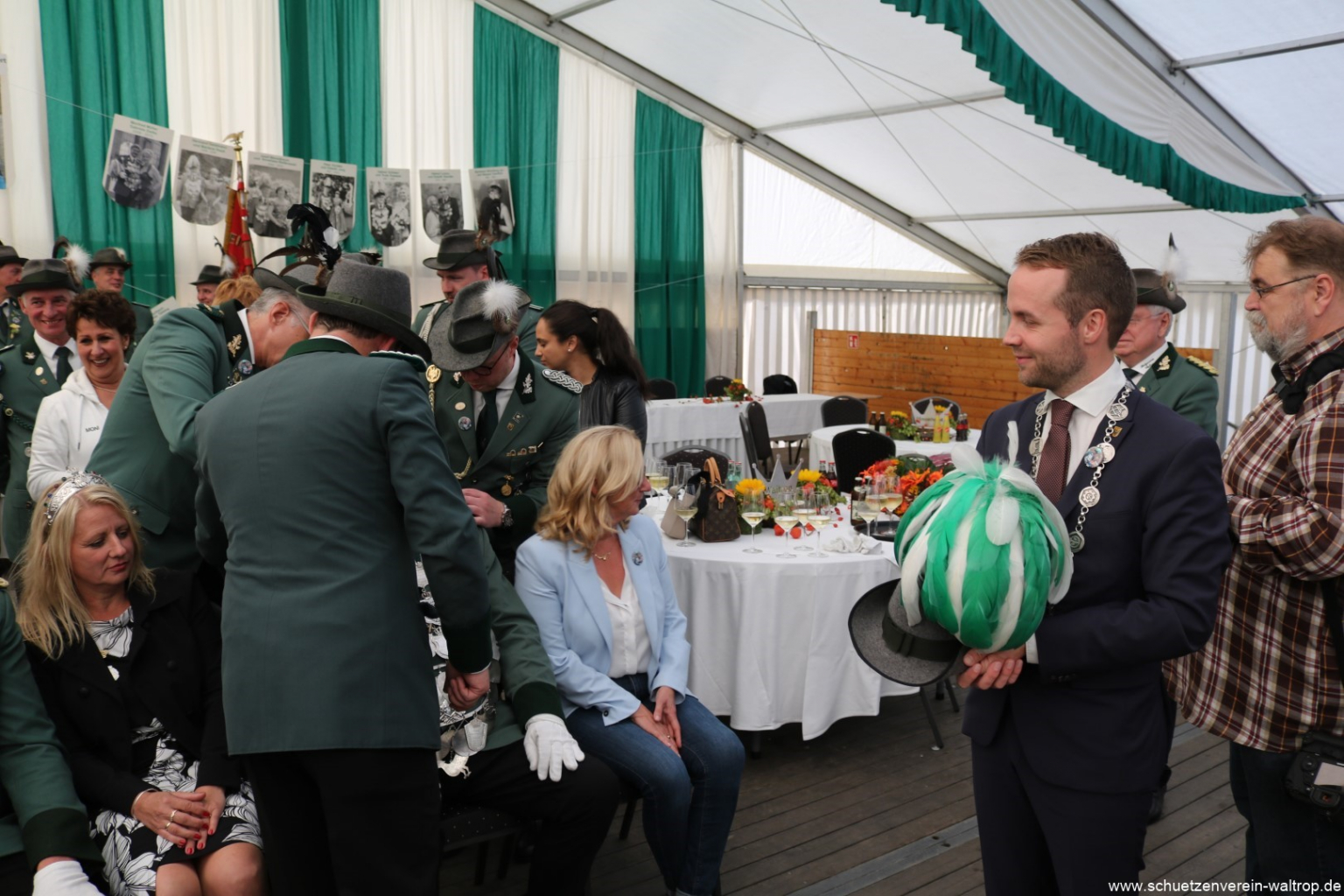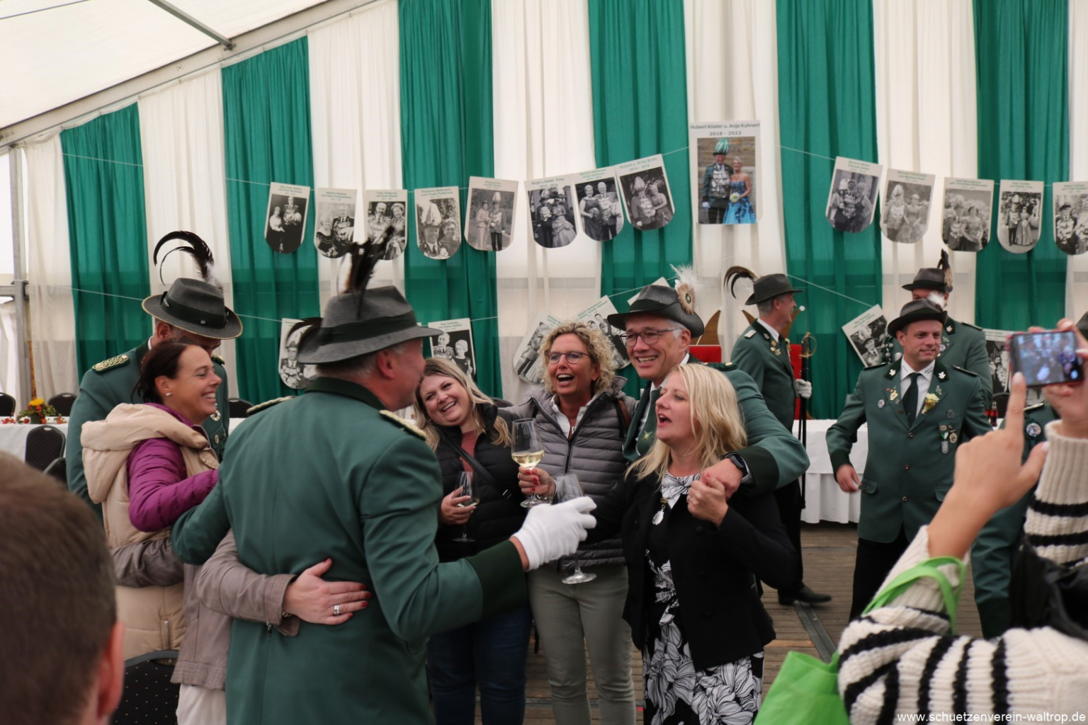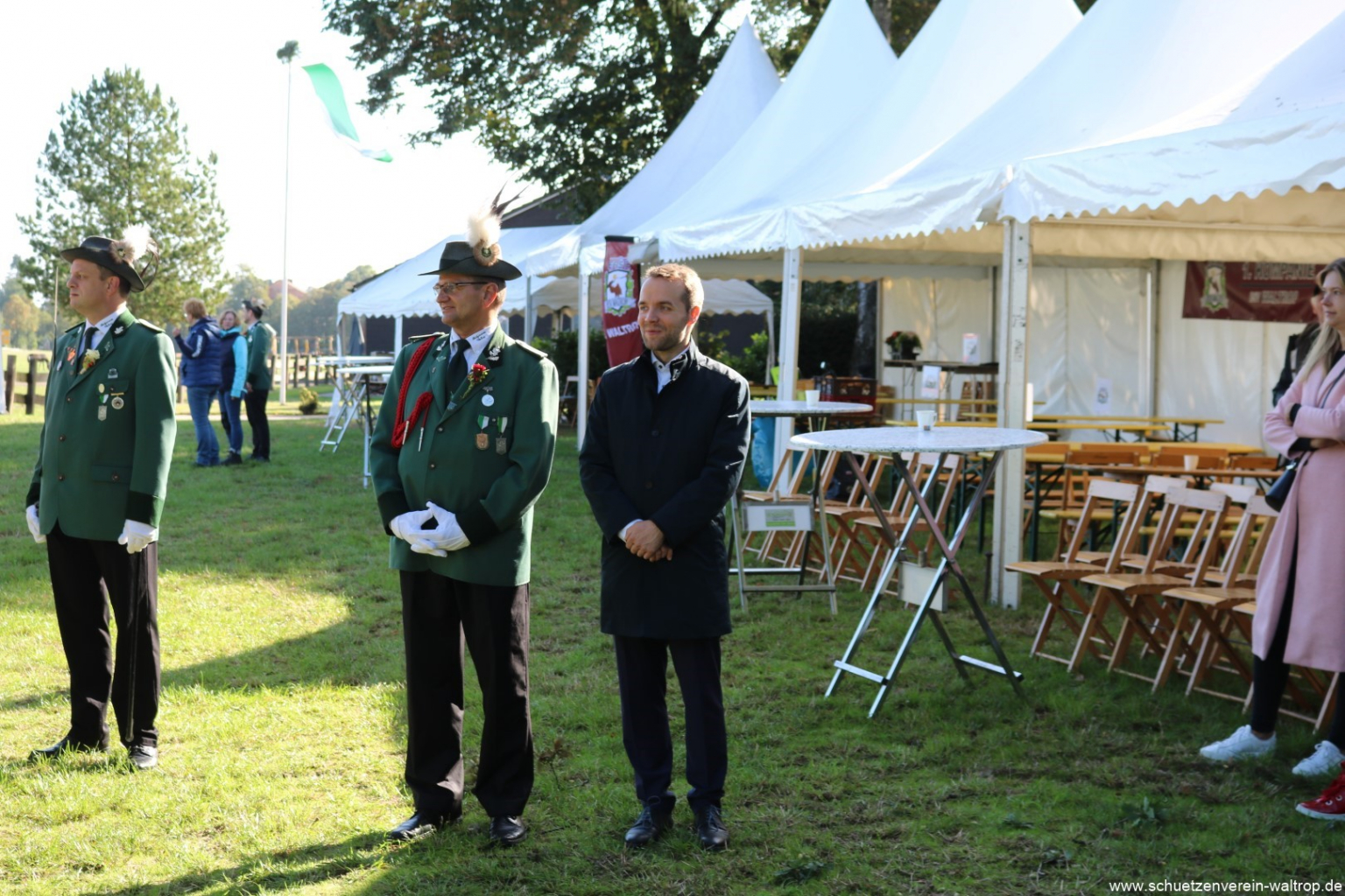 Beim Schießen um die Königswürde waren am Schluss noch zwei ernsthafte Anwärter im Rennen: Ludger Grothus und Karsten Pilger. In einem spannenden Schießen landete Ludger dabei den entscheidenden Schuss und holte den Vogel von der Stange. Zusammen mit seiner Frau Claudia regieren beide nun als Ludger I. und Claudia I.! Die Krönung im Festzelt erfolgte anschließend durch Bürgermeister Marcel Mittelbach.