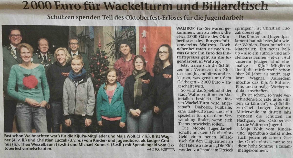 2000€ für die Jugendarbeit in Waltrop kamen durch das Oktoberfest 2016 zusammen.