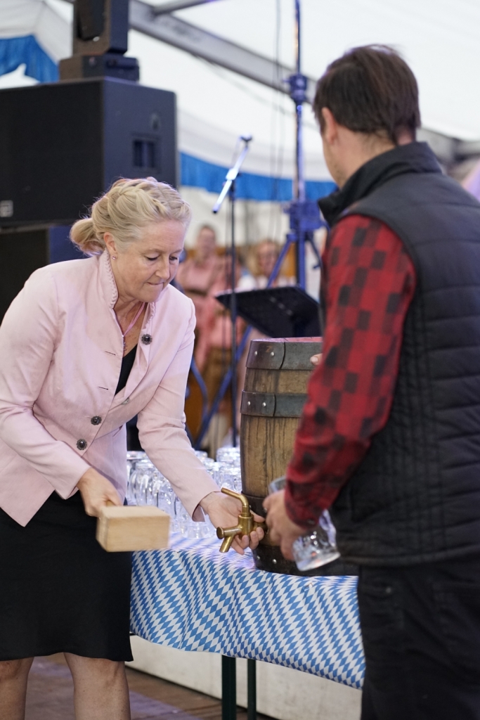 Das Zelt war gefüllt mit vielen Besuchern in bayrischer Tracht, die von Beginn an viel Spaß hatten. Für das passende Flair sorgte neben blau-weißer Deko und bayrischem Bier in Maßkrügen auch wieder eine Liveband. In diesem Jahr waren die "Zwiebeltreter" verpflichtet worden, die in früheren Jahren bereits schon einmal für Stimmung auf unserem Oktoberfest sorgten. Bürgermeisterin Nicole Moenikes nahm wieder den traditionellen Fassanstich vor.