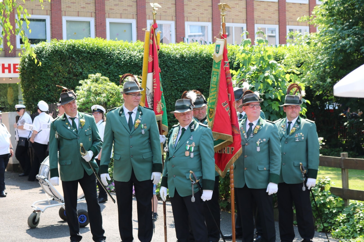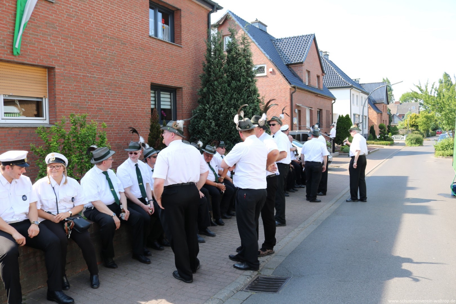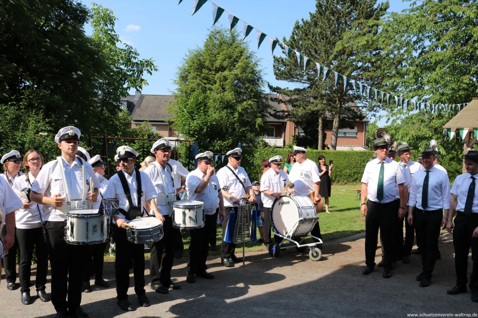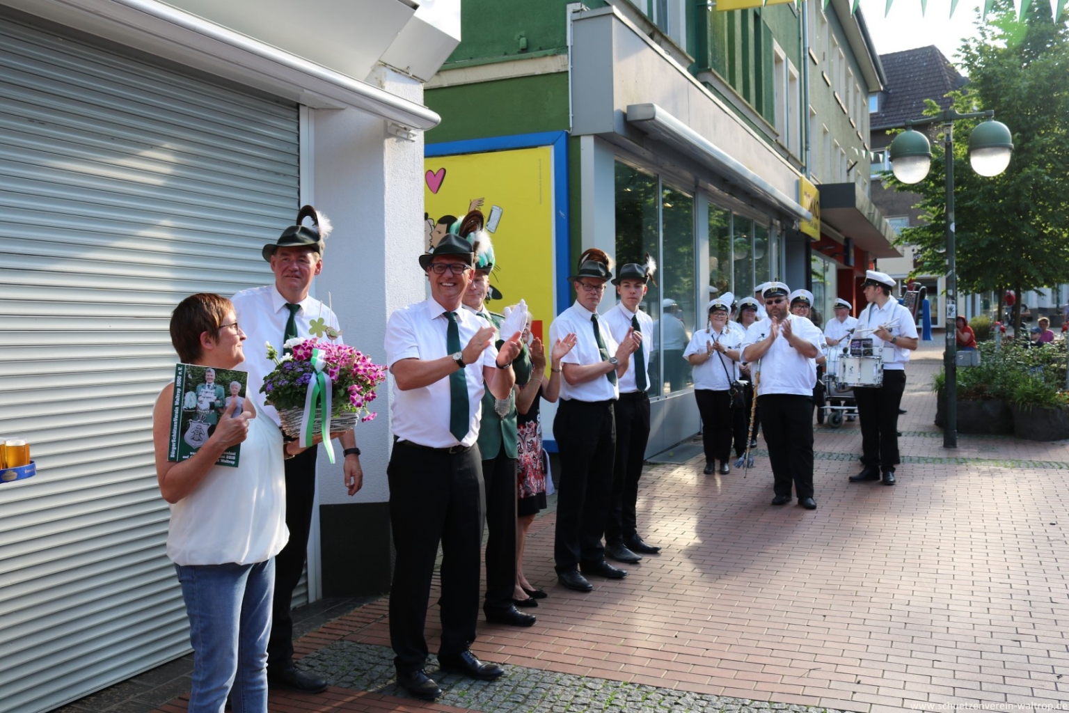 Angeführt vom Tambourkorps Seeadler führte uns der Weg durch die Innenstadt und über die Fußgängerbrücke Richtung Brüggemann. Bevor wir unseren Vogelbauer ansteuerten, gab es allerdings noch einen Zwischenstopp. Auf der Knappenstraße hatten uns die Familien Klaus und Andrea Sroka, sowie Edgar und Andrea Schürck zu einer kleinen Rast samt Erfrischung eingeladen.