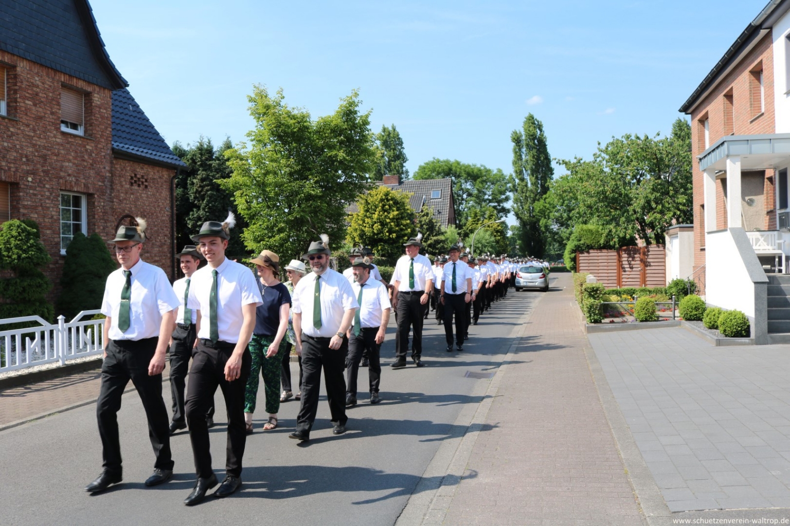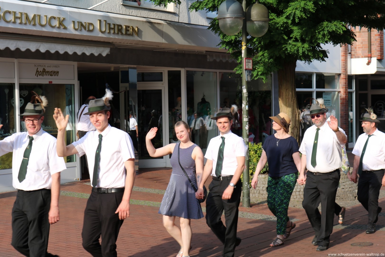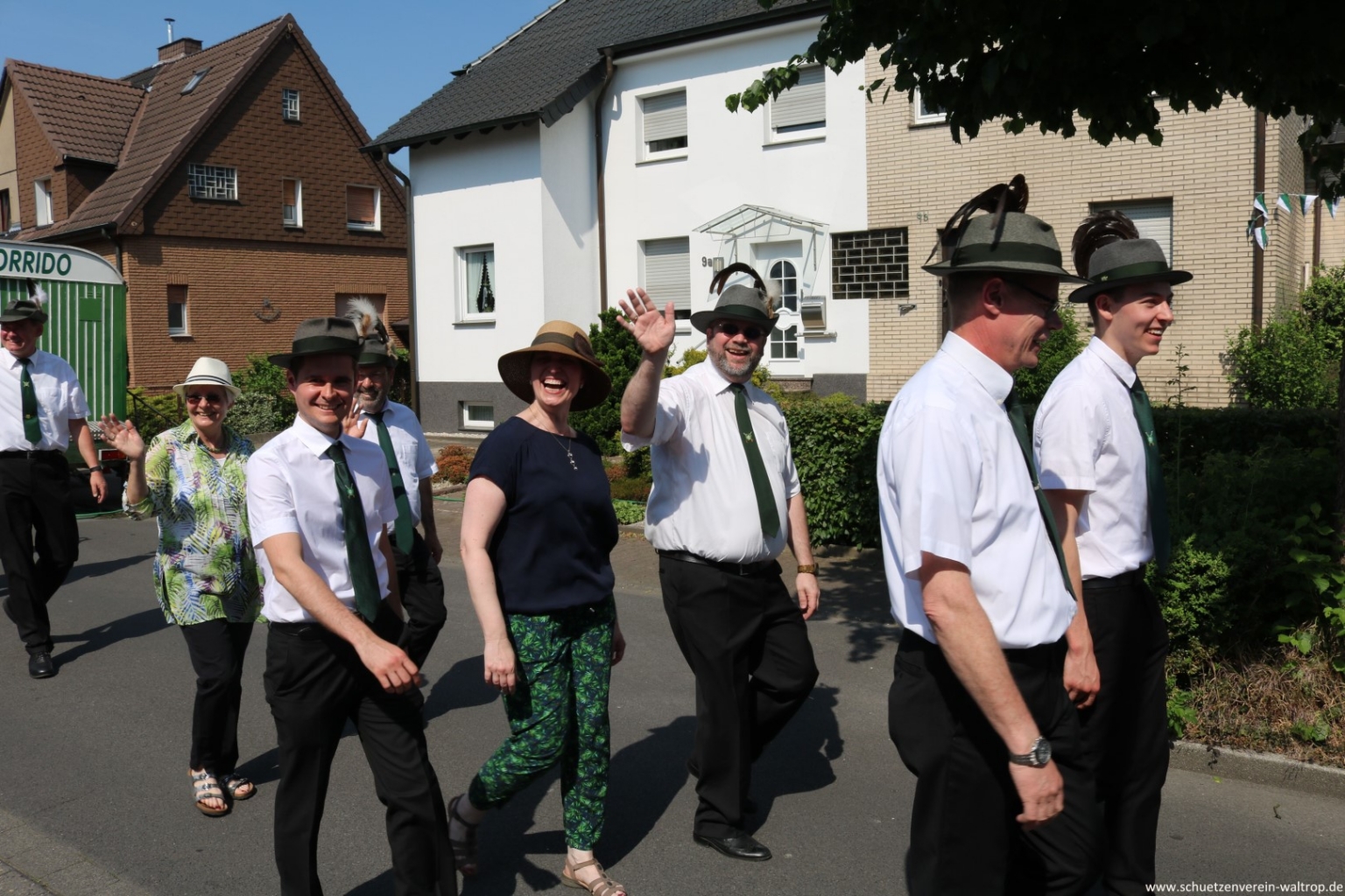 Angeführt vom Tambourkorps Seeadler führte uns der Weg durch die Innenstadt und über die Fußgängerbrücke Richtung Brüggemann. Bevor wir unseren Vogelbauer ansteuerten, gab es allerdings noch einen Zwischenstopp. Auf der Knappenstraße hatten uns die Familien Klaus und Andrea Sroka, sowie Edgar und Andrea Schürck zu einer kleinen Rast samt Erfrischung eingeladen.