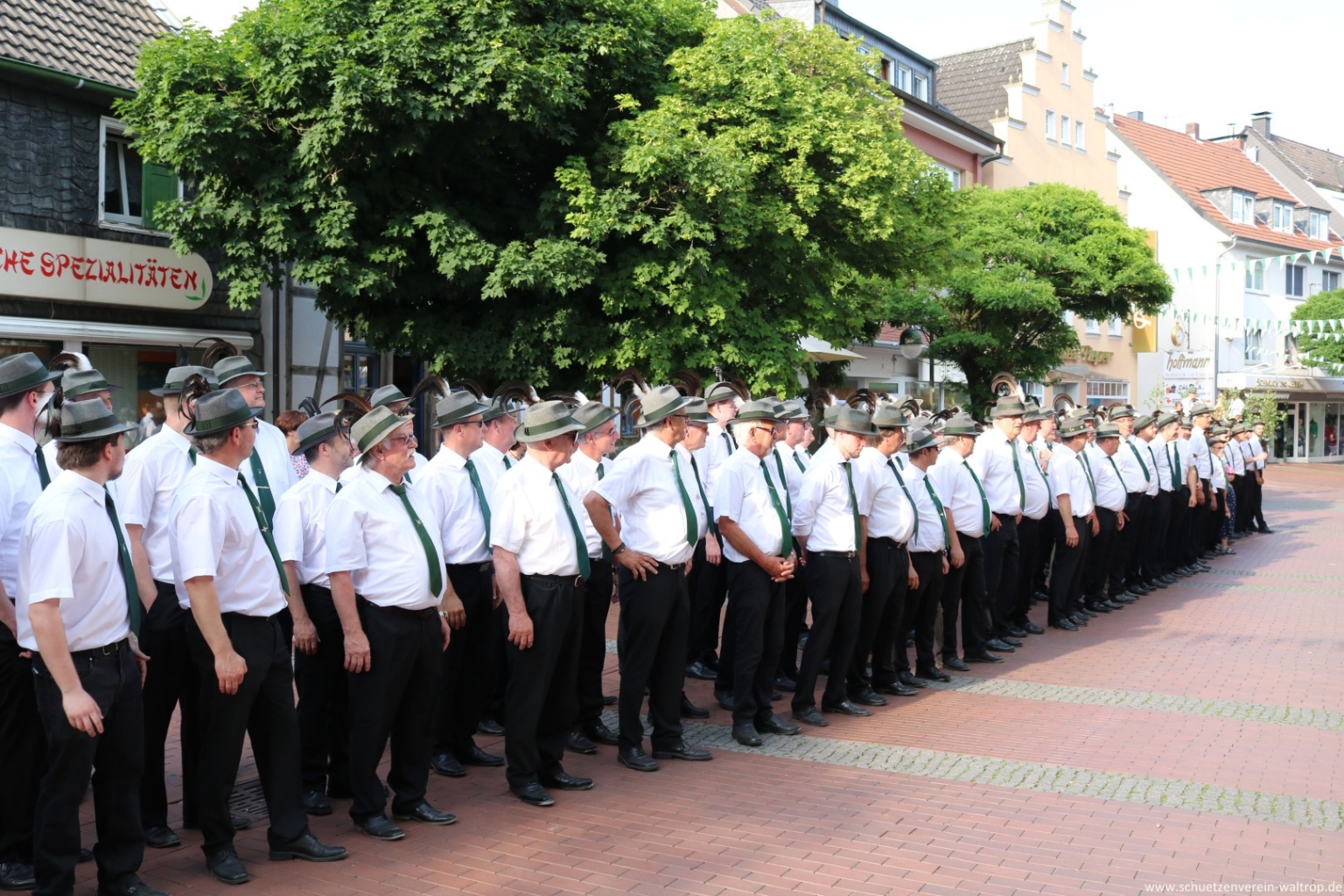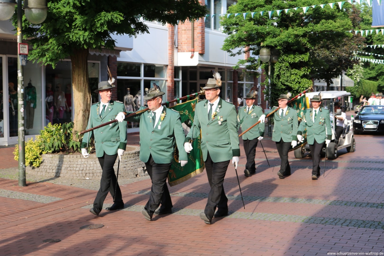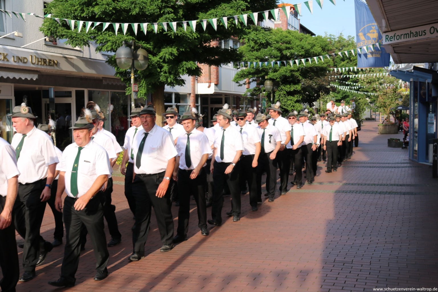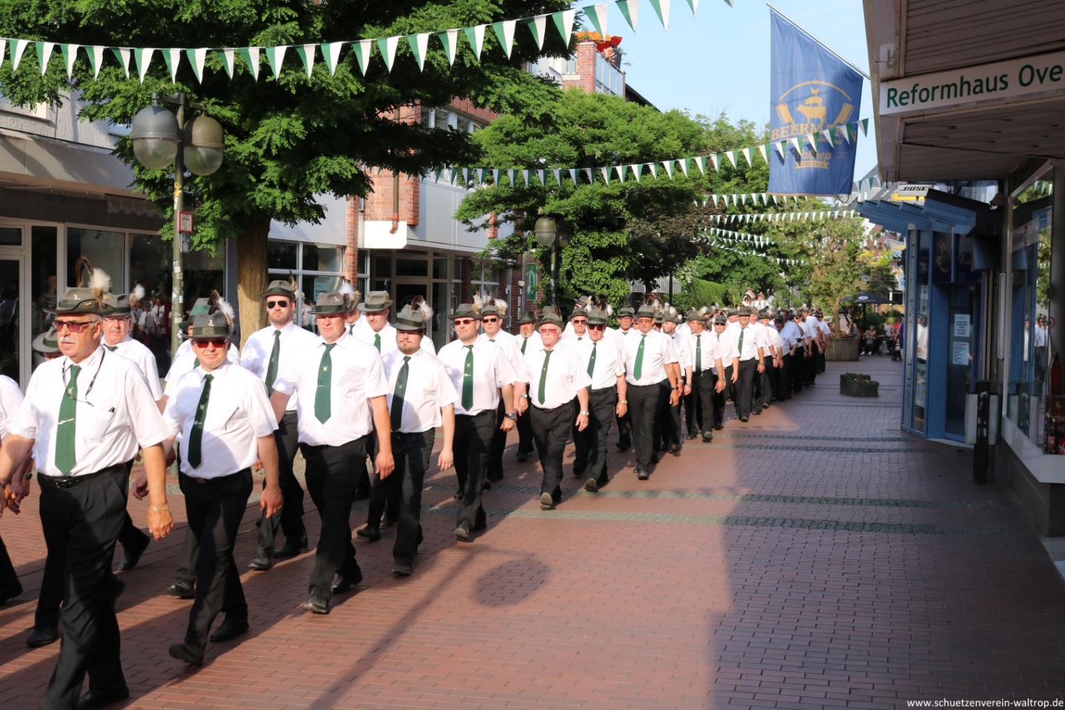 Angeführt vom Tambourkorps Seeadler führte uns der Weg durch die Innenstadt und über die Fußgängerbrücke Richtung Brüggemann. Bevor wir unseren Vogelbauer ansteuerten, gab es allerdings noch einen Zwischenstopp. Auf der Knappenstraße hatten uns die Familien Klaus und Andrea Sroka, sowie Edgar und Andrea Schürck zu einer kleinen Rast samt Erfrischung eingeladen.