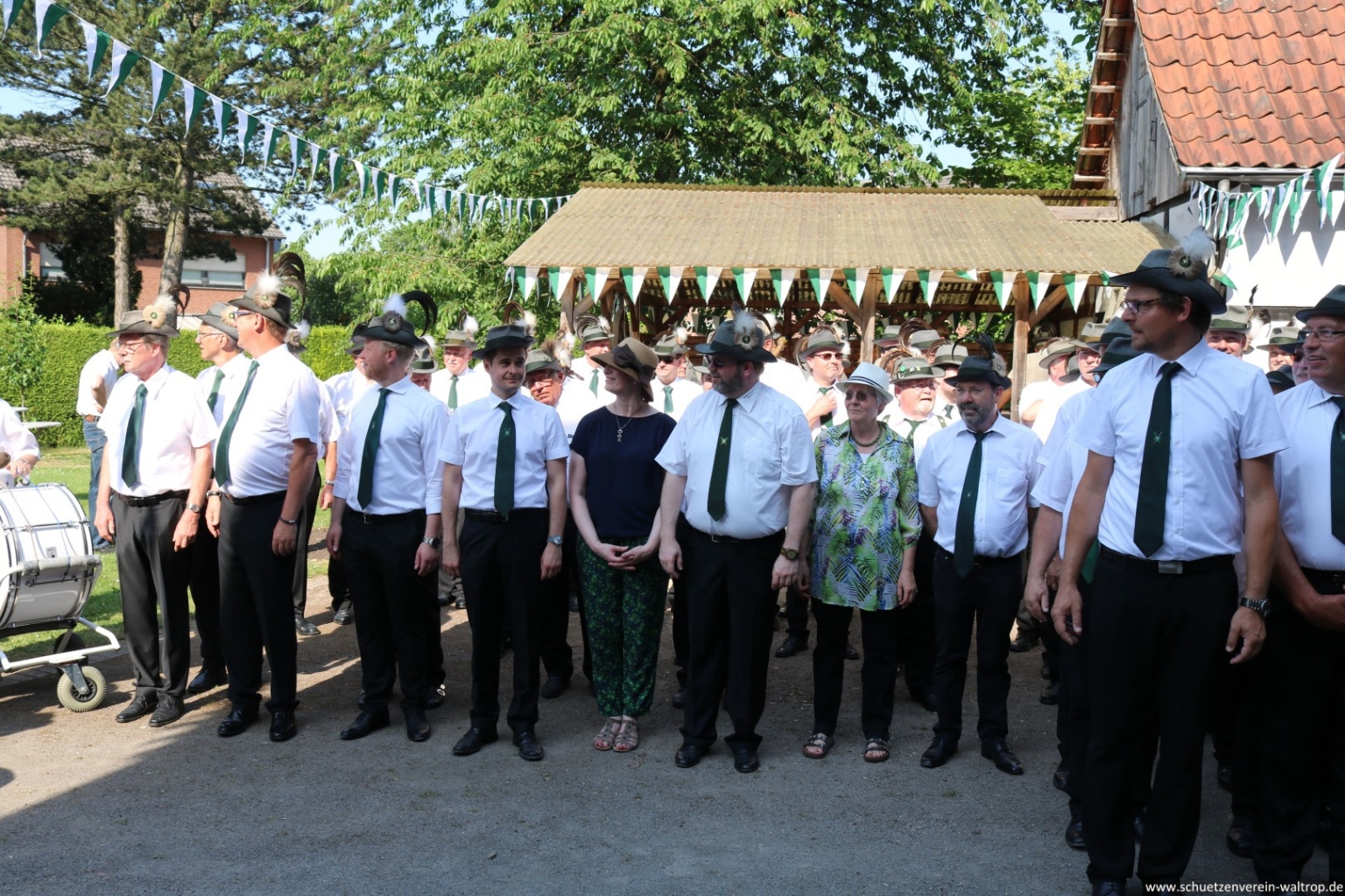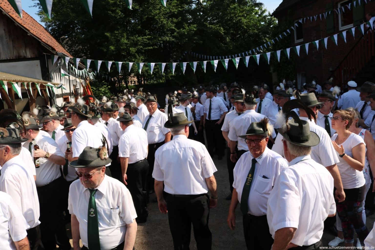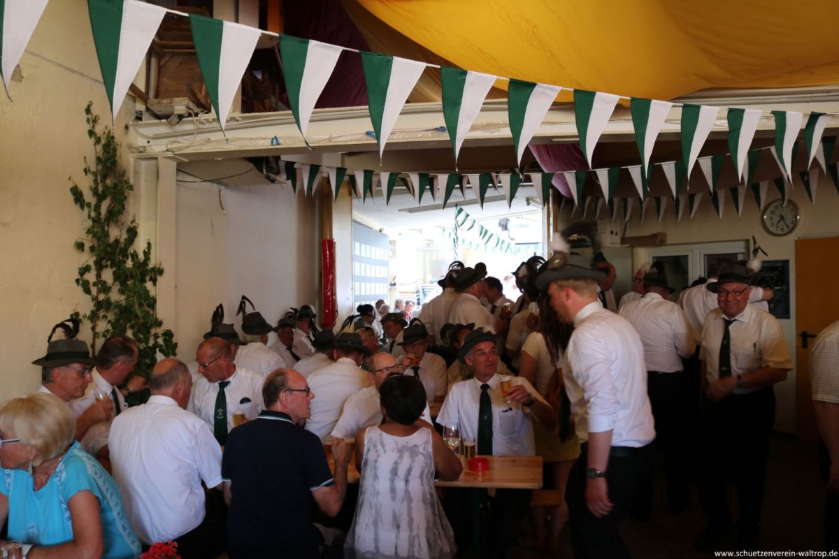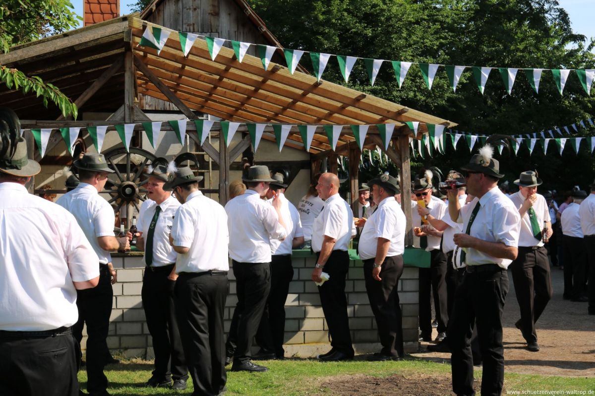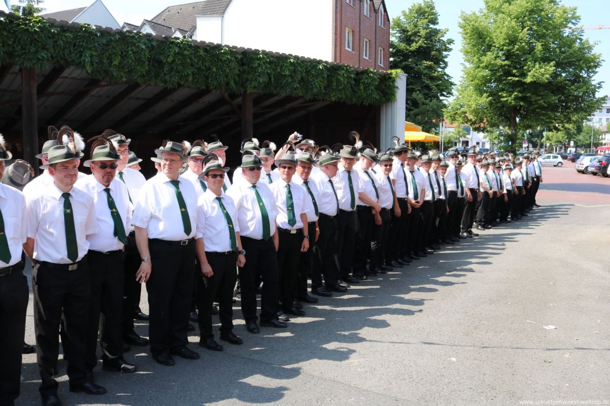 Zuvor traten wir gegen 15:30 Uhr jedoch zunächst sehr zahlreich auf dem Hof der Familie Bröggelhoff an. Über 160 Schützen samt Königspaar und Hofstaat waren angetreten, um den Schützenvogel bei bestem Wetter von Erbauer Hubert Brüggemann abzuholen. Durchaus froh waren die meisten Beteiligten darüber, dass Oberst Matthias Brüggemann sich am Abend zuvor noch die Wettervorhersage ansah und darauf hin anordnete: Die Jacke darf zuhause bleiben, Marscherleichterung!