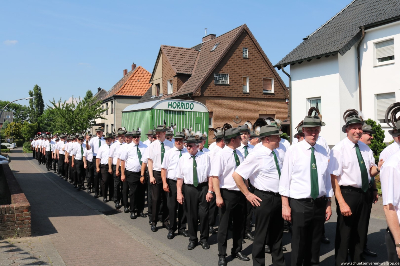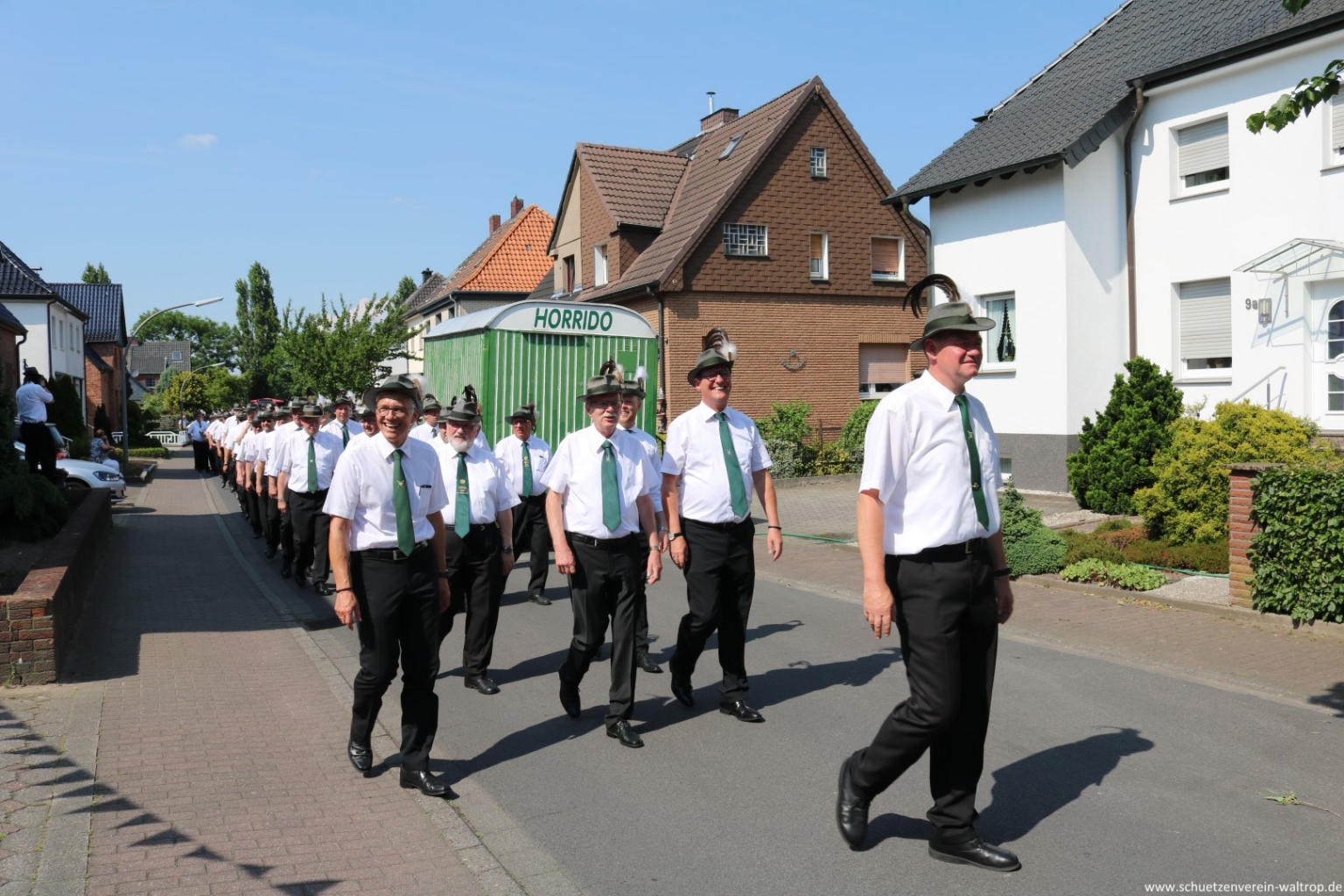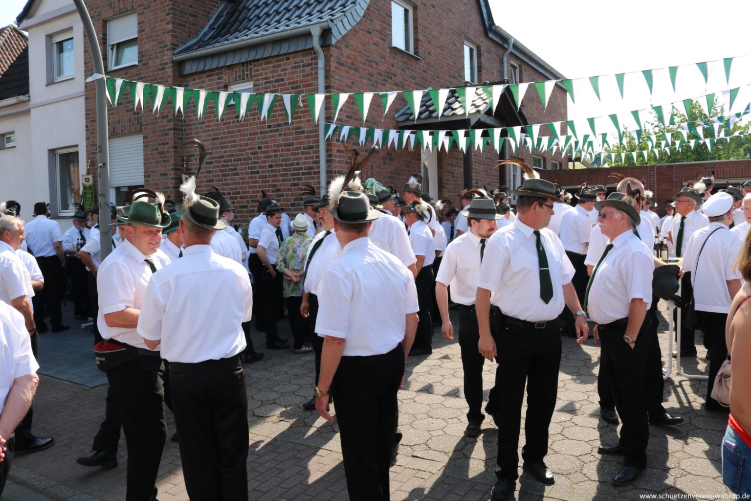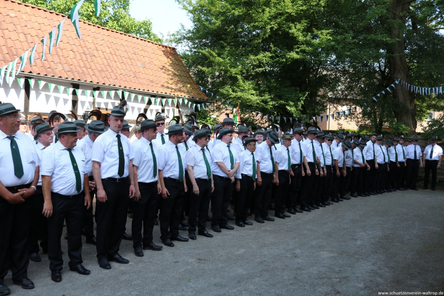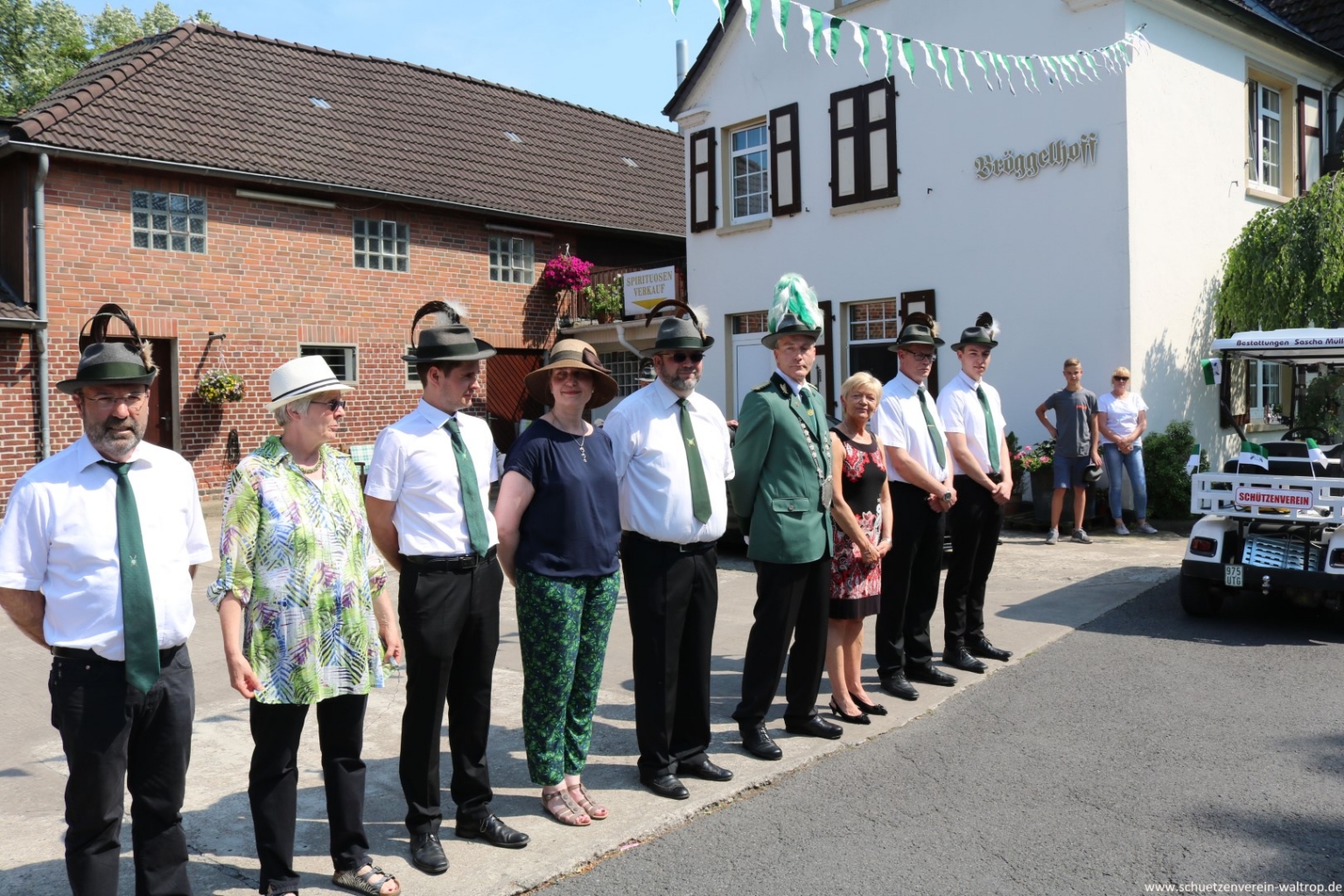 Zuvor traten wir gegen 15:30 Uhr jedoch zunächst sehr zahlreich auf dem Hof der Familie Bröggelhoff an. Über 160 Schützen samt Königspaar und Hofstaat waren angetreten, um den Schützenvogel bei bestem Wetter von Erbauer Hubert Brüggemann abzuholen. Durchaus froh waren die meisten Beteiligten darüber, dass Oberst Matthias Brüggemann sich am Abend zuvor noch die Wettervorhersage ansah und darauf hin anordnete: Die Jacke darf zuhause bleiben, Marscherleichterung!