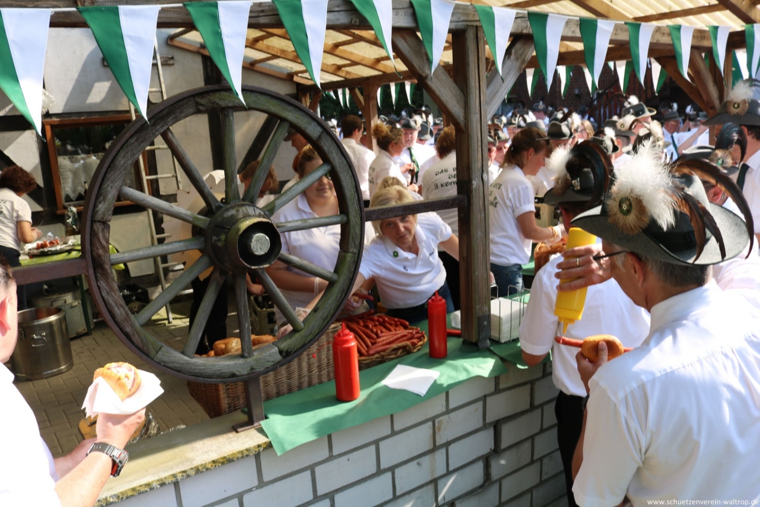 Angekommen auf dem Hof Brüggemann stand eine etwas längere Pause auf dem Programm. Die Damen der 3. Kompanie standen schon bereit und verteilten im Akkord Getränke und warme Fleischwurst im Brötchen oder Mettwürste an die Schützen. Wenn auch Tradition, aber lange keine Selbstverständlichkeit. Daher gilt auch hier ein herzlicher Dank an unser Königspaar Winfried und Elisabeth und natürlich an die gesamten Helfer und Helferinnen der Dritten für die tolle Verpflegung während des Aufenthaltes!
