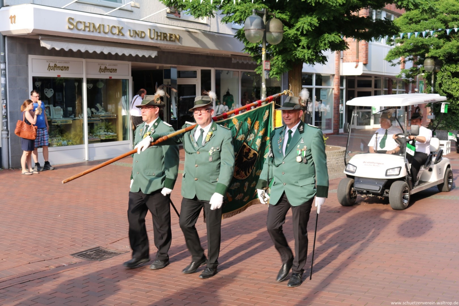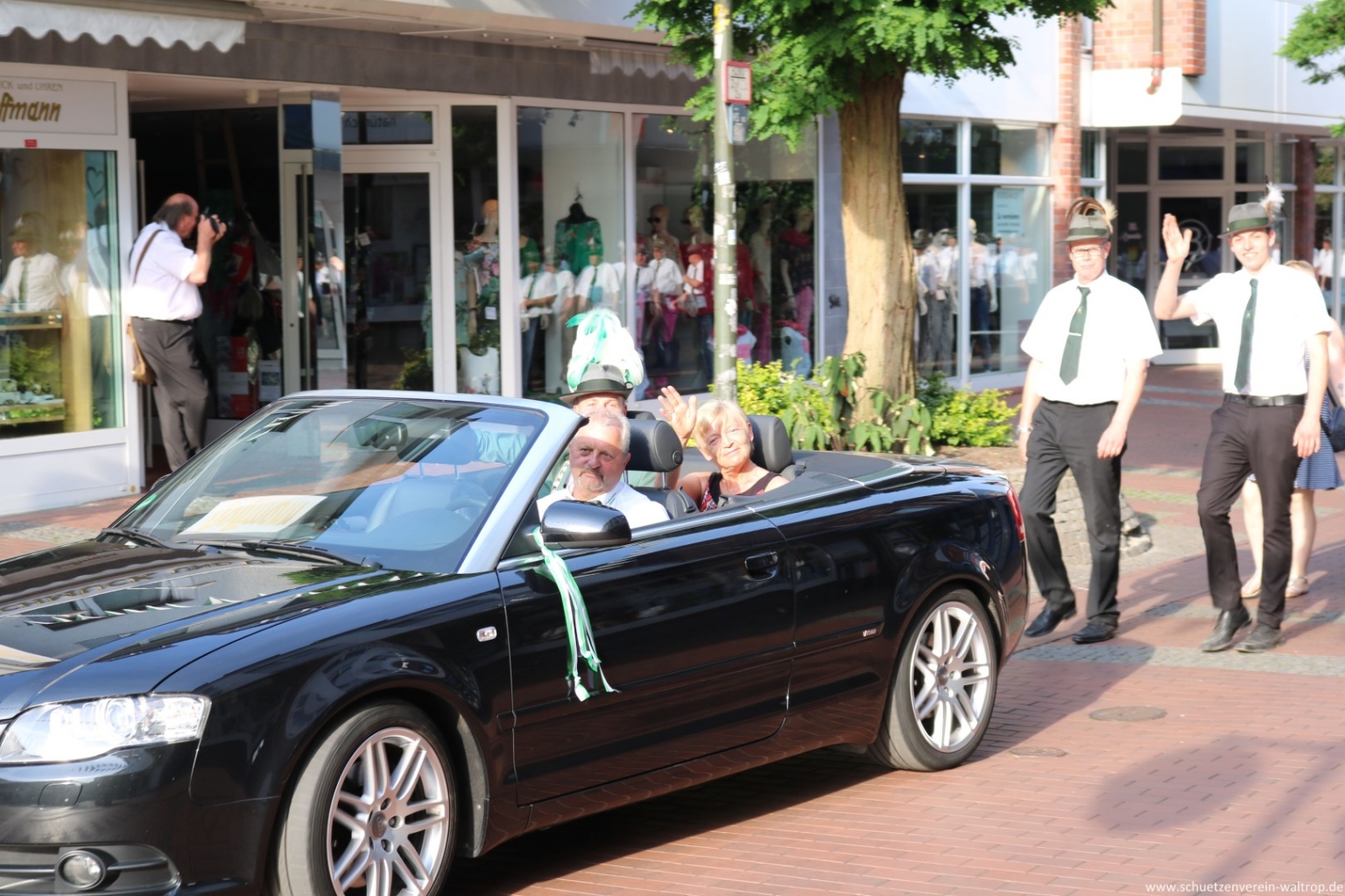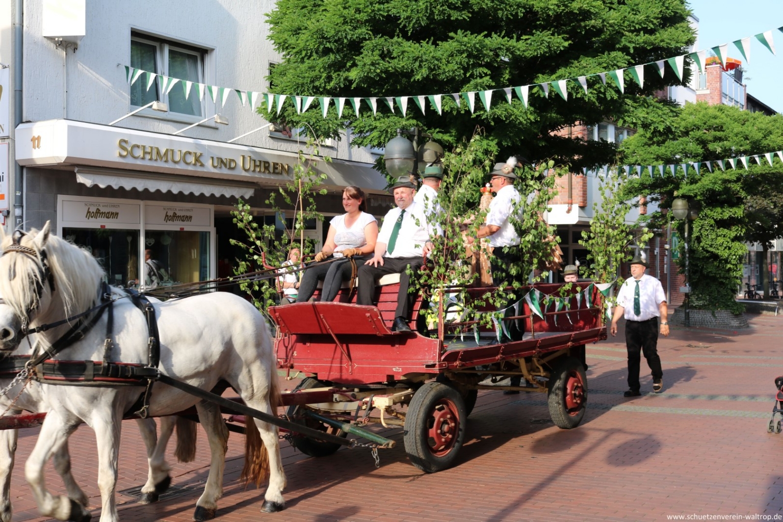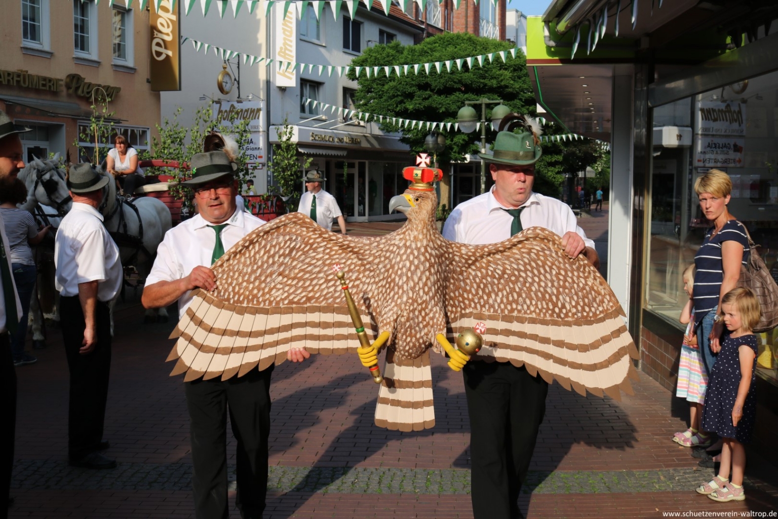 Unter den Augen von allen Schützen und vielen versammelten Zuschauern wurde der Vogel von der Kutsche ins Schaufenster getragen und dort sicher angebracht. Hier hat unser Schützenvogel nun seine letzte Station gefunden, bevor er am Schützenfest-Samstag auf der Vogelstange zum Abschuss feigegeben wird.