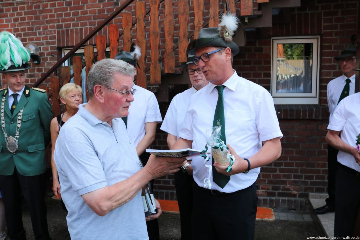 Nach Begrüßung durch unseren Vorsitzenden Ludger und kurzen Ansprachen von Oberst, General und König, bedankte sich Ludger im Namen des gesamten Schützenvereins bei Familie Bröggelhoff für die Erlaubnis zur Nutzug ihres Hofes zum Antreten. Aus den Händen von Ludger gab es neben Blumen auch noch druckfrisch die Festzeitung zu unserem Schützenfest.