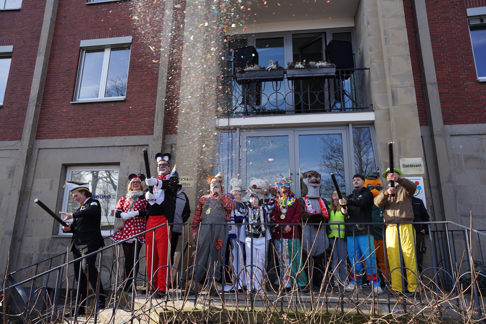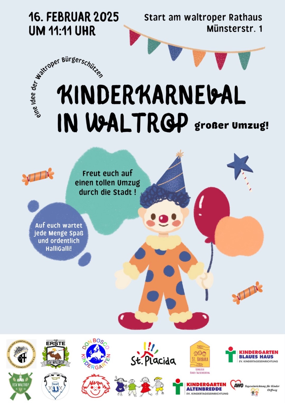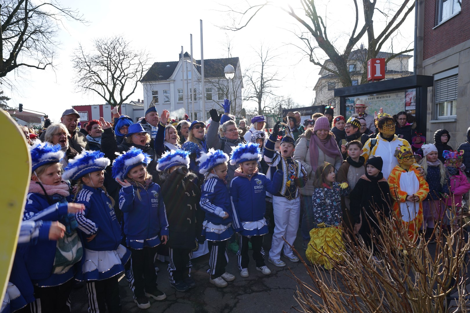 Der zentrale Treffpunkt lag am Waltroper Rathaus. Zahlreiche Kindergärten haben sich mit bunten Bollerwagen und lustigen Kostümen dorthin auf den Weg gemacht um unseren Bürgermeister Marcel Mittelbach dem lustigen Jeckenzug optisch anzupassen.