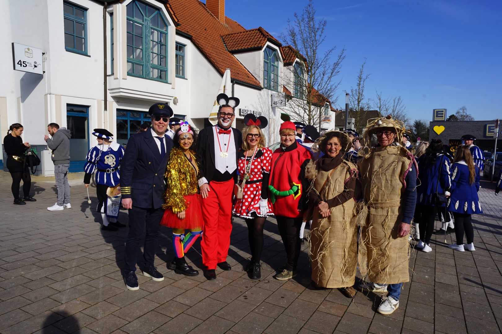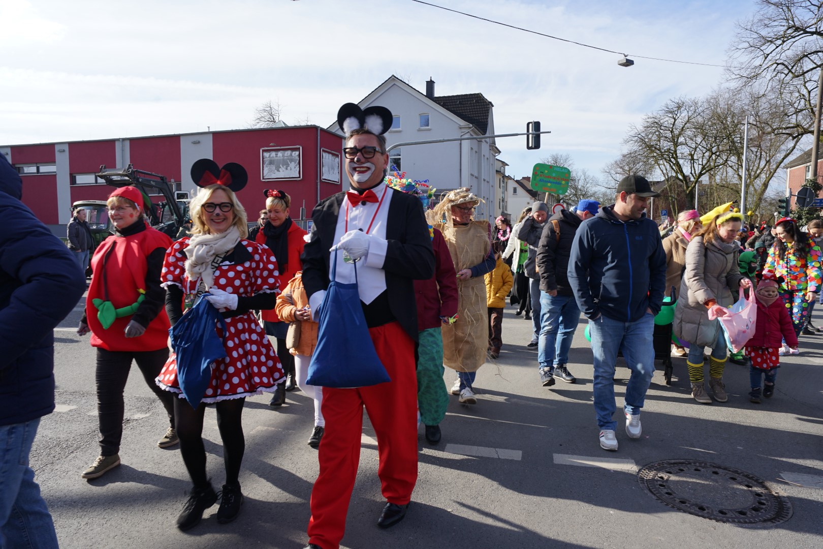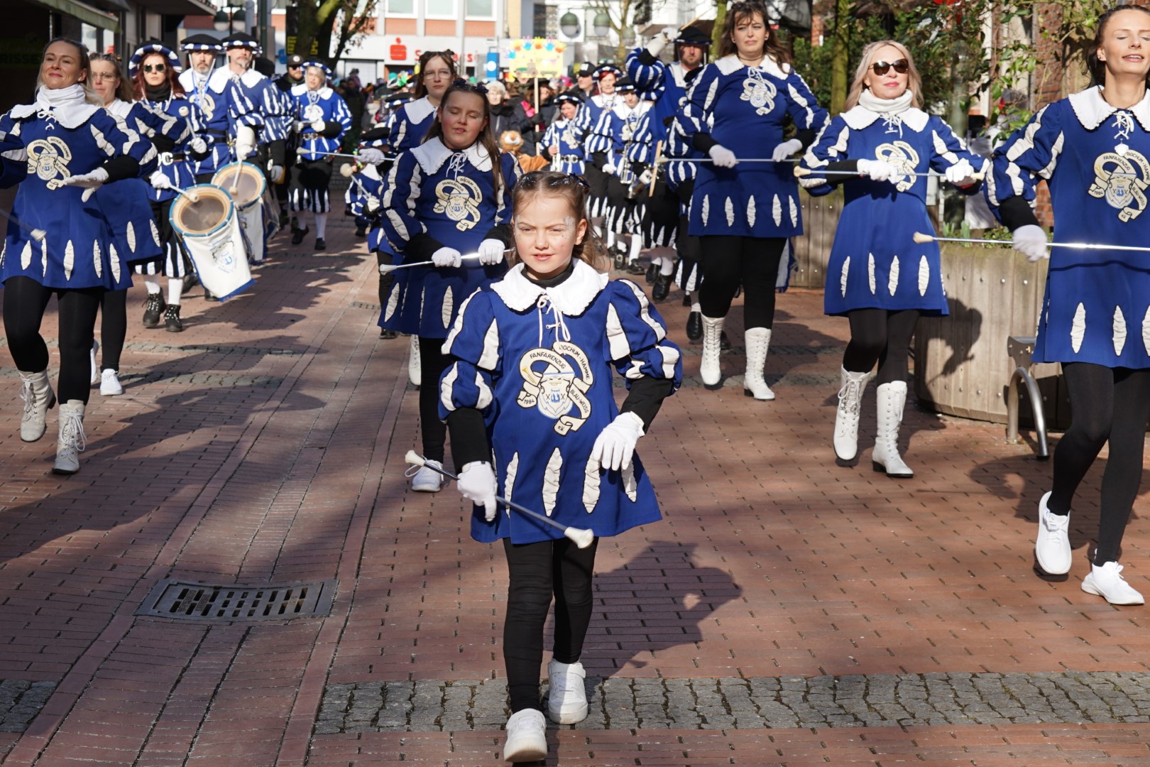 Fleißige Kinderhände haben für Marcel ein komplettes närrisches Outfit zusammengestellt, sodass sich dann nach einer kurzen Eröffnungsrede des BM sowie Konfettiregen abgefeuert durch das Königspaar sowie vom Hauptmann Dirk Lehnhardt und vom Vorsitzenden des Dattelner Karnevalvereins John Aravantinos, sich der Jeckenzug unter musikalischer Führung des Fanfarenzugs Blau-Weiß Bochum Hamme 1984 e. V in Bewegung setzte. Gefolgt von zahlreichen bunt gekleideten Kindergartengruppen, dem Kinderprinzenpaar des KG Blau Weiß am Stimberg e. V., Luisa I. u. Matteo I. nebst Minigarde, dem Dattelner Karnevalsverein e. V. mit den Tanzgruppen und natürlich der Bürgermeister mit dem Königspaar des BSV Waltrop und ihrem Hofstaat,