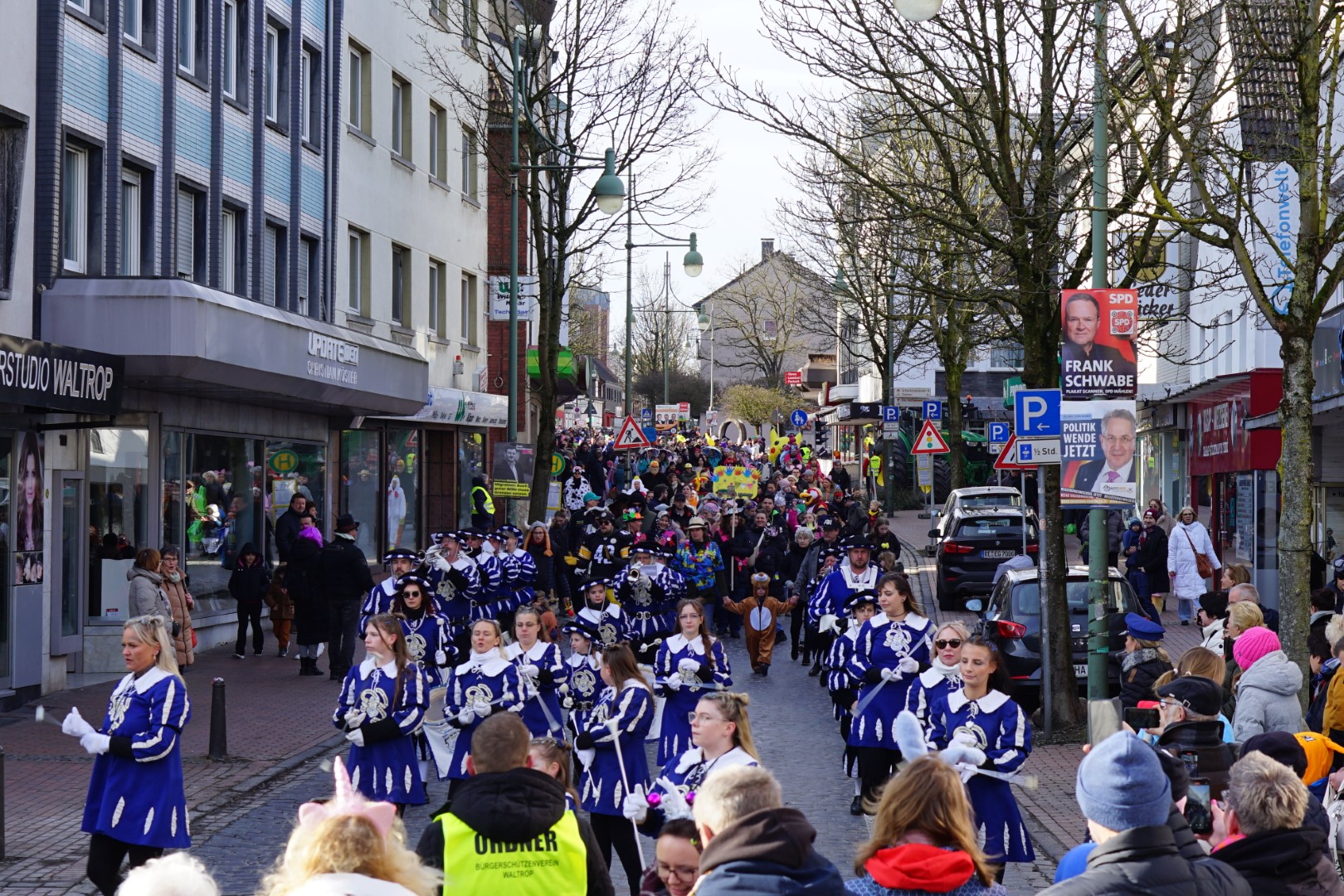 Viele, viele Menschen standen am Straßenrand und wurden mit einem frohen Helau und Jubel begrüßt. Das Königspaar verteilte ordentlich Kamelle. Der Weg des Jeckenzug ging sehr gut gesichert durch viele Trecker der Waltroper Landwirte - zusätzlich waren zahlreiche Ordner und das Rote Kreuz vor Ort.